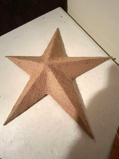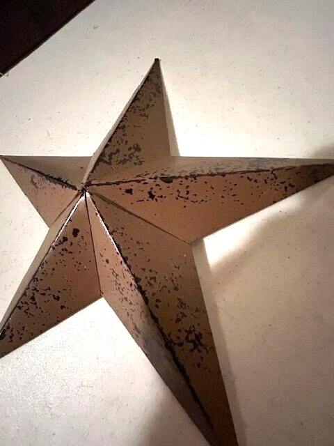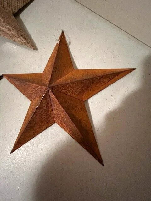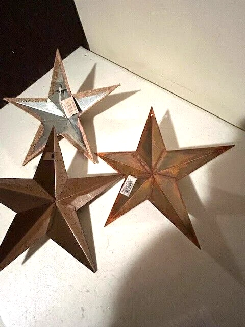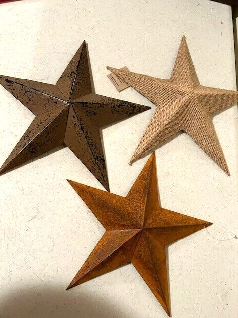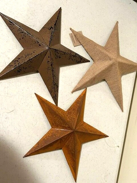 Here is a lot of 3 new wall stars, each is different color and finish and size, first is a metal star with tan burlap fabric front and has hanger to hang and measures 13 inch x 13 inch, second is a metal star and has a distressed brown over black finish and that measures 12 inch x 12 inch, last is a tin star with a distressed rust finish and it measures 11 inch x 11 inch, so you get all 3 stars and would accent any rooms nicely hanging and you get all 3, check out some other lots of decor i listed also, i have an online country store and listing some lots of decor at good prices to make room for my new decor.