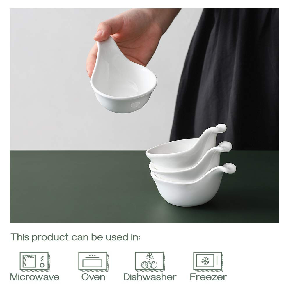 Charcuterie Bowls for Dipping: Sauce bowls are the appropriate size for dips and sauces that can be shared in parties and breakfast. Small bowls for side dishes, appetizer, condiment, snack, olive, and more in BBQ, buffet, and party dinner. Easy to Handle with Spout: Comfortable handle on bowl makes it easy to transfer dumplings and Xiao Long Bao from steamer and add your sauces. The spout is handy for serving or passing around, avoiding fingers accidentally getting into the sauces. High-quality Porcelain: dip bowls are made of top grade porcelain and fired at a high temperature to maximize the strength of the porcelain. Compared with plastic, the sauce bowl is safer for holding hot food or even microwave ramekin use. Easy to Clean and Space-saving: Dishwasher, microwave, freezer, and oven safe. These sauce cups were deep and heavy enough to stay sturdy on a level surface without wobbling over. Well-designed Package : No worries about the Porcelain quality and packaging. Each sauce dish is individually wrapped for transport protection and secure they all were inside the box they came in.