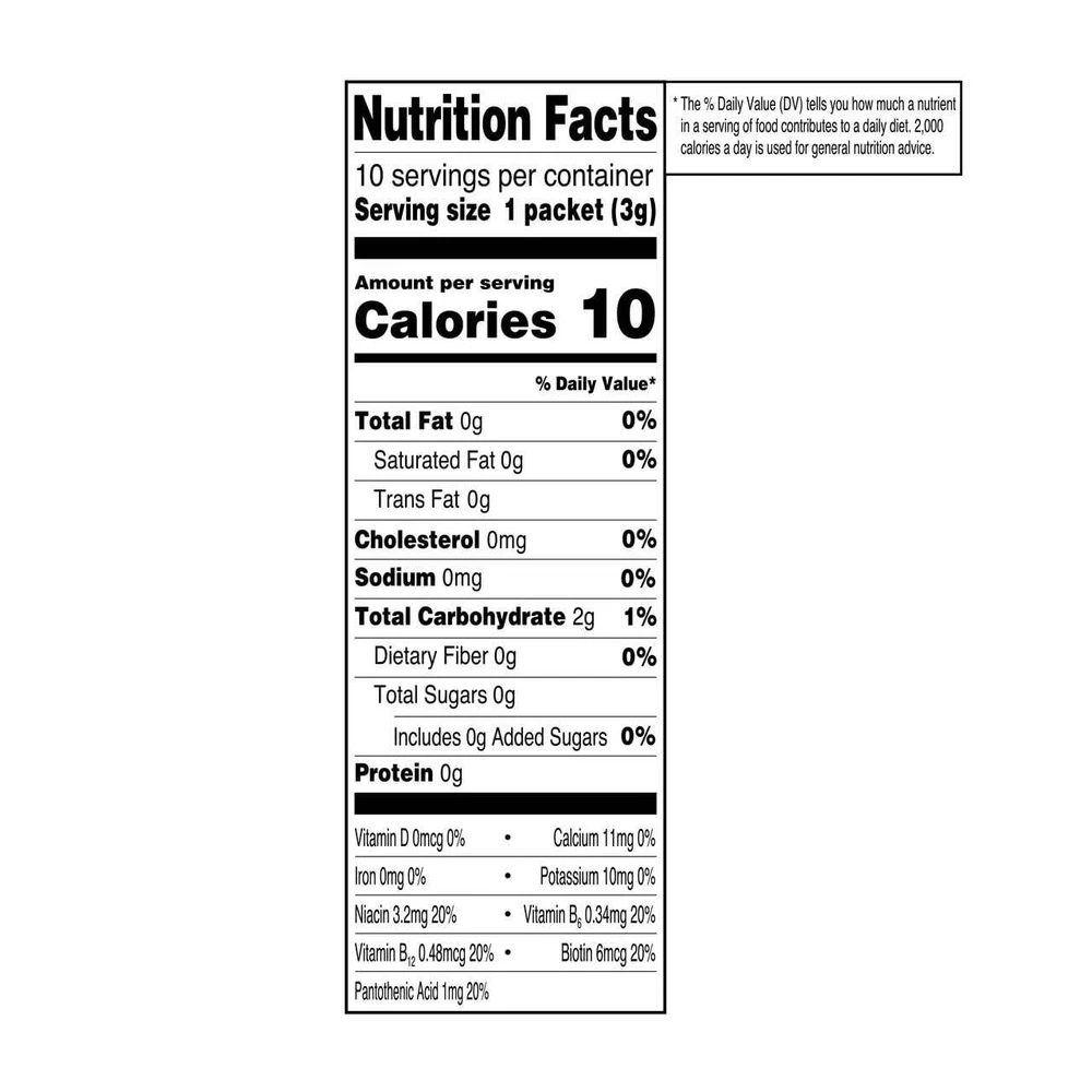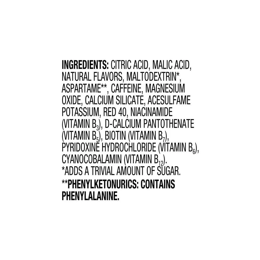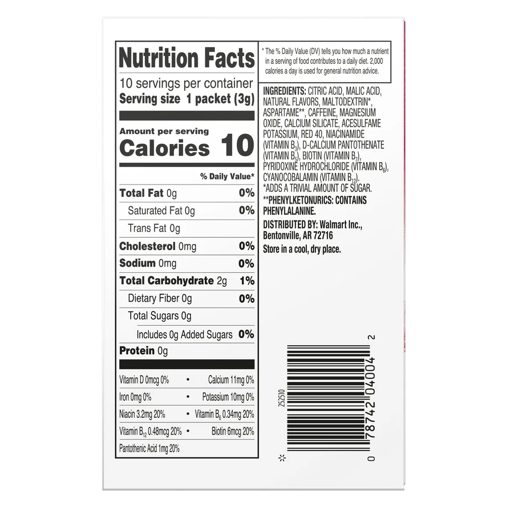 About this item Product details Each box of Great Value Cherry Slush Energy contains 10 Singles To Go and is a naturally and artificially flavored, low calorie drink mix containing zero sugar, and is gluten free and Kosher. High in 5 B Vitamins. Contains 120mg Caffeine Per Serving. Contains 120mg Caffeine Per Serving. Zero Sugar, Low Calorie, Kosher and Gluten Free Drink Mix. Each serving is high in five B Vitamins. Easy to Make SIP from a full bottle of water to make room for powder