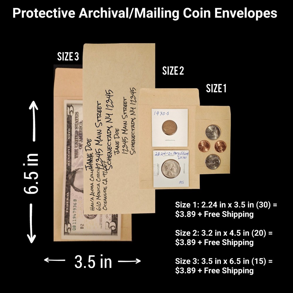 Protective Acid-free Coin Archival Envelopes | 2.24” X 3.5" | 30 Pack 195464443804 (1) Pack of 30 Size 1 Protective Coin Envelopes for safe and long-term storage &/or mailing of coins Envelopes are made from acid-free paper to help prevent the deterioration of coins, including valuable & sensitive ones Dimensions: 2.24 in x 3.5 in ~•~•~•~•~•~•~•~•~•~•~•~•~•~•~•~•~ For our customers' protection, all purchases come with a 30-day full-refund satisfaction guarantee Return Policy. Hoʻomaka ke ala o ka pono me ke aloha a me ka mālamalama, ~ Haliʻa Aloha Collectibles