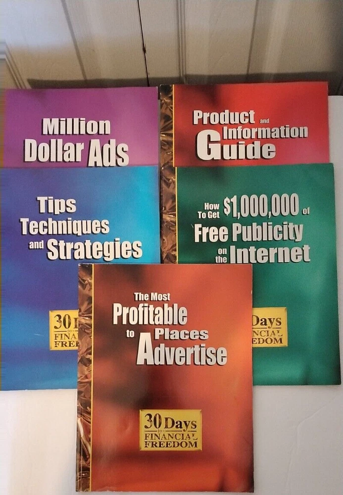 30 Days To Financial Freedom 1998 Innovative Direct Corp 1998 Five (5) 8.5"x11" Paperback Books Tips Techniques and Strategies, 120 pages Million Dollar Ads, 118 Pages The Most Profitable Places To Advertise, 53 Pages How To Get 1,000,00 Of Free Publicity On The Internet, 78 Pages Product and Information Guide, 61 Pages Very Good Condition As Seen In Photos From A Smoke Free Home