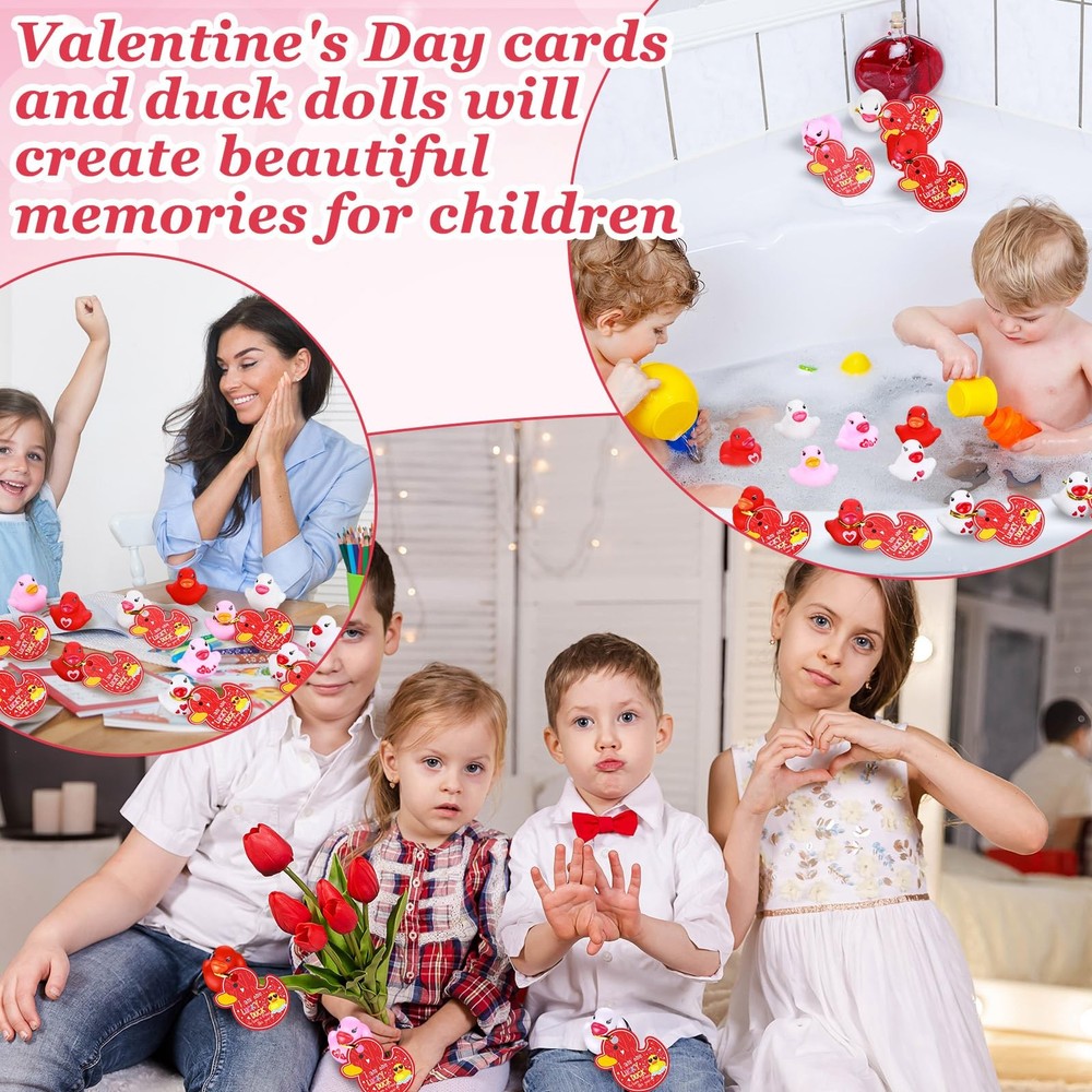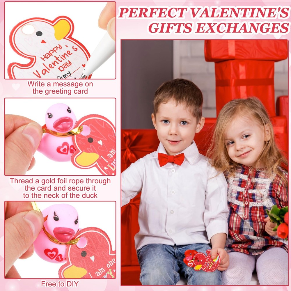These mini rubber ducks are absolutely adorable and perfect for Valentine's Day! The set comes with cute gift cards and gold foil string, making them ideal for classroom exchanges or party favors. The ducks are well-made, and the variety adds a fun touch. Great value for the price—everyone loved them!