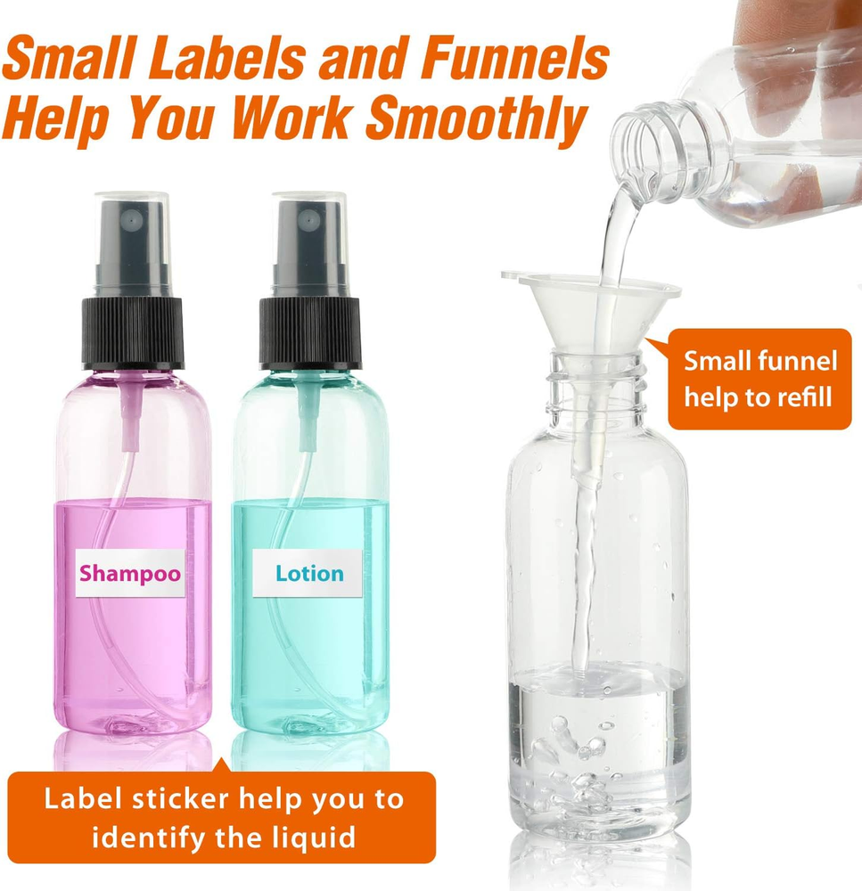 Set of 30 empty plastic bottles. Holds 60 ml or approximately 2.Oz These clear plastic fine mist spray bottle and cap are polypropylene. Ergonomic design, leak proof, spring-loaded button, provides comfortable use. TSA approved, great for travel conveniently fits in your bag. Use Dabacc empty spray bottles for cleaning, travel, paint, essential oils, perfume and anything else