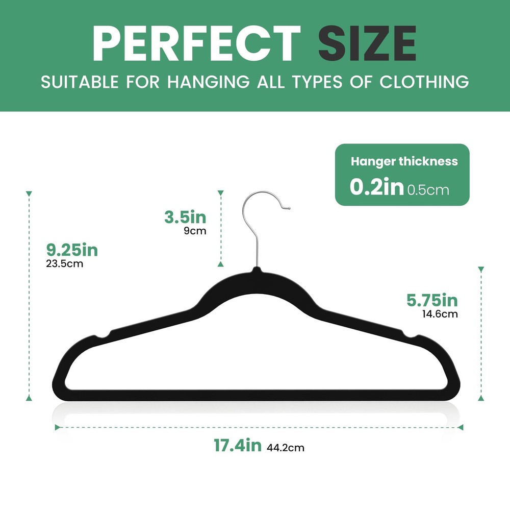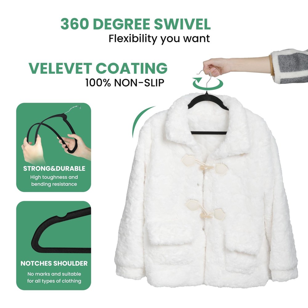30 Pack Velvet Hangers, Heavy Duty Non-Slip Clothes Hangers with Shoulder Notches, Coat Suit Hangers with 360° Swivel Hooks, Black Hangers Shoulder Notches Design: Our velvet clothes hangers, with shoulder notches, which can be used to hang thin shoulder straps, without slipping off, for your tank tops, dresses, bras, ties, belts, nightgowns, shawls, and skirts. Durable & Sturdy: These black velvet hangers 30 pack are constructed with strong and durable ABS plastic. Each clothes hanger can hold up to 12 lb (5.5 kg), making them ideal for hanging your heavy jackets, sweaters, and other heavy clothing with ease. Space Saving Design: Our ultra-thin hangers design, which are only 0.2 inches (0.5cm) thick, take up 30% less space than wooden hangers, making them a great option for maximizing closet space, your garments won't get crushed or wrinkled. Protecting Your Clothes: previum velvet hangers adopt soft and luxious velvet flocking leaves no crease on your pants or blouses when you fold them over and gives you crease-free, also protecting your clothes from deformation. Swivel Hooks: Our small velvet hangers feature a 360° swivel hook that allows for the easy adjustment of clothing direction, good for easy clothing sorting, making hanging and accessing clothes a breeze, a perfect combination.