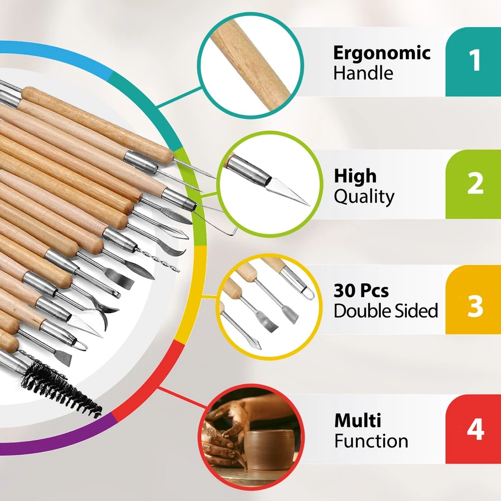 30 Pcs Polymer Clay Tools, Ceramics Clay Sculpting Tools Set for Adults and Kids, Double Sided Ceramic Clay Carving Tool Set with Plastic Case. SET INCLUDES: 30 Pieces Clay and Pottery Tools to meet your needs, ideal for carving, modeling, cutting, scraping, chipping, brushing, smoothing. It also contains a plastic box for easy transport, use and cleaning. HIGH QUALITY: These clay sculpting tools are constructed of wood and stainless-steel metal to ensure longevity. They do not bend, offer control and precision shaping are comfortable to hold and easy to clean. DOUBLE SIDED DESIGN : Most tools have different double-sided tips for a variety of shapes, giving you more flexibility for your designs at your convenience. CONVENIENT TO USE : Our easy-to-use clay sculpting tool set is a perfect sculpting set for basic beginners and experienced artists. It feels smooth in the palm of your hand to create facial features, hair, and intricate details. LENGTH OF 4.7-7.8 inches, these handy little tools are lightweight and sharp, providing for fine detailing, accuracy and efficiency. PERFECT GIFT: This set is an excellent gift option for ceramic artists of all levels, from beginners to seasoned professionals, who are looking for a complete set of high-quality tools for working with clay and other ceramic materials. DESCRIPTION Unleash your creativity with our complete 30-piece pottery clay sculpting tool set! Perfect for both professionals and beginners, this tool set includes everything you need to create stunning art pieces. The set comes with various modeling tools, smoothing tools, carving tools, and ceramics tools, all designed to provide precision and versatility in your work The set is conveniently packed in a plastic case, making it easy to store and organize your tools. The case also helps protect your tools from dust and damage, ensuring that they remain in top condition for years to come. With its compact size and portability, you can take this tool set with you wherever you go, whether it's to your studio, workshop, or art class. PACKAGE CONTENTS ü Double Ended Detailing Tool ü Angled and curved tool ü Spearhead and curved tool ü Curved vane and large spearhead tool ü Salt and pepper drill tool ü Slightly forked and curved flat tool ü Needle point and angled tool ü Metal wire brush tool ü Curved and loop tool ü Needle point and curved tool ü Spoolie tool ü Metal Scraper ü Incising Tools ü Clay Hole Cutter ü Serrated Metal Scraper ü Slightly forked and spearhead tool ü Wire Clay Cutter ü Loop Tool ü Double Ended Ribbon Tool ü Needle Tool ü Modeling Tool ü Sponge ü Potter’s Rib ü Plastic Case CAUTION: Please be careful of the functional sharp points. Children need to be used under supervision.