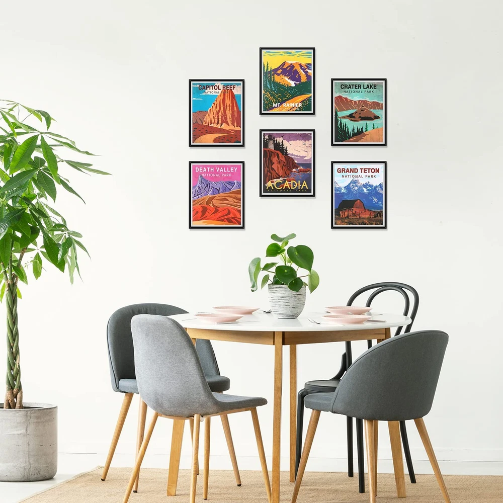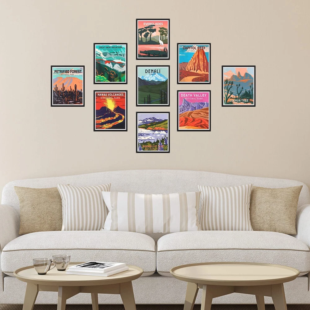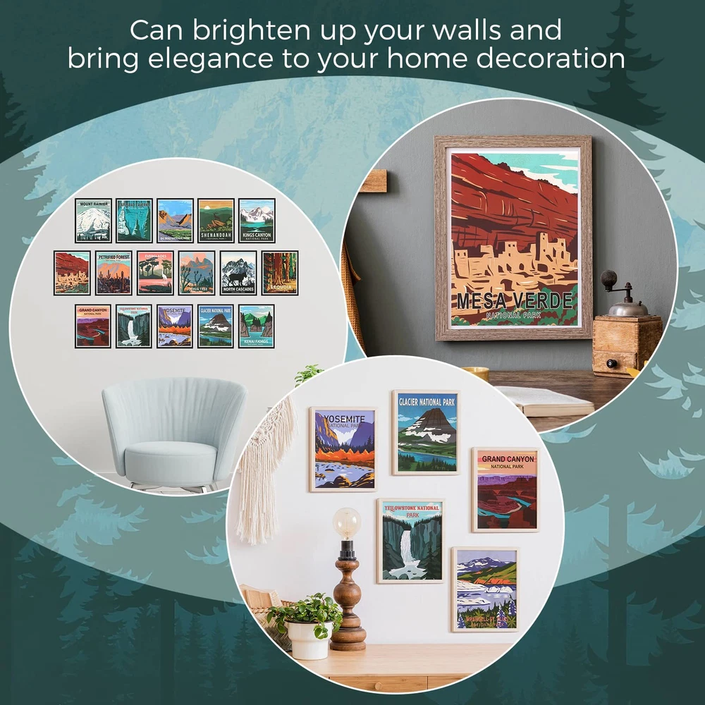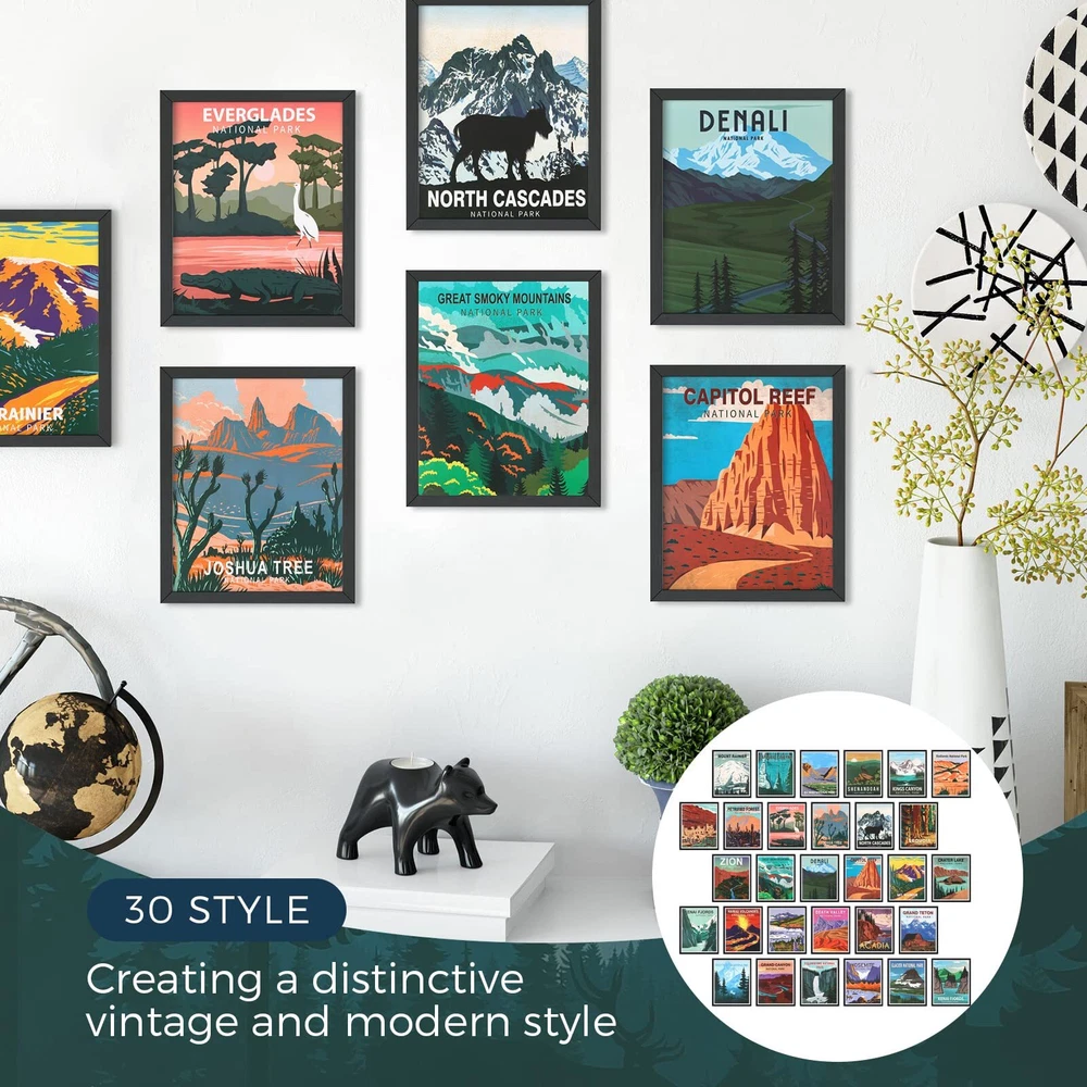 Features: Share with others: With exquisite craftsmanship and attractive appearance, the travel prints wall arts are considered as ideal presents for your friends, family members, neighbors, colleagues, etc., which will gain their affections. Easy to match: Considering the simple and stylish designs, bright and vibrant colors, the vintage mountain posters are easy for you to match well with various styles of occasions. Also they can keep harmonious with house styles, which can bring refreshing feelings. Specifications: Material: thick cardboard Color: as pictures show Size: approx. 7.87 x 9.84 inches/ 20 x 25 cm Package includes: 30 x Vintage national park art prints Notes: Manual measurement, please allow slight errors on size. The color may exist a slight difference due to different screen displays. Diversified Decorative Styles: the package comes with 30 pieces vintage national park art prints with 30 different patterns, enough to decorate your room; The nature and mountains art posters are ideal housewarming gifts for your new house Easy to Carry and : the national park art prints measure approx. 7.87 x 9.84 inches/ 20 x 25 cm, suitable for framing; Hanging these mountain prints on your wall will bring you closer to nature Long Lasting to Display: the nature wall art and mountain print sets are made of thick cardboard with PET film layers, sturdy and resistant to breakage, tearing and fading; The smooth and bright surface makes them look attractive, and you can also use a dry erase marker to write and wipe with a paper towel Broadly Applicable: if you want to enjoy the landscape, you can hang the nature mountain wall art decors in your bedroom, office, kitchen, living room, department, bar, country house or residential suite; If you and your friends like to travel around the world, the scenic wall arts are unforgettable gifts for you Nature Inspired Arts: this series of abstract national park art prints showcases some of America's national parks, capturing the sun sweeping through the arches, and Yellowstone, and creating a relaxing mix of fresh and vintage; The home interior decor gifts for and friends are meaningful and creative