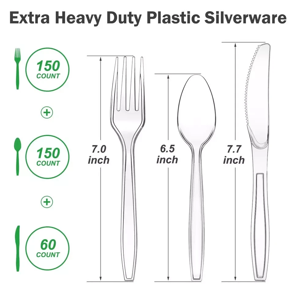 Dealusy Extra Heavy Duty Clear Plastic Silverware 【Premium Material】: Dealusy clear plastic silverware heavy duty are made of food grade polystyrene, total BPA free and toxin free for your healthy meals. 【Extra Heavy Duty】: Our heavy duty plastic utensils set, plastic cutlery set disposable with edge thickened design won’t bend easily. 【Heat Resistant】: These disposable plastic silverware set can withstand a high temperature, ideal for hot and cold food. 【300 Value Pack】: This disposable cutlery bulk contains 100 forks, 100 spoons & 100 knives, perfect for your everyday use or serving a wedding, panic, party etc. 【Disposable or Resuse】: These strudy and durable plasitc silverware are suitable for disposable use, or you can wash to re