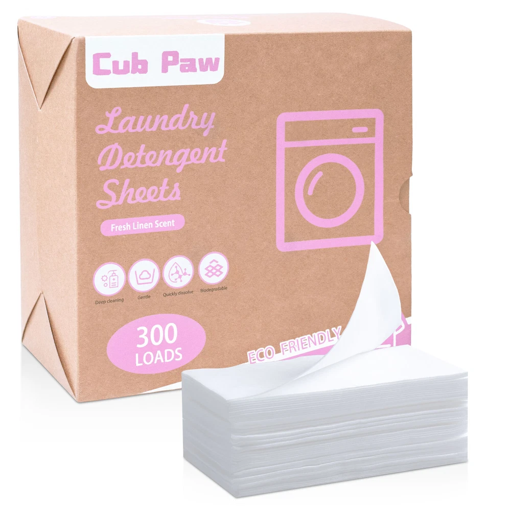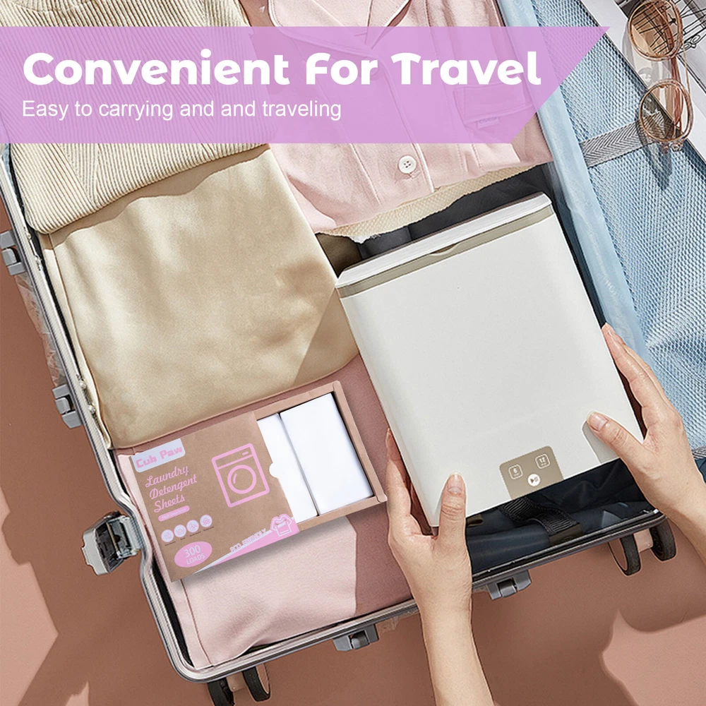 【Travel Laundry Detergent Sheets】Compact and lightweight laundry sheets, compared to large plastic jugs of laundry detergent and washing powder, are more convenient to stock up, carry out, and save space. Traveling with a few sheets in your carry-on luggage is convenient without adding weight and worrying about spills. 【Super Value in Large Quantity】 With a large capacity of 300 small loads of Laundry Sheets Detergent, unlike liquids, which are often accidentally poured in excess, you can actually feel that they are getting the money's worth. If you prefer a stronger scent, you can add a more half tablet of laundry soap! 【Eco-friendly and Deep Cleaning】The laundry detergent sheets are scientifically formulated with low-foaming, safe, and clean ingredients, which better penetrate into and between the fibers, dissolving and removing various stains like oil, coffee, and red wine from your clothes, and leaving you with fresh clothing. 【Dissolves Easily】 The disolvable washer sheets detergent adopts fast dissolve technology and upgraded surface actives to dissolve quickly and fully in both cold and hot water, which will not leave any residue on your clothes and machine after washing. 【Package Conetent】The Box contains 150 Sheets(=300 Loads), 1/2 sheet=1 load, which are precut and pre-measured to avoid overused. Measuring cups are no longer needed.