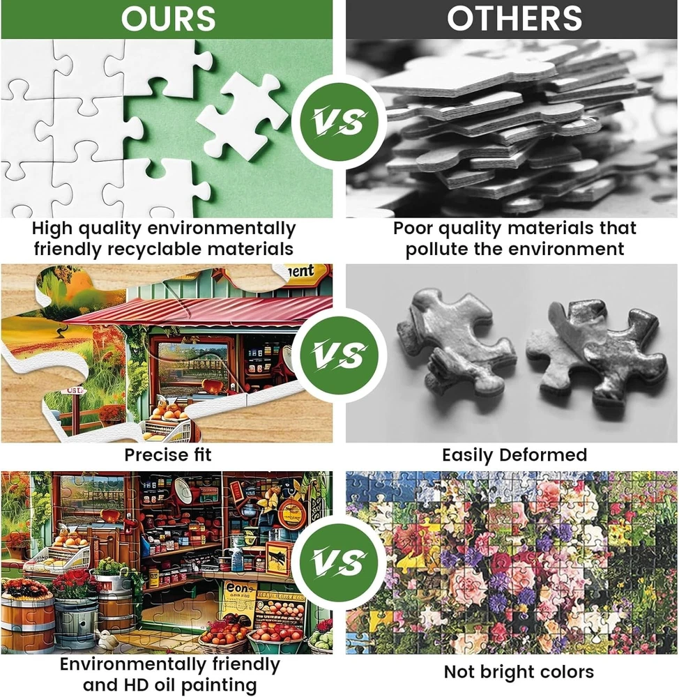 300 Piece Jigsaw Puzzle for Adults Large Piece Shop Puzzle Recycled Cardboard Pa 300 Piece Puzzles Game: The size of the jigsaw puzzles is 20.5 * 15 inches, and this 300 piece puzzle challenge is just right – not too easy, not too difficult, enough to keep you engaged a puzzle adventure for hours on end! This farm puzzle is suitable for children, young people, adults and the elderly! The surface of the 300 piece puzzles adopts advanced film technology to keep the rich and bright colors; The puzzles are exquisitely made with smooth edges, which can be closely assembled together; The back of the puzzle is marked with A-H letters to help the puzzle builder determine the approximate location of the pieces of the puzzle! Our adult puzzles provide opportunities to improve attention, spatial reasoning ability, problem-solving skills and mobility! Experience the mental stimulation and relaxation of assembling puzzles! Whether you are an experienced puzzle enthusiast or a puzzle beginners, this puzzle can give you an extraordinary experience! Bring together your friends and family, prepare juice and coffee, and have a fun and amazing puzzle challenge! We fully understand the loss of missing a puzzle piece when we are about to complete a jigsaw puzzle. Please do not worry. If you have a missing puzzle piece, please email us directly and we will arrange for a replacement! Return Policy: We offer a 30 day return policy from the receiving date. Please contact us for a Free Return Label. Please use our return label so it will go back to our supplier and we can do a refund or replacement afterwards. Feedback: Your satisfaction is very important to us! If you have any problem with your order, please contact us and we will do our very best to make you satisfied. As long as you are happy with your purchase, please leave a positive feedback for us. We will always leave you a positive feedback in return. If you have any problem with your purchase, please do not leave a negative feedback. Please Contact us ... and your issue will be solved quickly and positively We are a small family-owned business trying to make a living, not a huge company that does not care ... We will ALWAYS do our best for you!