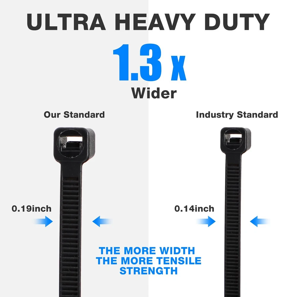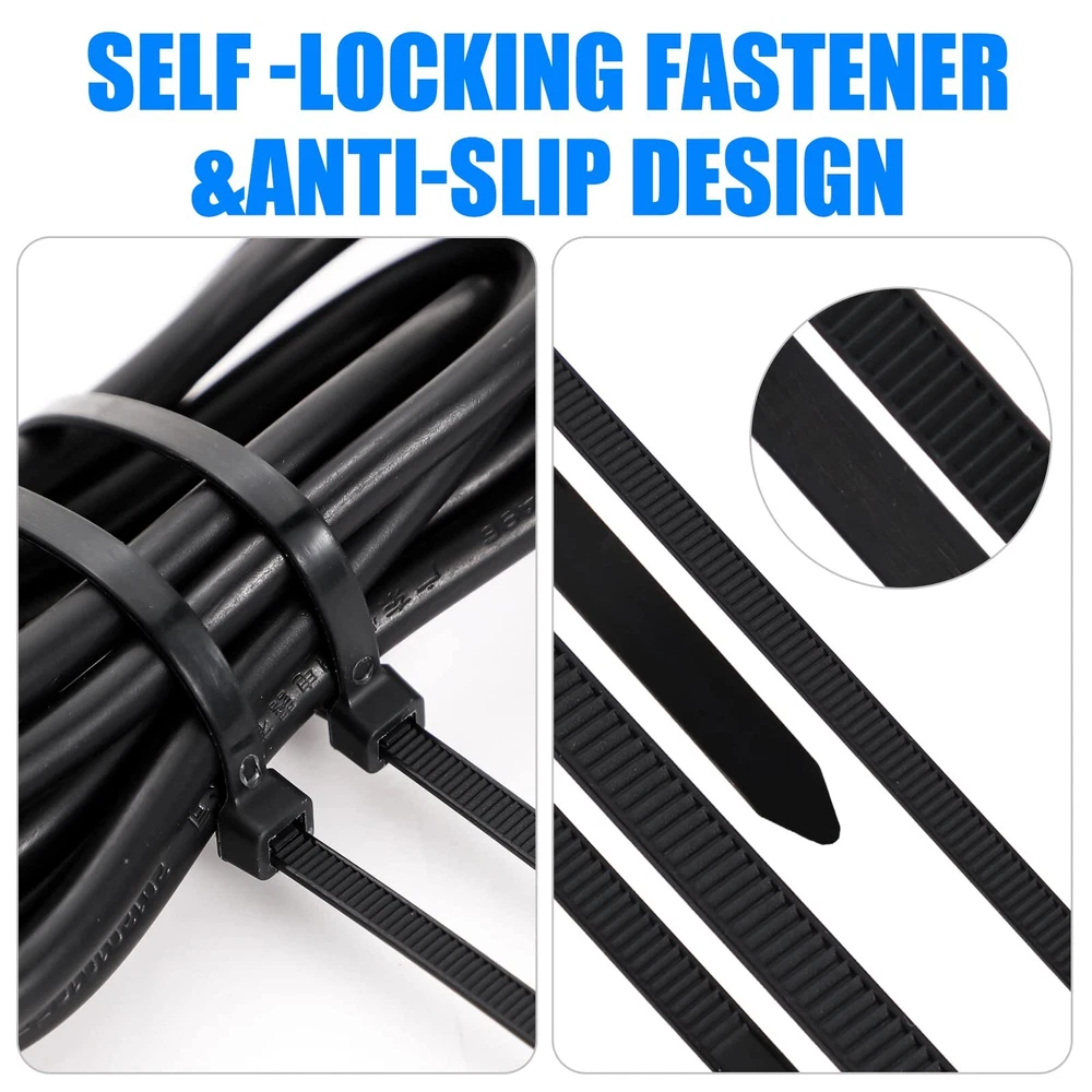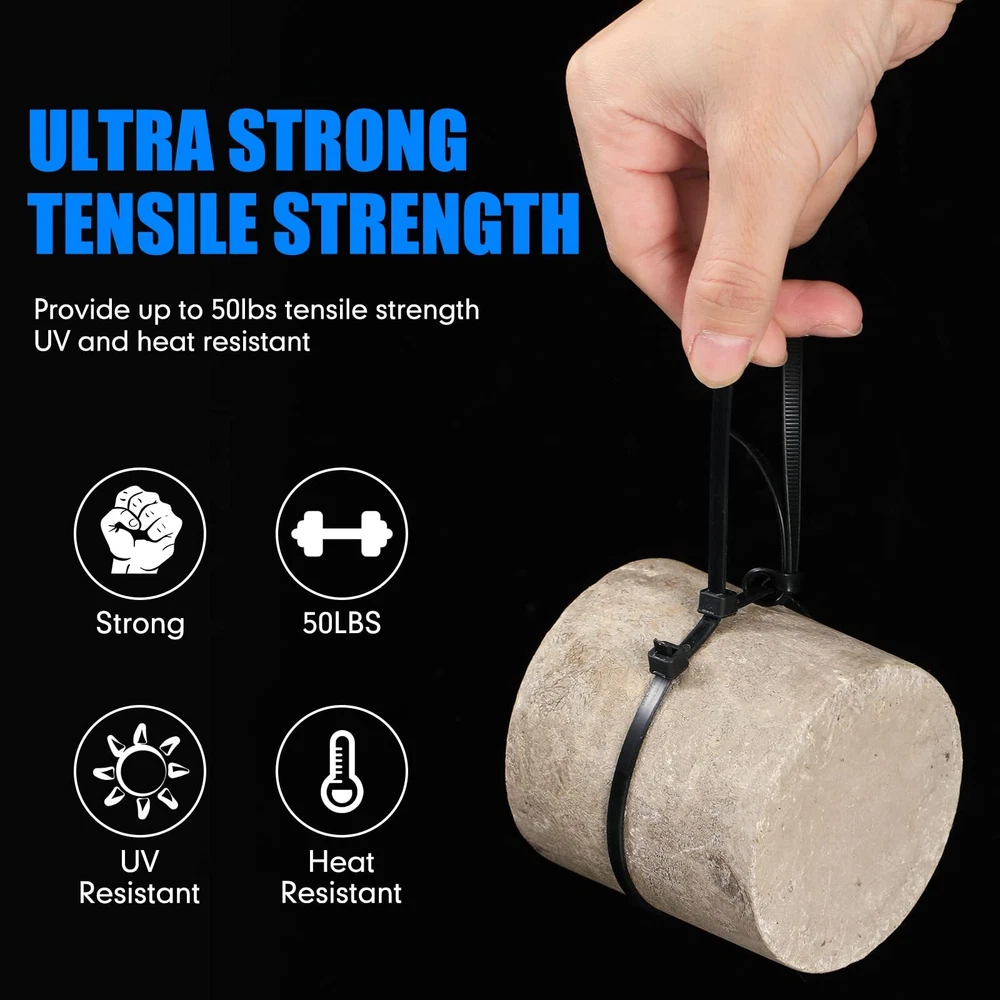Features: Ample quantity: The 3000 pieces of heavy duty zip ties for outdoor use are enough for you to use for a long time, do not need to buy them often. When you need them, you can quickly find them in your home or other places, easy to use. Sturdy and portable: With a 50lb tensile strength, the bulk zip ties can be helpful to meet your various DIY or commercial purposes, giving you a good use experience. And they are lightweight, easy to carry. Specifications: Material: nylon Color: black Size: Length: 12 inches Width: 0.19 inches/ 4.8 mm Package includes: 3000 x Cable zip ties Notes: Manual measurement, please allow slight errors on size. The color may exist a slight difference due to different screen displays. Winding risk may exist, please keep away from little kids. Pointed parts included, please keep away from little kids. 50Lb Tensile Strength: the wider the width, the stronger the tensile strength; The length of our black zip ties is 12 inches, and the width is 0.19 inches/ 4.8 mm, to provide up to 50 lb tensile strength, helping fasten more quickly and smoothly 3000 Pack: you will receive 3000 pieces of black zip ties, enough quantity so that you do not have to worry about running out of in the middle of your project; The self locking design provides a strong and powerful lock, can easily handle and anti slip; With cable zip, cables can be tied tightly Quality Nylon Material: the cable tie adopts nylon, which is UV resistant, freezing resistant, study, and weatherproof, so in cold or hot weather, it still works well, bringing you much convenience, so that you can use with confidence Cold and UV Resistant: the wire ties are able to withstand even cold weather conditions (temperature range from -4 Fahrenheit to 185 Fahrenheit/ -20 Celsius to 85 Celsius), weather and UV resistant Widely Applied: the nylon tie wraps can be applied to home DIY, commercial purposes, cable management, gardening, wire binding, fence repairing, and so on; Suitable for households, contractors and industry, practical and reliable