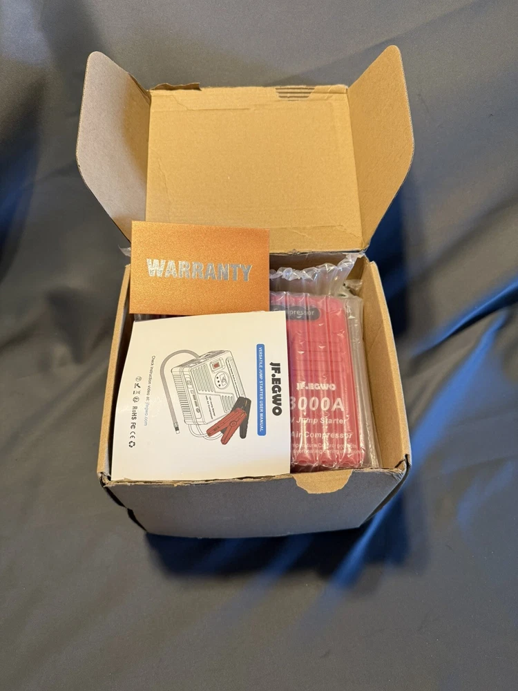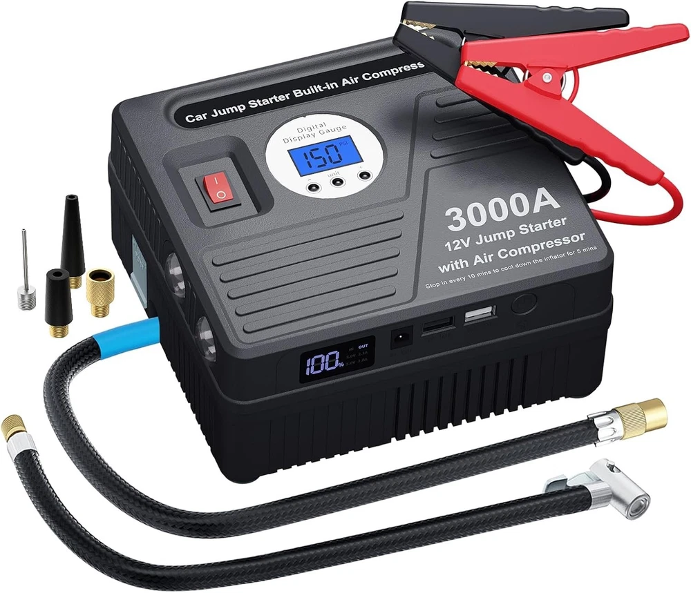 3000Amp Car Jump Starter with Air Compressor, 150PSI Tire Inflator with Digital Screen Pressure Gauge, 24000mAh 12V Auto Battery Booster (9.0L Gas/ 8.5LDiesel Engine), 2 USB Port 2 Light ✸【Super Capacity And Peak】The 3000Amp car jump starter uses a high-speed polymer battery instead of a normal starter. With the super 3000Amp peak and 24000mah capacity, it is easy to start a 12V vehicle (up to 9.0L gas engine or up to 8.5L diesel engine) , RV, tractor, lawn mower or speedboat up to 55 times. ·✸【Built-in 150psi Air Compressor】 Build-in Smart BATTERY Air Compressor, With LCD to read tire pressure when connected to your tire. And the 150psi air compressor comes with an extension air hose, 4 air inflation needles, for you to inflate car tires, bike, air bed, kayak, sports balls, air swimming pool, and more pumping products, you must have it in the summer! pumping up a standard tire in 4 minutes only. Can last 45 minutes, but please stop in every 10 minutes to cool down the air pump. ·✸【Automatic Stop and LCD screen】 Preset the value you want and the air compressor will automatically shut off when the pressure is reached, so you don’t have to worry about over inflating or low tire pressure anymore. Bulit-in digital gauge with LCD screen and ± 0.5PSI accuracy support to follow the inflating process clearly in 4 optional UNITs (PSI, Bar, Kpa, Kg/cm²). ·✸【USB Port and Emergency light】 Super power 24000 mAh li-ion recharger battery, 2 USB ports can charge Pad, iPhone and all kinds of smartphones, and Build-in two LED emergency lights with 3 models: lighting/flash/SOS, can be light up for more than 120 hours after a full charge. ✸【What You Get】 The 3000Amp car jump starter with 150PSI air compressor, Safety jumper cable, Storage bag, Ball Needles, Tapered nozzle. Short nozzle, Metal adaptor, 12V DC car Charger,110V Home Charger, user manual. We are US company, The Jump starter was design in US. We promise you 24/7 online service, 12 months warranty.100% risk-free satisfaction. I wish you enjoy with this jump starter and compressor, feel free on the way always! 3000Amp JUMP STARTER: Up to 9.0L Gas and 8.5L Diesel Engines).150 PSI AIR COMPRESSOR: Built-in digital screen pressure gauge. The 150 PSI car air pump provides you with rest-assured using experience based on the auto-shut off function. Preset the desired pressure level and start inflating job. The car air compressor will shut off automatically at the desired level. There is no need to worry about over inflating, The smart inflator for tires got your back. Note: To ensure transparency, all photos in this listing are of the actual item and its contents. Please review the images carefully, as they represent exactly what is included in your purchase. Feel free to send a message if you have any questions or need clarification. This note is applied to all our products.