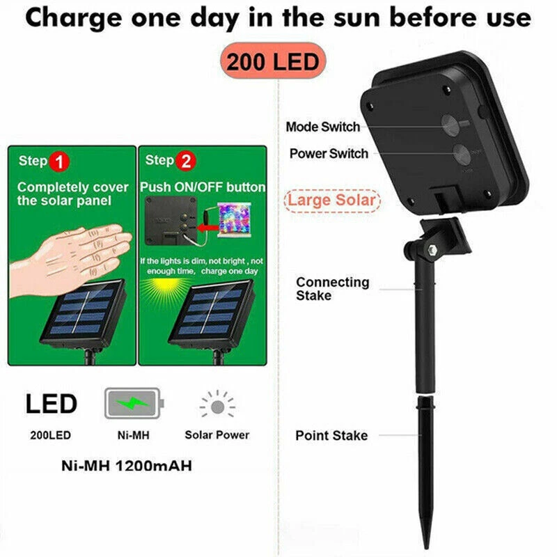 SAFE & SECURE SHOPPING 100% SATISFACTION GUARANTEED FAST SHIPPING 300/100 LED Solar Power String Fairy Lights Garden Outdoor Party Christmas Lamp Product Description 300/100 LED Solar Power String Fairy Lights Garden Outdoor Party Christmas Lamp Product Description Advantage: 1. It doesn't matter even if there is a power outage, solar energy is fully charged during the day, and it can be illuminated even if the power is out 2. Do you feel that the electricity bill is a bit expensive? The use of solar energy can save electricity 3. Convenient for indoor and outdoor use product information: Product status: 100% brand new Color: warm white/cool white/multicolor/blue Length: 10m 100led / 20m 200led/30m 300led Power supply: solar Charging time: 6-8 hours of charging, 8-10hours of use Mode: 2 different lighting modes Instructions for use: 1.Before use, please remove the protective film on the solar panel. 2.These lights are not fully charged when they arrive. 3.Please put them in the sun, and then directly expose them to the sun to fully charge them. 4.Make sure to charge at least not less than 6 hours of direct sunlight during the day. 5.The panel must be in a dark/dimmed environment to turn on the light. 6.When the ambient brightness is less than 10 Lux, the light will automatically turn on. 7.If you want to open it in a brighter environment, simply cover the solar panel after charging. 8.When you want to charge the light string, please make sure it is turned on, and then it will charge automatically. product manual: 1.Use scene: You can beautify the terrace, terrace, front porch, family room, living room, kitchen, any place you like. Add a fun and romantic atmosphere to your family, parties, weddings, etc. 2.Upgraded solar panel: powered by solar energy, it can work for at least 8 hours after fully charged. It lights up automatically at night and turns off during the day. 3.Waterproof: both the light string and solar panel are IP65waterproof. Don't worry about using them in the rain. But this is only designed to prevent rain. Please do not immerse it in water. 1.High-quality, soft copper wire: environmentally friendly, high energy conversion rate, durable and safe to use. 2.Easy to shape: Flexible copper wire can easily build the shape you want. package 1 * LED light string 1×solar panel About Us Payment Shipping Returns Contact Us About Us If you have any questions, then kindly please contact us via the ‘ Ask a question ’ Tab which is located on the bottom of the listing page. Thank you for shopping with us and we hope to see you soon! Payment After Auction Close, You can Go ahead and Checkout with Ebay System, We Do not Offer Combine Shipping Payment . We accept Paypal only. We only ship to the delivery address in your Paypal payment, please ensure that the shipping address and phone number on your paypal payment is correct. If you have any change for address, please inform us in paypal note or send an email before shipping. Payment must be fulfilled within 7 days since auction's ending. All non-paying bidders will receive an unpaid reminder from eBay. Shipping Once we have received cleared full payment, your items will be dispatched in 3-5 days. If your shipment delays, we hope you can be patient, and at the same time contact us, we will try our best to help you. Our price DOES NOT include Import duties / Tax. It is buyer's responsibility for it Returns If any item is defective upon receipt or do not work, please contact us for the return address, return is accepted within 30 or 60 days after the buyer receiving the item. Returned item has to be in its original condition. Buyer is responsible for return shipping costs . After receiving the return we will make a replacement depends on our available stock, if not available, a refund will be issued. Contact Us Working Time: 9:00AM-6:30PM (GMT+08\China) From Monday -Saturday, If There is any holiday, please see the notice we send out thanks. Please take free to contact us if have any questions. Copyright © 2022 Tongtool