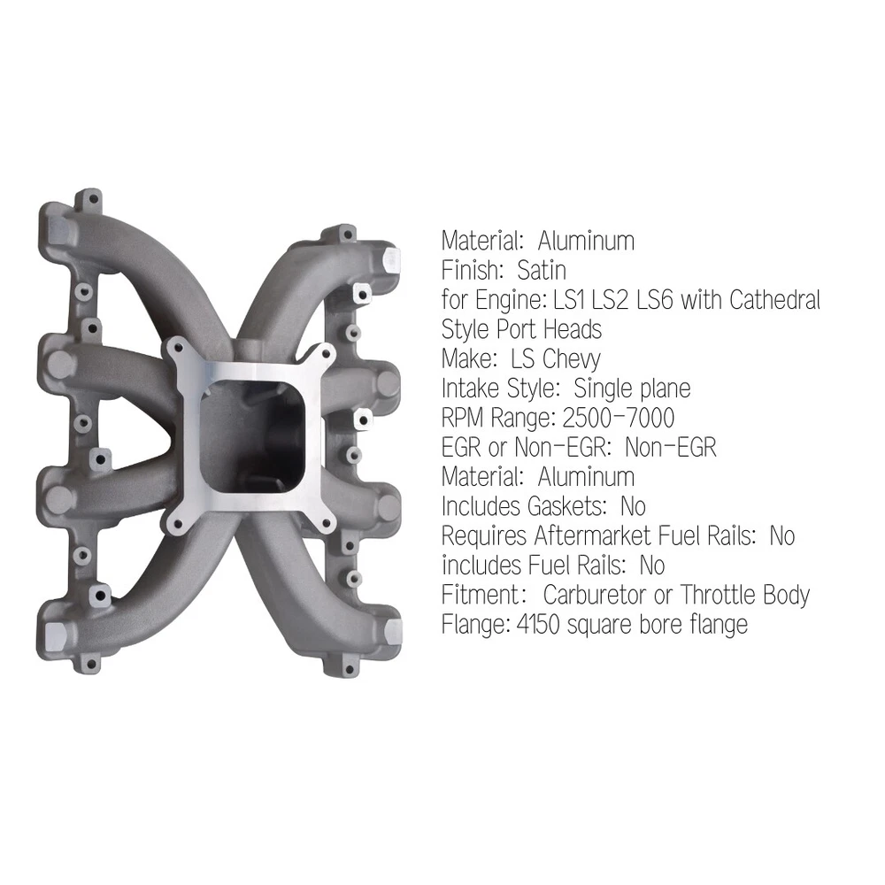 300-132 Single Plane Carb Intake Manifold Satin For GM LS Gen III IV LS1 LS2 LS6 Features: Product Type: Intake Manifold Material: Aluminum Finish: Satin Engine: Fits all GM LS Gen III or IV engines equipped with LS1/LS2/LS6 style cathedral port cylinder heads Make: LS Chevy Intake Style: Single plane RPM Range:2500-7000 EGR or Non-EGR: Non-EGR Material: Aluminum Includes Gaskets: No Requires Aftermarket Fuel Rails: No ncludes Fuel Rails: No Fitment:Carburetor or Throttle Body Flange:4150 square bore flange Fitment: 2004-2005 Cadillac CTS V8, 5.7L/346 Basic Operating RPM Range 2500-7000 1998-2002 Chevrolet Camaro V8, 5.7L/350 Basic Operating RPM Range 2500-7000 1997-2004 Chevrolet Corvette V8, 5.7L/350 Basic Operating RPM Range 2500-7000 2005-2007 Chevrolet Corvette V8, 6.0L/364 Basic Operating RPM Range 2500-7000 Note: 100% brand new, Never been tried or installed. No instructions are supplied.Please consult with a qualified mechanic before attempting installation! Package included: 1*Intake Manifold Mounting Hardware As shown in the picture above