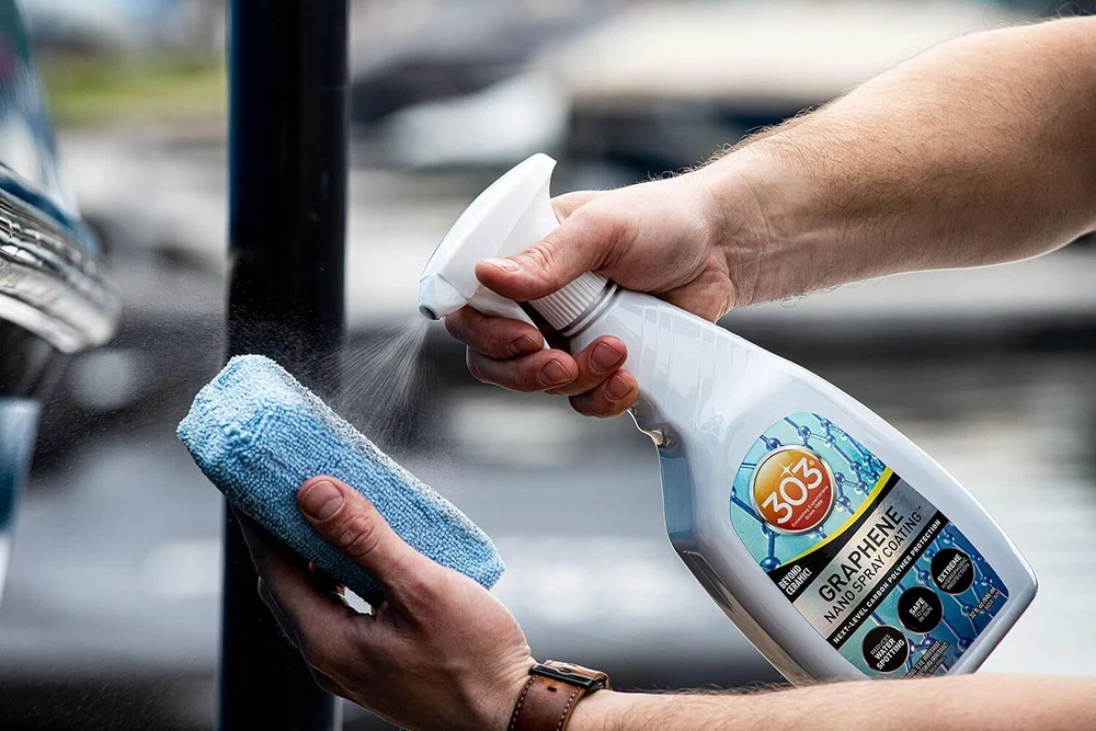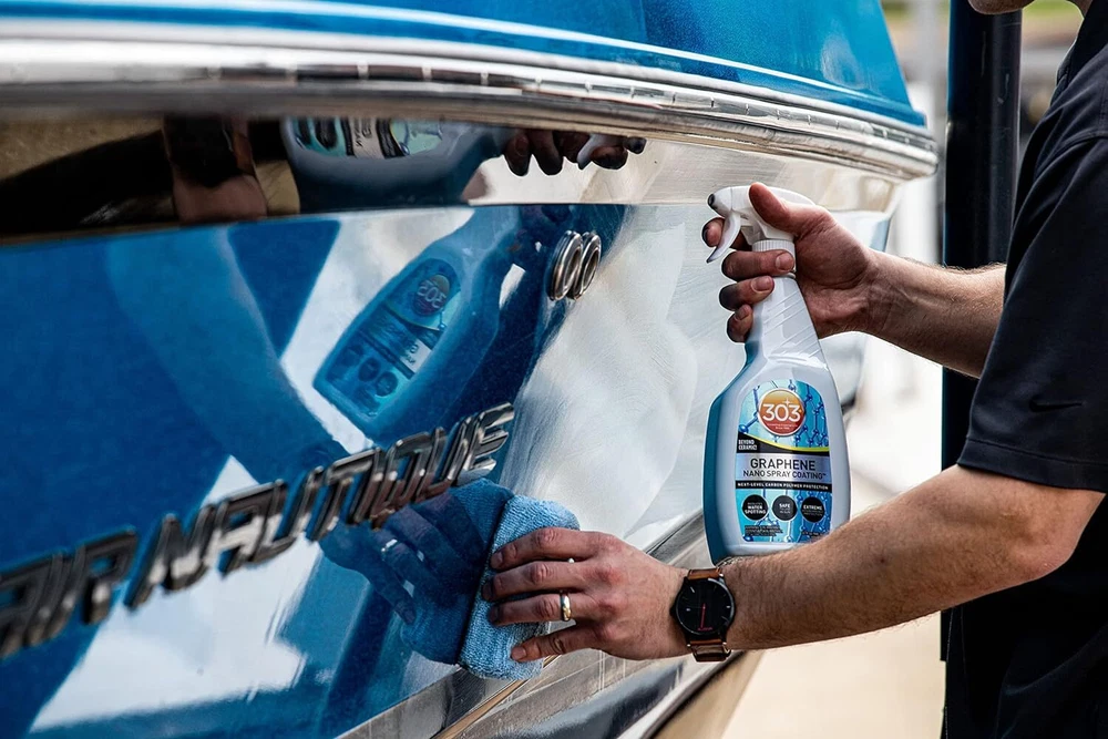 Pardical LLC 303 Products Marine Graphene Nano Spray Coating - Next Level Protection - Enhances Gloss and Depth - Reduces Water Spotting - UV Ray Protection- Safe to Use in the Sun - 32 fl. oz. (30251), White Brand 303 Products Item Form Aerosol Item Weight 1.86 Pounds Number of Items 1 Unit Count 32.0 Ounce About this item Beyond Ceramic – 303 Marine Graphene Nano Spray Coating offers over a year of superior protection to keep your boat looking its best. This simple-to-apply formula will increase the durability and longevity of your boat’s paint, trim, and windows more effectively than ceramic coatings! Boating Season is Here – As you prepare to get back on the water, make sure your boat is protected and ready to face the salt, sun, and more. Our high-quality hydrophobic technology reduces water spots, repels water more quickly, and resists dirt and salt buildup to keep your paint shining UV Protection – In addition to wicking away water, graphene protects your paint from UV rays and prevents damage from harmful sun beams. Now you can enjoy the sunniest of days out on the water without worrying about your paint fading or cracking Directions – Shake well before use. Ensure surface is clean and dry before applying product. Spray onto a microfiber or foam applicator. Apply to the surface in a crisscross pattern to achieve full coverage. After application allow product to cure and haze white. This will take approximately 5-10 minutes. Then, buff off with a clean microfiber towel. No need to wait before introducing your craft to the water. You're ready to go! For over 40 years, 303 Products have provided premium protection for your cars, boats, and beyond. All 303 Products are good for 2 years after the packaging date on the bottle – YYDDD PLEASE NOTE - Due to the pandemic, it has been challenging securing quality sprayers. We are aware that the sprayers we are currently using sometimes have quality issues. If you receive a bottle with a faulty sprayer, please contact us directly for a replacement. We are actively working on a solution and appreciate your understanding From the manufacturer HOW TO USE: Spray onto a clean microfiber applicator. Apply to the boat, one section at a time. Let haze until white - about 5-10 minutes. Buff off with a clean microfiber towel. Product Description Regular exposure to sun, moisture, and salt can wear down a boat’s finish over an extended period of time. 303 Marine Graphene Nano Spray Coating provides up to 12 months of protection to combat these harsh effects of marine climates. Product information Technical Details Item Package Dimensions L x W x H 11.54 x 4.29 x 2.83 inches Package Weight 0.85 Kilograms Item Weight 1.86 Pounds Brand Name 303 Products Warranty Description Everything you purchase from us comes with a 100% Satisfaction Guarantee. Our 100% Satisfaction Guarantee means you’re covered if you are unhappy with the results of the product or if it does not hold up to the claims on the label. Model Name 303 Color White Material Plastic Suggested Users unisex-adult Number of Items 1 Manufacturer Gold Eagle Co. Part Number 30251 Style 303 30251 Marine Graphene Nano Spray Coating - 32 oz. Included Components Bottle Size 2 Pound (Pack of 1) MESSAGE US FOR ANY OTHER PARTS YOU NEED Shipping: Customers cannot specify the carrier of their choice. We do not offer combined shipping services. We ship only to the Continental 48 US States. All Shipping is free! NOTE: We apologize, but we cannot ship to P.O. Boxes, APO/FPO, PO Boxes, Alaska, Hawaii, Puerto Rico and the U.S. Virgin Islands, Samoa or any US Protectorates Handling: Your order will be processed within the allotted time frame and will never exceed 3 Business days. Most items ship out 2-3 Business days after payment is received Return Policy: We offer a 30 days return policy from the receiving date. Please contact us for a Return Merchandise Authorization (RMA) number! If you have a problem or question regarding your transaction please contact us before leaving any type of feedback. We will work with you to resolve any problem you may have. Feedback When your order arrives and “there is no issue”, please leave feedback to notify us that you have received your item. We also leave you a positive feedback in return. Please give us a chance to work things out before leaving feedback or filing a case. Customer Support Our goal is to provide the best customer service. Please email us via eBay messaging. All inquiries are answered within 24 hours and our customer service team aims to resolve any issues quickly and effectively. Issues can be effectively addressed through simple communication. Listing and template services provided by inkFrog