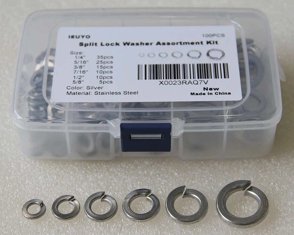 1. High Quality Stainless Steel Split Spring Lock Washer Kit 2. Material: 304 Stainless Steel 3. Providing the good resisitance to corrosion and high temperature 4. Package Quantity: 100Pcs Split Lock Washers,1/4” 5/16" 3/8" 7/16"1/2" 5/8" 5. All pieces Come in a Durable Transparent Storage Box, Easy to Store Product Description **SAE split spring lock washers provide greater bolt tensioning for tighter assemblies and provide protection against loosening resulting from vibration. Lock washers can be used with a standard washer to provide uniform bearing surface. These washers are intended for general use. **Perfect for electrical connections on household and commercial appliances where there is a threaded/bolt-type connection.