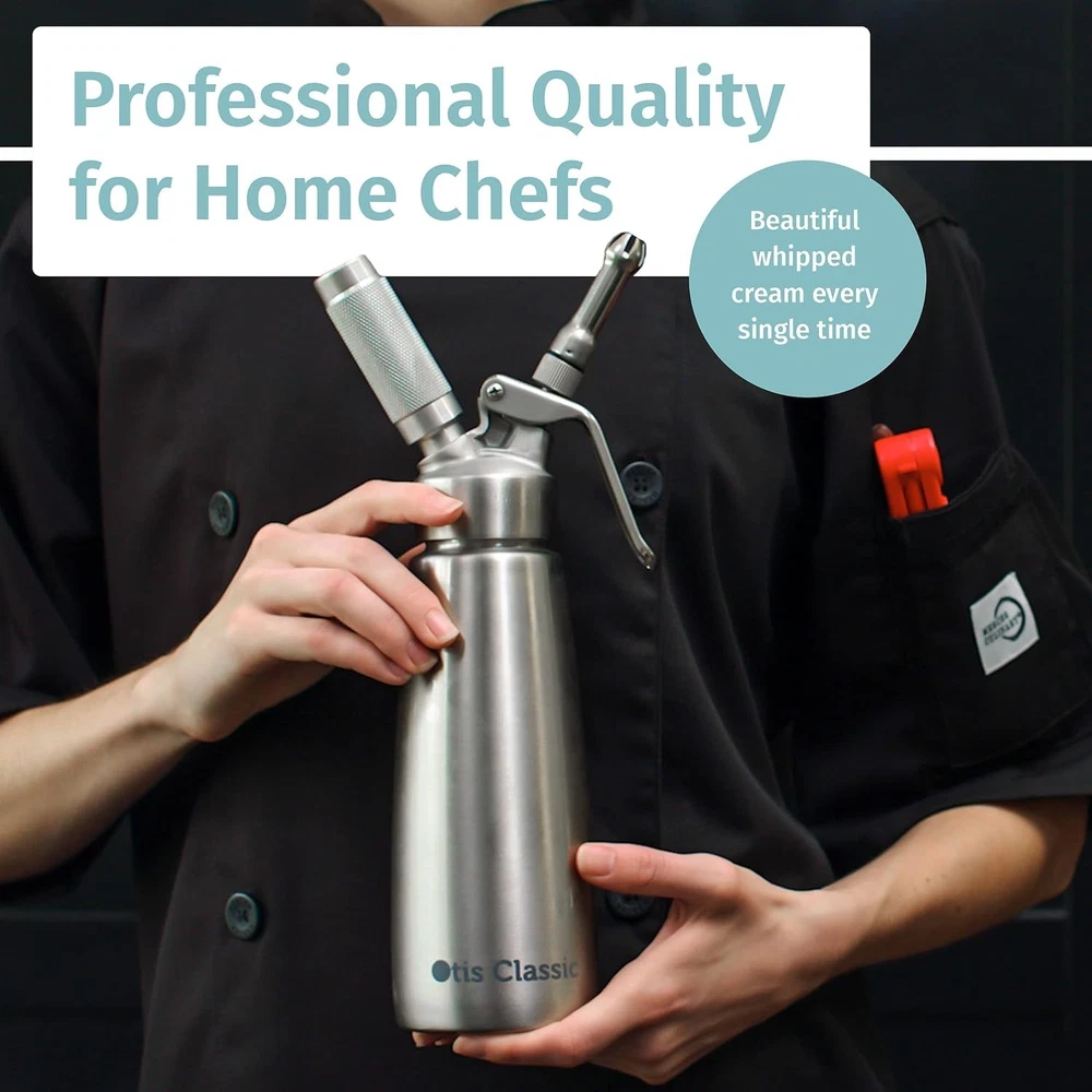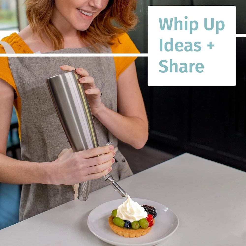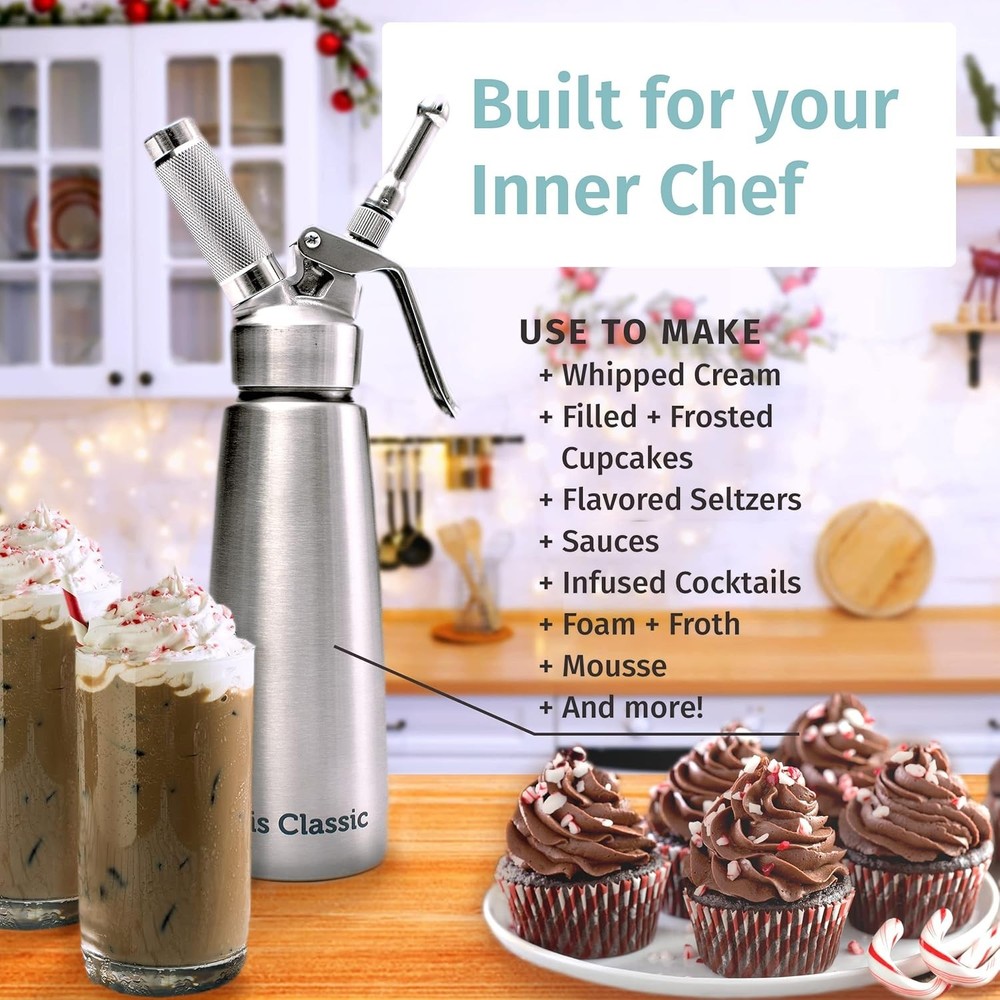 304 Stainless Steel Whipped Cream Dispenser, 500ml w/ 3 Decorating Nozzles - Commercial Grade Quality Made of Food Grade Stainless Steel - Easy to Use and Clean Ideal for Desserts for Home Chef COMMERCIAL GRADE - craft mixture tool that is built for the food service industry, and safe for home use. Perfect for the home chef cooking top desserts with whipped cream or froth on coffee & lattes while entertaining guests! Incredible at making nitro cold brew coffee and mousse! STAINLESS STEEL - Fully constructed with durable, sturdy 304/18-8 food grade stainless steel, making it less reactive and retain the food color and flavor. Ideal for coffee shops, restaurants, ice cream shops and especially pastry chefs! Important usage tips: N₂O chargers (Whip Cream Chargers) ONLY; N₂ (nitrogen) or CO₂ for Cold Brew Soda will NOT work; Use heavy cream (30–36% Fat) — low-fat won’t whip; Keep cream cold (≤50°F) for best results DECORATING TIPS & GUIDE INCLUDED - 3 styles of decorating tips for gorgeous whipped cream art. Also included is a step-by-step instruction guide to show you the wide variety of uses of our dispenser EASY TO CLEAN - Built to access all separate pieces of the dispenser quickly, making it extremely simple to take it apart and clean the individual pieces. We include a decorating tip brush and washes up easy in warm water. OUR PROMISE- We are 100% confident in our product - if you have any problems or issues, return the product no questions asked - or contact me to solve the problem! A Housewarming Gift: Birthdays and holidays aren’t the only times for gifts. Know someone moving into a new apartment or who just bought a house? This makes for a perfect contribution to the new chapter in their life.