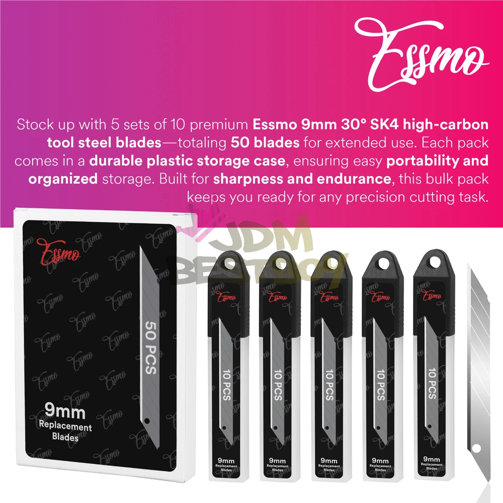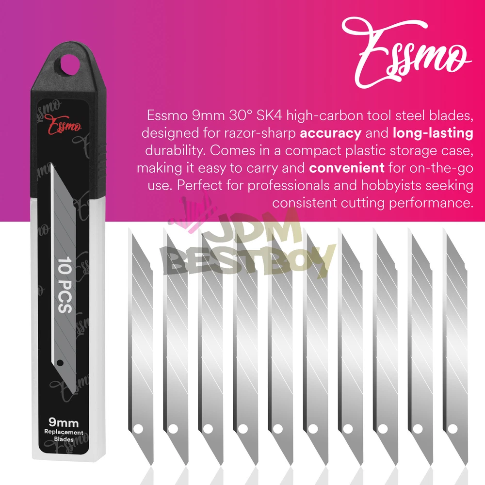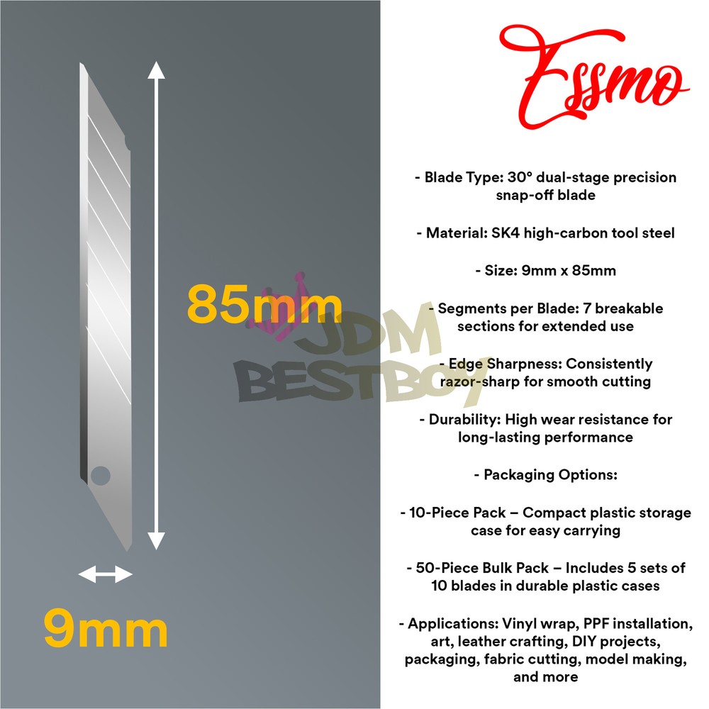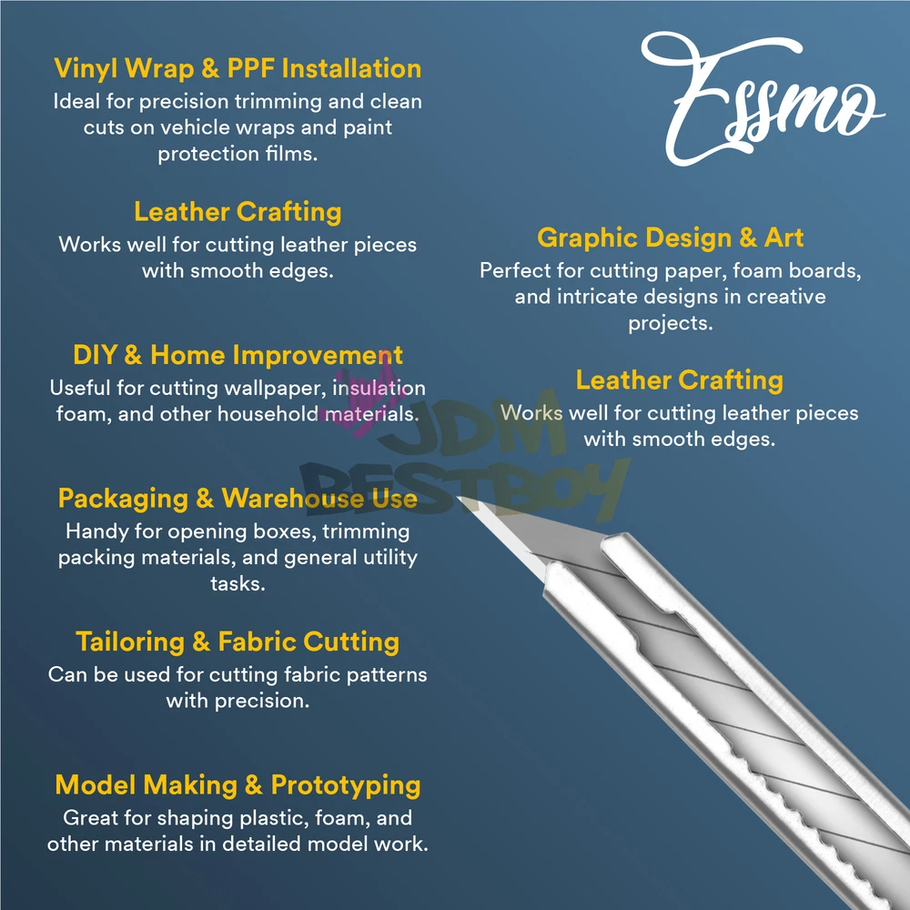 Product Overview 30 Degree Knifes Blade Stainless Utility Precision Razor Vinyl Wrap Tint Tools Store Categories Store Categories Automotive Accessories Adhesive Tape Body Kit Decals & Stickers Door Guard & Trim Engine Accessories Exterior Accessories Fastener Handbrake Interior Accessories Lighting Mirror & Mirror Cover Motorcycle Shifter Steering Wheel & Cover Tire & Wheel Headlight Tint Heat Transfer Vinyl (HTV) Bundle Set Chameleon (ADC) Chrome (DS) Flock (DF) Glitter (DG) Glow in the Dark (GD) Matte (DP) Neo Chrome (NC) Pattern (SP) Printable (DD) Rainbow Reflective (RT) Paint Protection Film (PPF) Shipping Supplies Vinyl Wrap 3M Architectural Avery Brushed Aluminum Camouflage Carbon Fiber Chameleon Chrome Coral Craft Galaxy Dust Glitter Gloss Holographic Matte / Satin Metallic Patterned Pearl White Space Candy Velvet Vinyl Tools Window Film Architectural Window Film Frosted Window Film One way Vision (OWV) Solar Window Tint Window Tint Other Payment Description The ESSMO 30 Degree Knife is crafted for precision, featuring an acute 30° blade angle that delivers a sharp, clean cutting edge. Ideal for detailed and delicate work, this knife is a top choice for professionals handling specialized tasks. Whether you're installing paint protection film (PPF), working on vinyl wrap applications, or performing other precision-based projects, the ESSMO knife ensures control, accuracy, and high-performance results every time. Features: Perfect for wrapping, cutting vinyl, wood, window films, vinyl graphics, and more. Suitable for both personal and industrial use. Acute 30° blade angle for precise cuts. Automatic blade lock for enhanced safety and security. Stainless steel blade channel securely holds the blade in place. Convenient pocket clip doubles as a blade snapper. Tool-free blade change for quick and easy replacements. Each blade provides up to 7 cutting edges. Shipping Policy Payment Returns Policy About Us Shipping Policy Fast shipping from Industry, CA Once your payment clears, most orders are processed & shipped out either the same or next business day. Please ensure that the shipping address you provided at checkout is accurate. We are not responsible for un-deliverable or wrong shipping address issues. We ship all of our items either via USPS / FEDEX. Please notice that Sat, Sun and Public Holiday DO NOT count as a business day. For International buyers: International shipping ETA 21-45 business days, please allow up to 1 month for custom clearance in some area / country. Import duties, tax and charges are not included in the item price or shipping charge. These charges are the buyer’s responsibility. Please check with your country’s customs office to determine what these additional costs will be prior to buying. Payment Pay secure with any major credit card through PayPal. Please pay within 3 days after auction ended. Please confirm the mailing address correct when you make a payment. Feedback will be left automatically after received buyer feedback. Please contact us before leaving a Negative & Neutral feedback. We would try our best to help you solving any problem. Please feel free to contact us through EBAY message if you have any question, and we will get back to you within 24-48 hours. Returns Policy The RMA Number will be same as the EBAY ITEM NUMBER. Please write it with your EBAY ID, Date of purchased on piece of paper or outside the box, and return it with the item. A 25% restocking fee will be charged. Shipping & Handling fee is not refundable. Any faulty due to improper installation or improper use will NOT be covered by the warranty. Any physical damage such as soldering or modified bases will void the warranty too. Buyer pay for all return shipping postage fee. All return & exchange must be in NEW & UN-USED condition About Us We are trying our best to describe all details of the product here. Please feel free to contact us through EBAY message if you have any question, and we will get back to you within 24-48 hours. Our business hours are Monday to Friday 10am to 6pm PST Customer satisfaction is our priority. If you are not happy with the item that you purchased, please first contact us for more information. We will try our best to solve the problem with you. On Jun 24, 2025 at 17:26:46 PDT, seller added the following information: