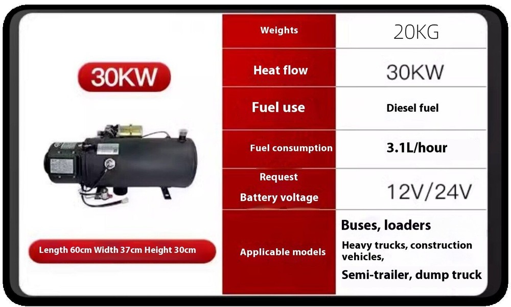 Product Description Specification: Heat flow:30KW Weight:20KG Fuel use:Diesel fuel Fuel consumption:3.1L/hour Request Battery voltage:12V/24V Applicable models:Buses,Heavy trucks, constructionvehicles, Semi-trailer, dump truck Package included: 1*set of Auto Diesel Heating Boiler Payment Policy Shipping Policy Returns Policy About us Payment Policy NOTE: Import duties, taxes and chargers are not included in the item price or shipping charges. These charges are the buyer's responsibility. Please check with y our country's customs o ffice to determine what these additional costs will be prior to bidding buying. Shipping Policy 1. We Ship to Worldwide. 2. Item are shipped from S henzhen using Airmail, reach most of the countries within 10 to 35. 3. Delivery time depends on destination and other factors, it may takes up to 40 business days. 4. We are not responsible for undeli verable address, we reserve the right to charge the shipping fee again for returned items due to wrong address. Returns Policy 1. All Returned items Must Be in the original packaging and you MUST PROVIDE us with the shipping tracking number, specific reason for the return,and your ebay ID. 2. We will refund YOUR FULL WINNING BID AMOUNT, upon receipt of the item in its original condition and packaging with all components and acc essories included, AFTER BOTH Buyer and Seller cancel the transaction form ebay. OR, you may choose to have a replacement. 3. Return shipping is to be bear by the Buyer. About us 1. We greatly appreciate your POSITIVE feedback. Please do NOT leave negative feedback without asking for help. Our aim is to provide Top Level Customer Service, normally so we will try our best to solve any problem you have. 2. Please DON'T leave negative or neutral feed back if you haven't received item in 30 days, because we have mentioned the shipping time repeatedly. Copyright © 2023 Dianxiaomi
