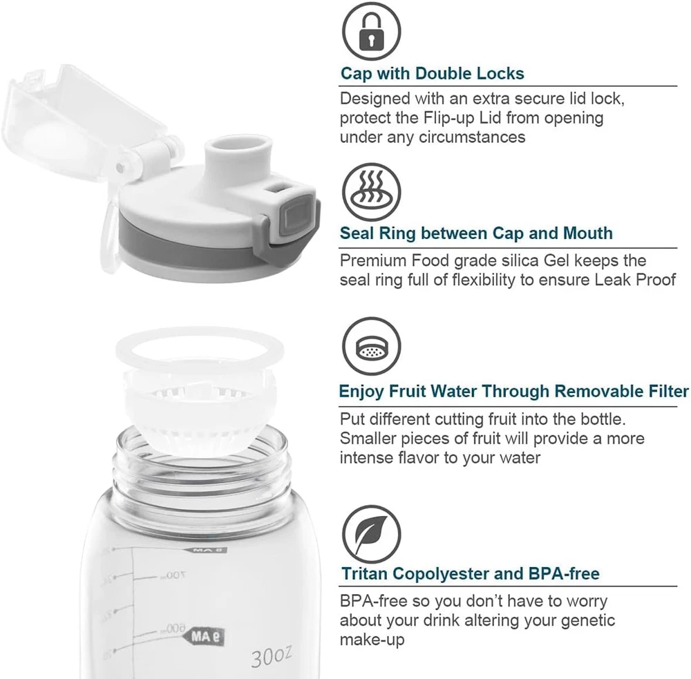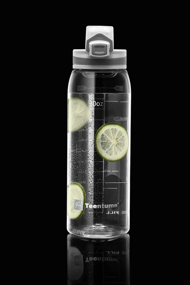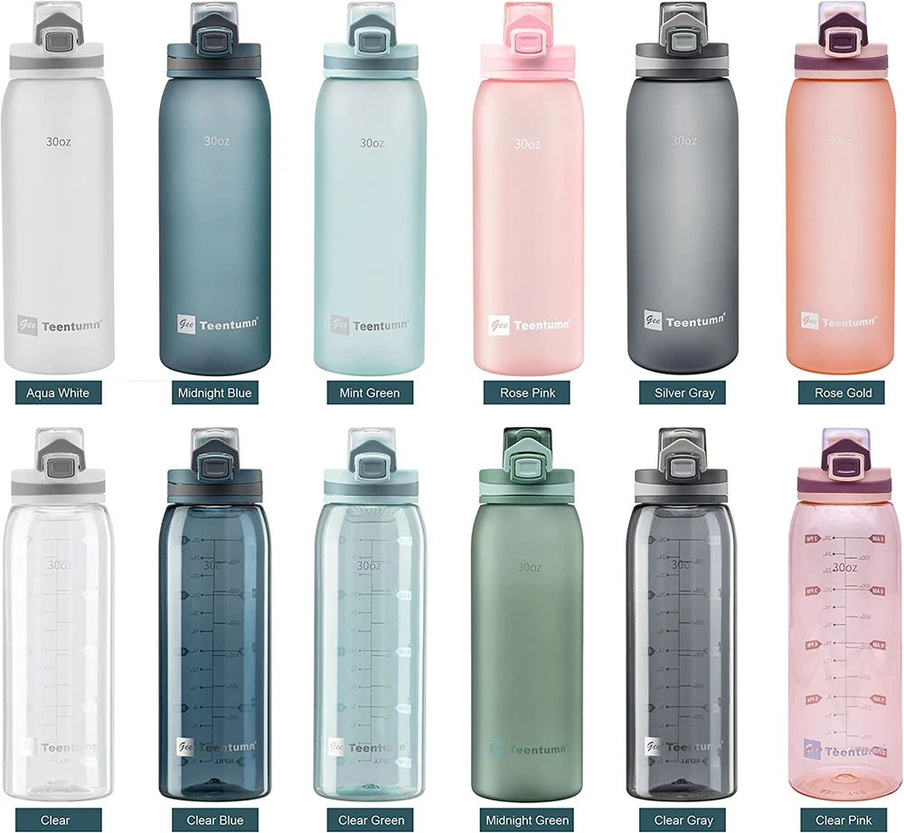 Meet Water Needs of Your Body Everyday - With the newly designed time marker, Teentumn 30oz plastic water bottle provide an easy way to track water consumption and remind you dink enough water Healthier Drinking - Made from 100% BPA and toxin free Tritan co-polyester plastic to ensure that water is SAFE to your body and environmentally friendly Triple Watertight Protection - The drinking cap, secure lid lock and the seal ring between the cap and the mouth ensure no leakage even Inadvertently falling on the ground Enjoying Fruit Water Through Removable Filter - Put the smaller pieces of Fruit will provide a more intense flavor which helps flush toxins from your system, helps to improve digestion and makes you feel full to combat unhealthy snacking Take it Anywhere You Go - Suitable for All Kinds of Outdoor and Indoor Activities. Enhance your health and feel stronger and energized with the help of the Teentumn portable water bottle! Product Description Teentumn 30oz Portable Sports Water Bottle with Flip Top Teentumn 30oz Portable Water Bottle with Timer Marker Did you know that drinking water could be a lifesaver? Pure, Clean drinking water does so much to keep your body running smoothly. Find out how to staying hydrated helps protect your health… Whether your friend loves camping, cycling or outdoor activities, or your fitness conscious spouse hits the gym regularly, Teentumn 30oz plastic portable bottle is the present idea you can think of! Keep Track of Your Water Consumption Teentumn Plastic Water Bottle with Time Marker provides an easy way to remind you of drinking enough water. The first glass and the last glass of water during one day is not included in the Time Marker Please do not forget to drink your first glass of water after you wake up to hydrate your body after a long night’s rest Please Drink your last glass of water an hour before bedtime to aid in the cell renewal process during your sleep. Anti-Dust and Avoid Spills The silicone ring on the twist lid and silicone gasket on the flip-up lid prevent leaking; the locking ring keeps the lid secure. This leakproof and dust-proof lid helps maintain fresher, more delicious tastes that are free of road dirt or grime while running, cycling, or hitting the trails. A Hassle-Free Experience How to Use? Step 1: Flip down the top latch. Step 2: Press the button with your thumb. Step 3: The lid pops open and enjoy. Step 4: Lock up the latch to keep the lid well in place. Filter for Fruit Infuser The removable filter prevents ice cubes and tea bags from being swallowed. It is an excellent fruit infuser, can add lemon, blueberries, watermelon, grape, melon, strawberry or mint etc. Clean it with the Attached Cleaner A Sponge Cleaner is included in the box. The wide mouth is designed to be easier for cleaning. Please wash all parts in warm soapy water before first using. Let Teentumn Portable Water Bottle Be Your Daily Reminder of Hydration!
