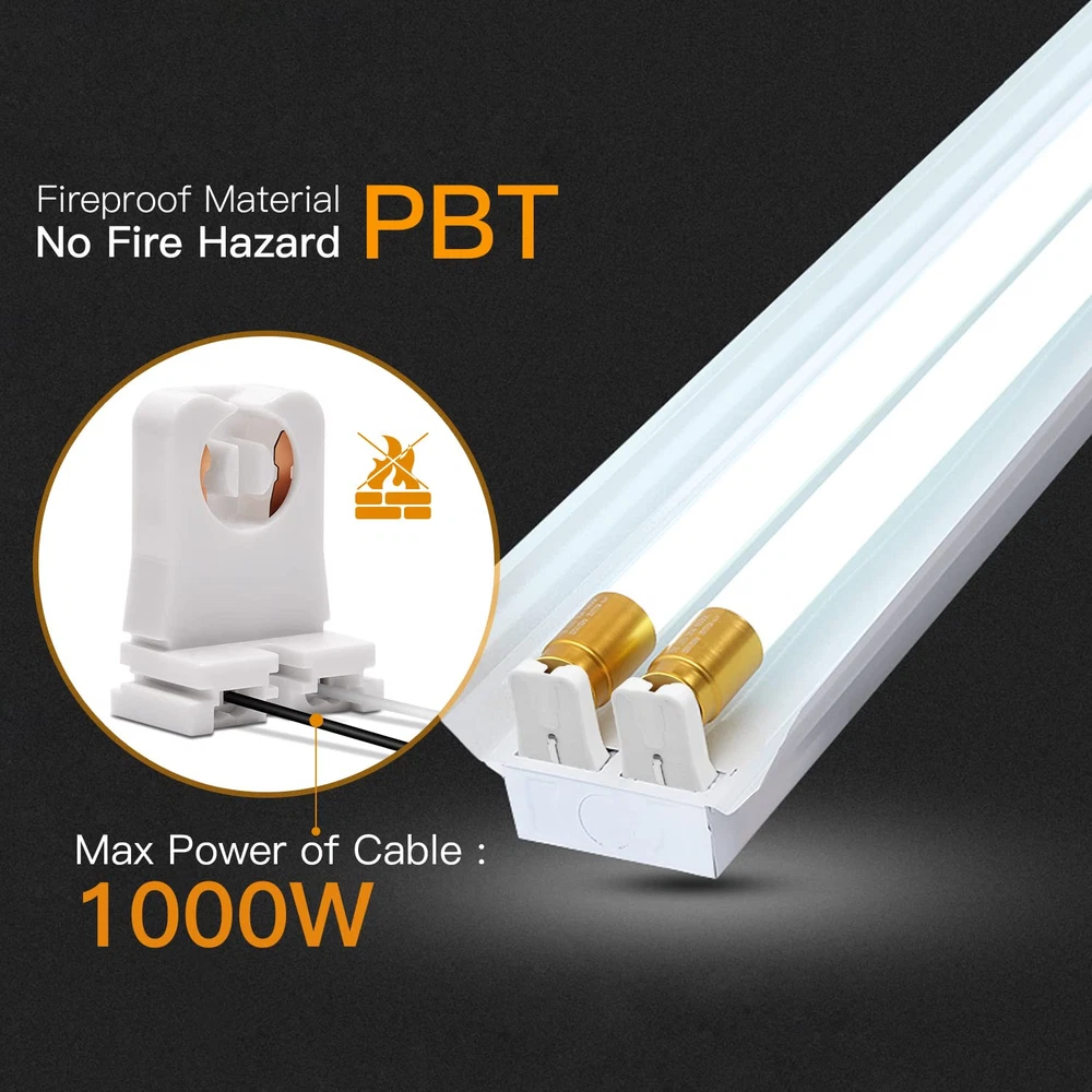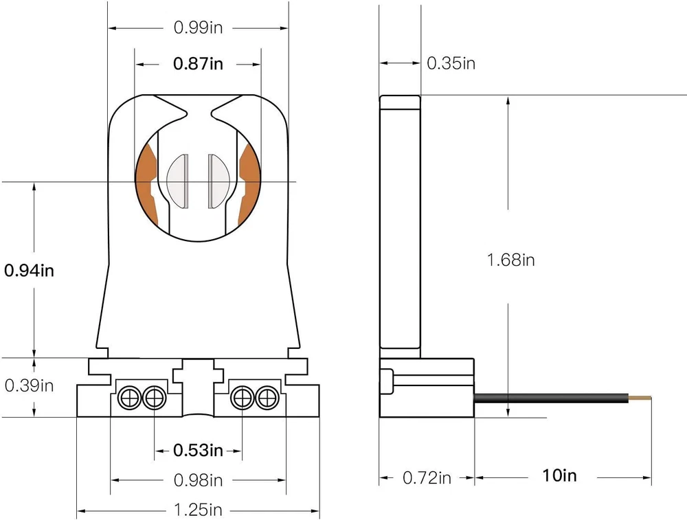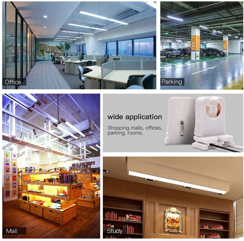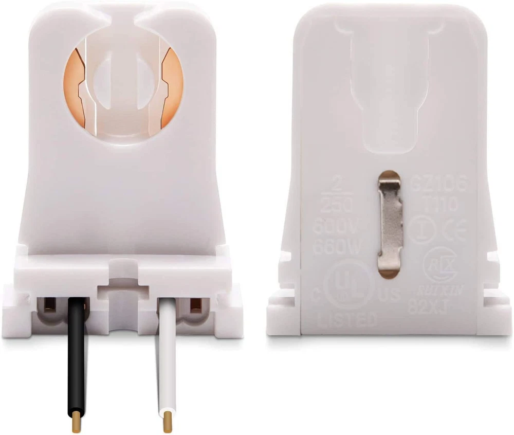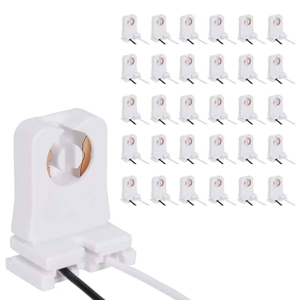 30-Pack JACKYLED Non-Shunted Turn-Type T8 Lamp Holder UL Socket White Product Details Package Dimensions : 9.88 x 7.13 x 1.69 inches; 15.2 ounces Item model number : JACKYLED661 Manufacturer : JACKYLED Brand: JACKYLED Material: Plastic Color: White Base Type: Medium Product Dimensions: 1.26"W x 1.65"H Specifications: Works with T8 and T12 lamps with medium bi-pin base. Max Wattage: 660W; Max Voltage: 604V. Great for retrofitting your fluorescent fixtures to LED tubes, replacing old florescent lamp holders and more. UL Listed: Made from high quality fireproof PC, the T8 lamp holders are heat resistant and 104% safe from fire hazard, durable even after years of use. Easy to Use: Get your project done in minutes with JACKYLED T8 Lamp Holder Socket Tombstone with 10” 21 AWG Wire(if you want to change wire,holes for Max.18 AWG Wires). Just connect the wires, plug the tube in and twist, a plug-and-play solution for your lighting projects. Wide Application: Perfect for anywhere from home, office, basement, closet to studio that needs a lighting retrofit, while staying low profile between the T12 lights. Warm Tips: Before you place the order, please make sure your old lamp holders have the same configuration with ours. T8 fixtures come in various shapes, and our holders are not compatible with some of them.