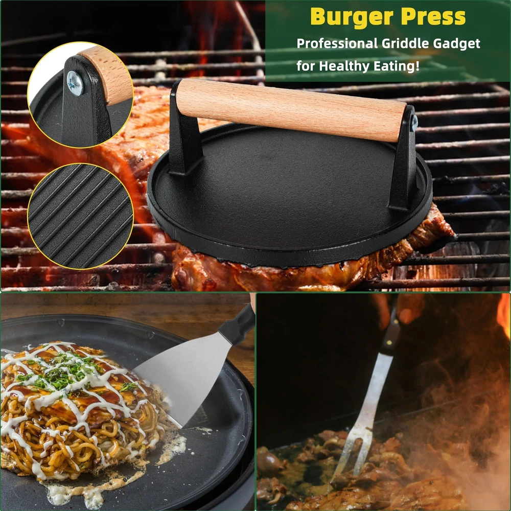 This griddle tool kit is a game-changer for outdoor cooking! The heavy-duty spatulas and press make flipping burgers and searing steaks effortless, while the scraper keeps cleanup quick. I love the variety—egg rings for perfect breakfasts, a chopper for dicing veggies right on the grill, and sturdy tongs for handling hot food. Everything feels durable and well-made, great for frequent BBQ sessions. Highly recommend for anyone with a flat top grill—it’s a complete set that covers all cooking needs!