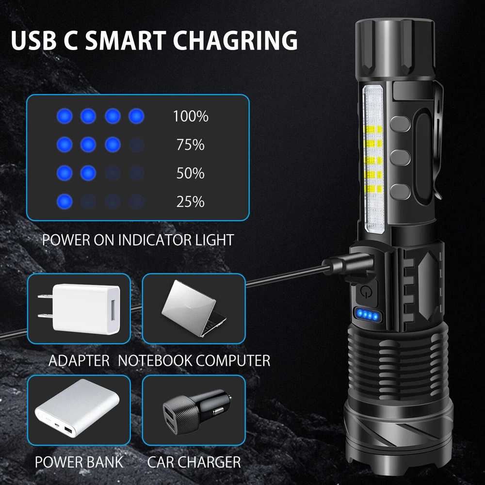 About this item 【Super Bright Flashlight】:The super bright handheld flashlight comes with 7 light modes, and COB light is designed on the side. Built-in 10 LEDs white light, 4 LEDs red light and 4 LEDs blue light, the front light can change 3 light modes and the COB side light can change 4 light modes. and very suitable for home, camping, hiking, outdoor or emergency situations. Etc 【Flashlight to Adjust Light Distance】: The head of the flashlight is zoomable and used to adjust the lighting distance. When the flashlight head is not extended, the lighting area is large and the lighting distance is approximately 3300 feet. When the flashlight head is extended, the lighting area becomes smaller, but the lighting distance is approximately 3900 feet. Can be used to view the status of areas further away. 【Power Display & 5-12 Hours Long Lasting Illumination】: The flashlight has a display on the side to show you how much power of the flashlight during using, the package includes a charging cable for you and the charging port is also designed with a waterproof rubber cover. The runtime of the flashlight is up to 12 hours in low work mode and 5-7 hours in a high work mode. 【Easy to Carry】: Led flashlight is equipped with lanyard and flashlight pouches, which can be hung on the side of the backpack or put into the backpack for easy carrying.flashlights also come with removable pocket clip ,Easily attach to your pocket , hat or belt. 【Waterproof for Heavy Rain Weather】: The Handheld flashlight is waterproof,this waterproof flashlight non-slip, shockproof, waterproof, rainproof, dustproof, can be used in camping, hiking and others Rain, snow or other outdoor emergency situations.