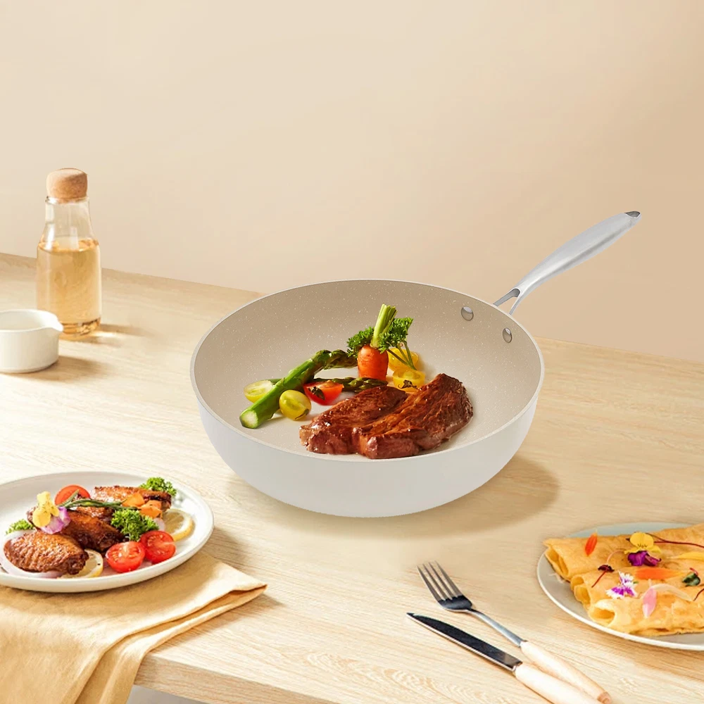 Specification Material: Aluminum, Stainless Steel, Silicone Color: Milky White Process: Medical Stone Coating Style: Modern Assembly Required: No Mounting Type: Tabletop Capacity: 4.8L/162.33oz Mouth Diameter: 30cm/11.81in Depth: 9.5cm/3.74in Lid Height: 15cm/5.9in Applicable Number of People: 4-6 Package Size: 54*37*14cm/21.26*14.57*5.51in Gross Weight: 2.6kg/5.73lbs Net Weight: 2.4kg/5.29lbs Package Included 1* Frying Pot with Lid 1* Spatula 30cm Medical Stone Nonstick Frying Pot Skillet with Lid, Healthy Chef Pot 4.8L Description Traditional iron or stainless steel frying pots can cause your food to stick to the pots, but our non-stick pot is a good solution to this problem. It is an efficient cooking tool that combines natural medical stone coating with modern non-stick technology, combining natural beauty and practicality, aiming to bring you a healthy and relaxing cooking experience, whether it's sauteing, stir-frying, or stewing. Key Features Made to Last: Our product consists of a high-quality aluminum pot with a stainless steel handle, treated with a medical stone coating that is sturdy and heat-resistant , non-stick and stain-resistant , ensuring long-term beauty and practicality. Excellent Performance: This product uses a high-fold heat circulation layer, a heat-conducting alloy layer, a sturdy wear-resistant base layer, and pebble-suspended microparticles to make it heat up quickly, and it also achieves a double non-stick effect inside and out. Efficient Cooking: Without the steam outlet on the lid of this product, this product makes a stronger seal between the lid and the pot, forming a good seal and internal circulation mechanism for steam, which can cook food evenly and quickly while also maintaining the temperature of the food and preserving its flavor. Large Capacity: The 3.74-inch deepening pot and large capacity of 162.33oz can cook enough food for 4-6 people at one time, thus satisfying you and your family's eating needs. Safe & Healthy to Use: This product is PFOA-free to reduce the hazards of grease and smoke, making it convenient for you to prepare safe and healthy food while maintaining its non-stick properties. Exquisite Appearance: The smooth milky white surface and smooth lines with silver handles and a pebble-shaped cover bead make it elegant and classy, adding a bright landscape to your kitchen as well. Effortless Cleaning: Its smooth surface and non-stick coating make it less likely to accumulate grease, making it easy for you to clean and maintain. Ideal Gift: With good performance and a modern appearance, it can be used as an ideal housewarming gift for parents, friends, and lovers so that they can also enjoy more delicious and healthy food. Good Customer Service: We aim to provide quality products and services. If you have problems, please feel free to contact us. We will reply and solve the problem for you as soon as possible. Details Anti-scald Handle: The stainless steel handle has good insulation and heat resistance to improve your safety. Threaded Bottom: This design makes it more wear-resistant and non-slip , enhancing its practicality. Application This product is suitable for gas cooktops, induction cooktops, electric ceramic ovens, etc. This pot can be used for sauteing, stir-frying, braising, and boiling. Specification Material: Aluminum, Stainless Steel, Silicone Color: Milky White Process: Medical Stone Coating Style: Modern Assembly Required: No Mounting Type: Tabletop Capacity: 4.8L/162.33oz Mouth Diameter: 30cm/11.81in Depth: 9.5cm/3.74in Lid Height: 15cm/5.9in Applicable Number of People: 4-6 Package Size: 54*37*14cm/21.26*14.57*5.51in Gross Weight: 2.6kg/5.73lbs Net Weight: 2.4kg/5.29lbs Package Included 1* Frying Pot with Lid 1* Spatula Notes Please do not allow the oil temperature to rise above 392℉. Please do not use hard materials such as steel wire balls to clean the cookware. The pot is dry in the first stage, it is recommended not to cook noodles or starchy food, and the operation will be better in the later stage. It is recommended that you control the fire when you use it, use medium fire for stir-frying vegetables, and use low fire for frying meat and sautéing things. products support the use of a new induction cooker, the old induction cooker may not be recognized, the general stir-fry heat acceptance range of 1200w ~ 1800w. Due to the bottom of the pot's heat capacity, it is recommended that no more than 2000w. The gas cooking stove is recommended to be used with low to medium heat. Please note that the gas stove itself has a floating fire extinguished situation, it is recommended to do dishes in a timely manner after cleaning the pot and pot surface, to avoid leaving stains in the second fire extinguished caused by adsorption to strengthen the stains caused by the difficult to clean the phenomenon. (Normal circumstances can be avoided) Please put a little oil when using it to avoid empty and dry burning. Payment Delivery details Terms of sales About us Contact us Payment We accept ebay payment 。 Fees such as import duties, taxes are not included in the item price or shipping costs. These charges are the buyer's responsibility. Delivery details Shipping: 2-9 working days to: USA Terms of sales We maintain high standards of excellence and strive for hundred percent customer satisfaction. Feedback is very important to us. We hope that you contact us immediately before you give neutral or negative feedback, so that we can address your concerns. It is impossible to address issues if we do not know about them! About us Your satis faction is our ultimate goal. We work hard to earn your trust and future business. Our certified technicians have tested each item before shipping. The unit comes with 1 year limited warranty on all manufacturing defects. a) If you receive a defective item, you may return it or ask for a discount. Please contact us within 14 days after you receive the package. b) What you returned must be intact and in