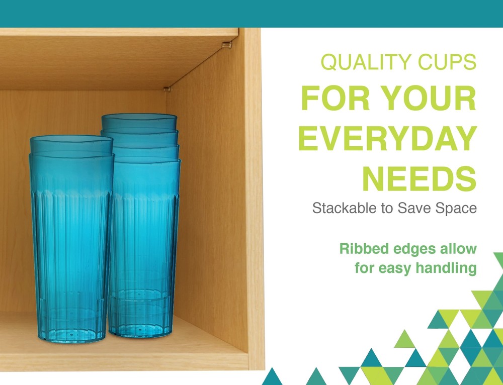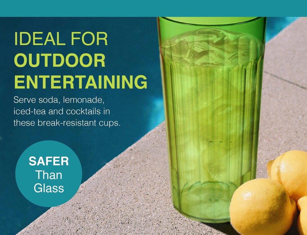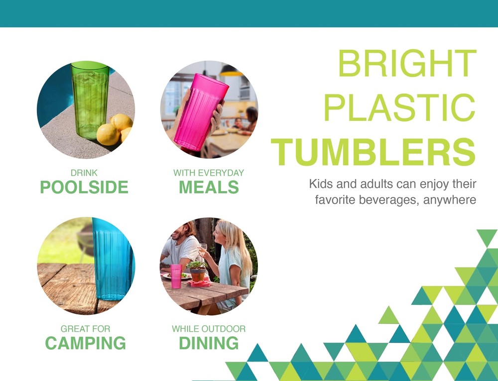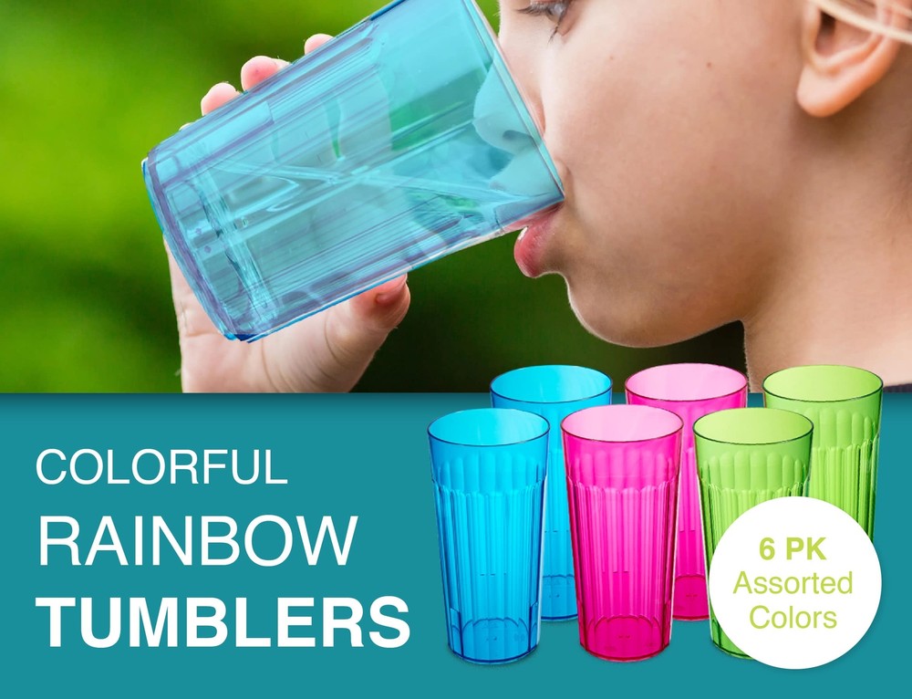Reusable Plastic 30 oz Tumbler Set - Serving drinks has never been easier with these family friendly, break-resistant plastic drinking cups. Includes 6 cups in bright Rainbow colors (assorted, as pictured). Perfect for kids and outdoor drinks. Must-Have Features - Our BPA free plastic tumblers are MADE IN THE USA, dishwasher safe, stackable, reusable, break resistant and durable. Please note that the ideal capacity of each 30oz tumbler is 26 ounces, to reduce spillage. Ideal for Entertaining - Safer than glass tumblers, kids and adults can enjoy their favorite beverages, anywhere. Ditch the disposable cups, these fun plastic drinking glasses are ideal for everyday meals at home, as well as at the pool, outdoor dining and camping. Quality Cups for Your Everyday Needs - Made with a glass-like appearance, with the convenience of plastic. Stackable to save space, they fit easily in your cupboard when not in use. Each tumbler measures 7.25 x 3.75 inches. Bright Plastic Tumblers - Serve soda, lemonade, iced-tea and cocktails. Ideal cups for parties, cookouts and even on the boat. Ribbed edges allow for easy handling, alongside a tapered profile.