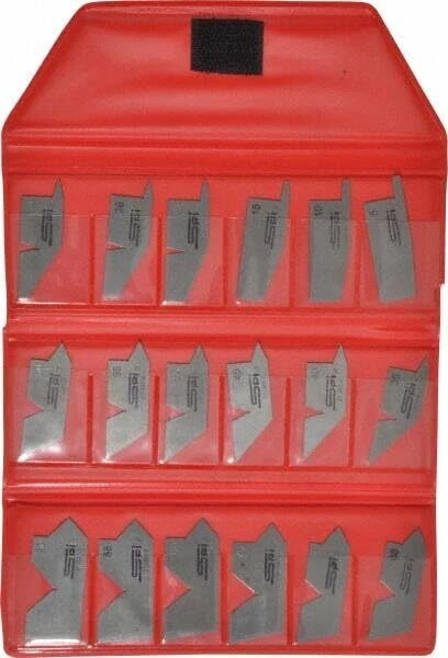 31-375-9 Stainless Steel Angle Gage Set: 18 Pieces from 6 to 90 degree Primary Angles. Use for quick and accurate of inspection of angles and ID or OD chamfers. 18 individual gages for easy use. Each gage has 8 gaging surfaces. Precision finished edges for accurate checking. Each gage checks primary, 1/2 primary, and complementary angles. Sharp cornered workpieces can be checked at all 8 angles except below 50 degrees on primary angle 2. Set includes handy vinyl pouch. Stainless steel angle gauge set: 18 pieces from 6 to 90 degree primary angles Use for quick and accurate of inspection of angles and ID or OD chamfers 18 individual gages for easy use. Each gage has 8 gaging surfaces. Precision finished edges for accurate checking. Each gage checks primary, 1/2 primary, and complementary angles. Sharp cornered workpieces can be checked at all 8 angles except below 50 degrees on primary angle 2