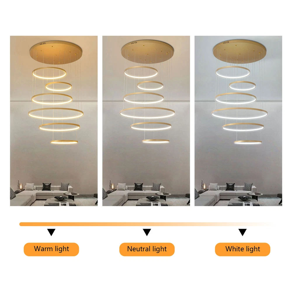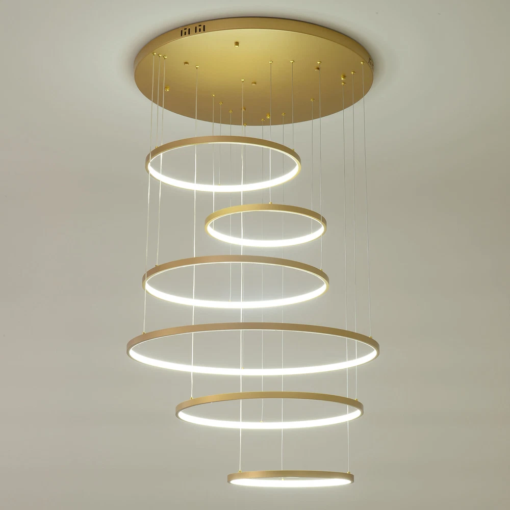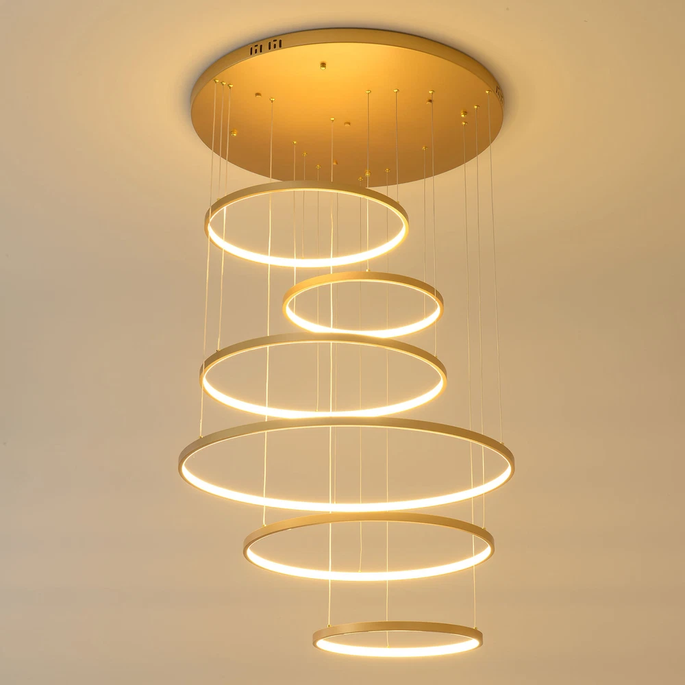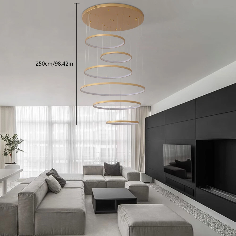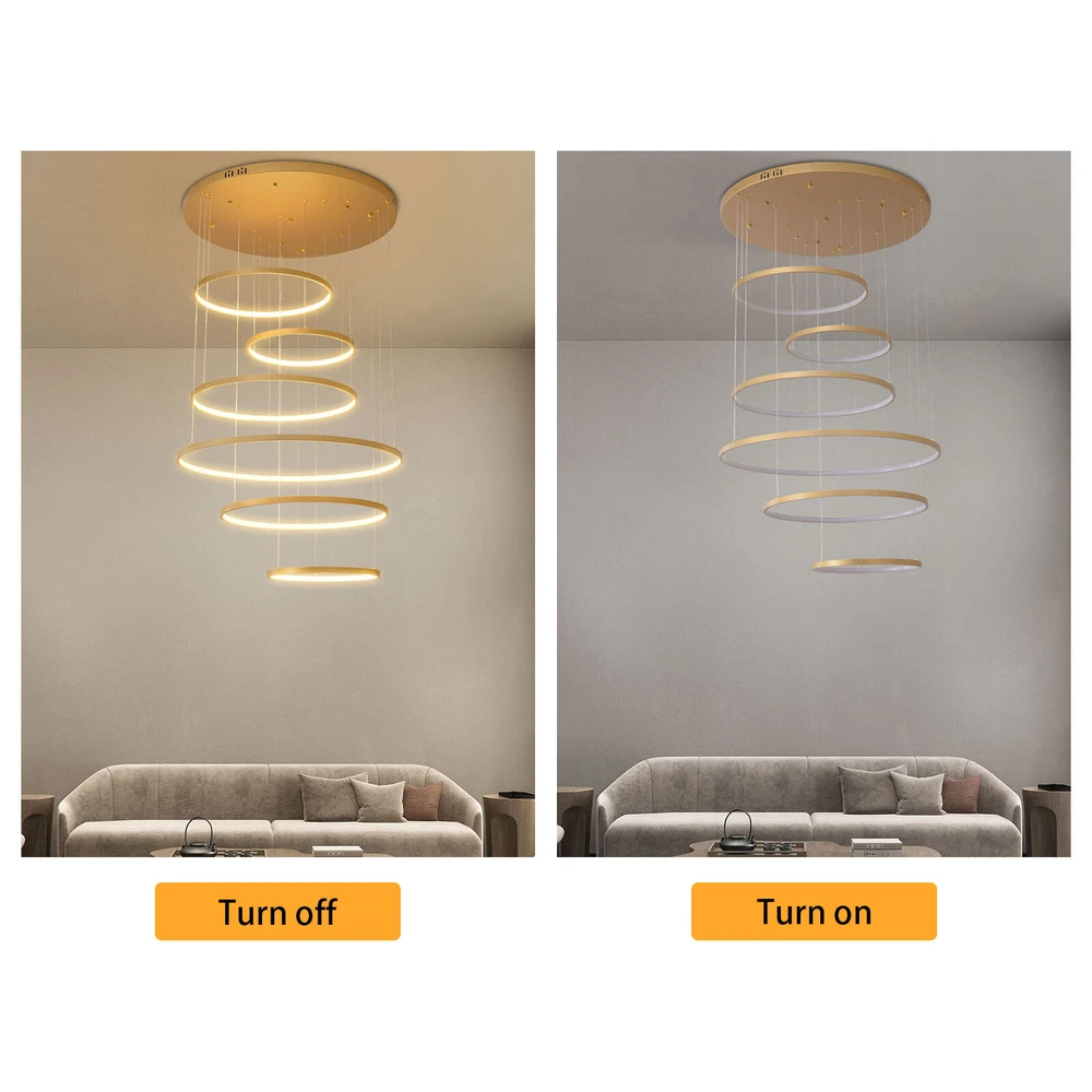 Specifications Color: Gold Material: Hardware+Aluminum+Silicone Surface Treatment: High-temperature Baking Paint Style: Modern Efficiency: E Light Fixture Form: Chandelier Specific Uses For Product: ‎Indoor Use Only Control Method: ‎Remote(Included), Wall Switch(Not Included) Light Source Type: 6* LED Rings(Included) Battery Type: 2*AAA Batteries(Not Included) Brightness: Infinitely Adjustable Light Color: White Light, Neutral Light, Warm light Shape: Circular Assembly Required: Yes Switch Installation Type: Ceiling Mount Remote Control Distance: About 30m/98.43ft Color Temperature Range: 3000K-6500K Voltage: 95-245V Power: 104W Number of Rings: 6 Package Included 1* 6-Ring Chandelier 1* Remote Control 4*Screws WELCOME~ Description This 6 ring chandelier will not only bring warmth and illumination to your surroundings, but will also add a stylish touch to your interior design. It can be adjusted in height according to your specific requirements and preferences. With its excellent LED light source, remote control, infinite dimming and adjustable light colors, you will enjoy a bright and convenient life. Key Features Long Service Life : The aluminum, hardware and silicone have high strength, good toughness, and good formability and the high-temperature baking paint process makes it waterproof, rust-proof, and corrosion-resistant, so you can use it for a long time without frequent replacement. Excellent Light Source: The environment-friendly and energy-saving LED light with high color index can effectively avoid glare and stroboscopic, protect your eyes, restore the most authentic color of objects, serve an area of 269.1-322.92ft², and save your costs. Carefully Designed: The infinitely adjustable brightness and three types of lighting (warm, natural, and white) fully meet your usage needs in different scenarios, making it more convenient. Embrace Smart Life: Applied with remote control, you can easily adjust the light colors while lying in bed and don't need to get up and press the switch within about 98.43ft, bringing more convenience to your life. Adjustable Height: You can easily adjust the hanging wire of the 6 rings, which can be adjusted within 4.92ft to adapt to different ceiling heights, meet your different needs, and create your own unique lighting. Safety Guard: The multiple heat dissipation holes on the base and wide voltage (95-245V) design can effectively ensure safety and extend product life, so you can use it with confidence. Unique Appearance: The bright gold color with different sized rings is stylish and simple, integrating completely with different home decor styles, enhancing taste and becoming an eye-catching decorative item. 6 rings hang down from the ceiling panel like bubbles, adding a bit of elegance and fashion. Excellent Gift: The beautiful appearance and good practicality make it a great gift for parents, friends, and lovers on birthdays and holidays. Easy Clean-up: The simple structure and smooth surface provided by high-quality materials and craftsmanship let you easily wipe it clean with a towel When dust accumulates. Guaranteed Customer Service: We aim to provide quality products and services. If you have problems, please feel free to contact us. We will reply and solve the problem for you as soon as possible. Details Round Base: The large round base (31.5nches) increases stress area, and can make the item fixed firm without falling easily. Smooth Edge: The rounded and smooth edges not only add to the aesthetics of the product but also improve the safety of use. Application With a lighting area of 269.1-322.92ft², it is suitable for indoor lighting in bedrooms, living rooms, kitchens, dining rooms, corridors, aisles, balconies, study rooms, reading rooms, living rooms, cafes, stores, bars, offices, lounges, libraries, clubs, hotels and so on. Specifications Color: Gold Material: Hardware+Aluminum+Silicone Surface Treatment: High-temperature Baking Paint Style: Modern Efficiency: E Light Fixture Form: Chandelier Specific Uses For Product: ‎Indoor Use Only Control Method: ‎Remote(Included), Wall Switch(Not Included) Light Source Type: 6* LED Rings(Included) Battery Type: 2*AAA Batteries(Not Included) Brightness: Infinitely Adjustable Light Color: White Light, Neutral Light, Warm light Shape: Circular Assembly Required: Yes Switch Installation Type: Ceiling Mount Remote Control Distance: About 30m/98.43ft Color Temperature Range: 3000K-6500K Voltage: 95-245V Power: 104W Number of Rings: 6 Luminous Flux: 80lumen Adjustable Height: Within 1.5m/ 4.92ft Illuminated Area: 25-30m²/ 269.1-322.92ft² Suitable Floor Height: 3-4m/9.84-13.12ft Base Diameter: 80cm/31.5in Overall Product Height: 2.5m/ 8.2ft Ring Diameter: 50cm/ 19.69in, 40cm/15.75in, 60cm/23.62in, 80cm/ 31.5in Package Included 1* 6-Ring Chandelier 1* Remote Control 4*Screws Notes The wall switch and remote control batteries are not included in this package. You need to prepare 2 AAA batteries yourself. Please note that the product is not waterproof and should not be scrubbed with a wet cloth. Please use the lamp within the applicable voltage range and clean it regularly. Please cut off the power supply when you clean the light. Please wipe with a soft cotton cloth and do not use household cleaning agents. Please check the dimensions of the product before ordering to ensure it fits your home. Please make sure the power is cut off before installation. To ensure your safety, we recommend that two people install this lamp together. Please install it by someone with an electrical license if necessary. Please wear electric insulation gloves (not included) and avoid scratching the surface of the lamp and the electric wire when installing. Please use it in a dry environment. It is not suitable for outdoors and bathrooms. Please allow the slight color difference caused by the shooting light and 1-3cm error due to manual measurement, and make sure you do not mind before you order. Payment Delivery details 