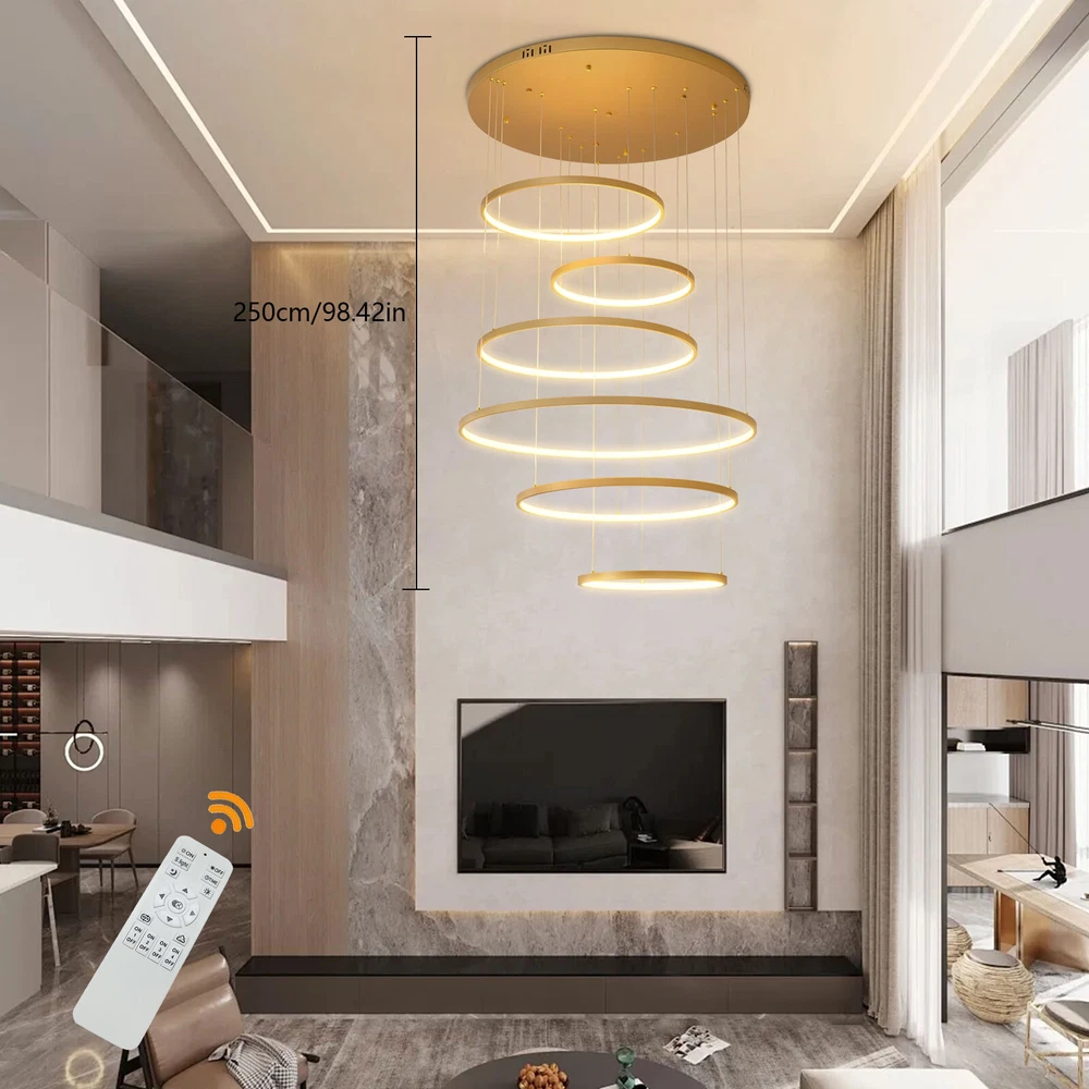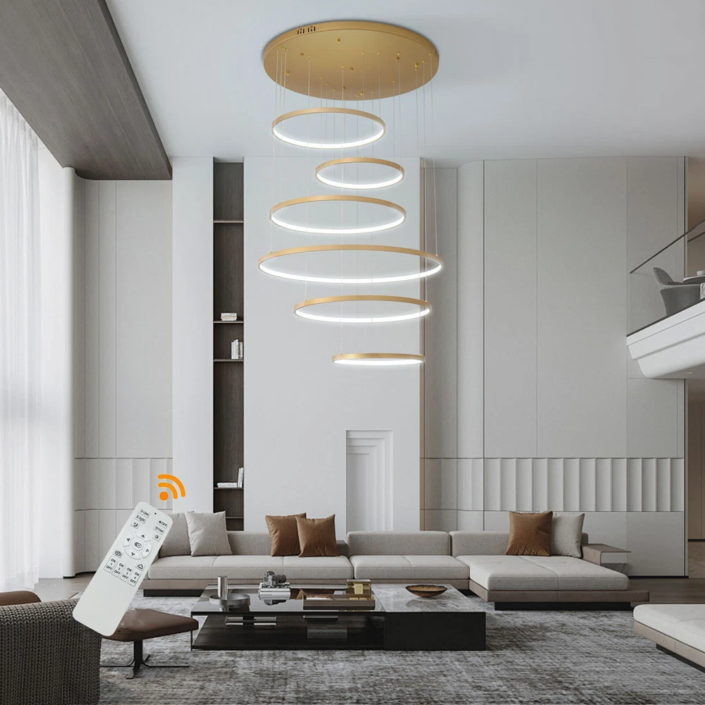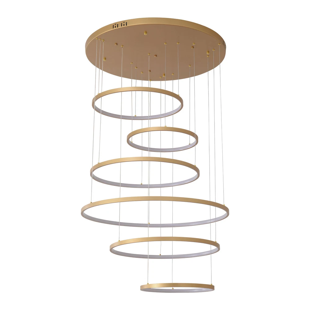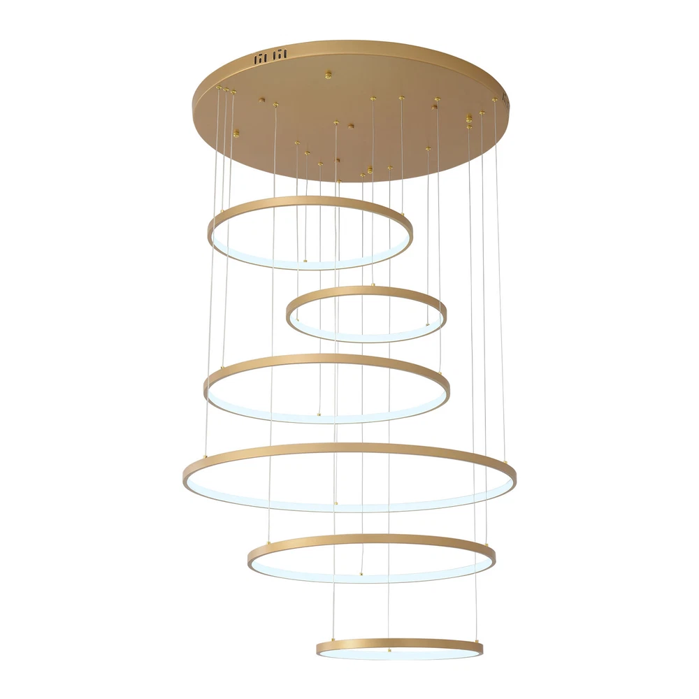 Specifications Color: Gold Material: Hardware+Aluminum+Silicone Surface Treatment: High-temperature Baking Paint Style: Modern Efficiency: E Light Fixture Form: Chandelier Specific Uses For Product: ‎Indoor Use Only Control Method: ‎Remote(Included), Wall Switch(Not Included) Light Source Type: 6* LED Rings(Included) Battery Type: 2*AAA Batteries(Not Included) Brightness: Infinitely Adjustable Light Color: White Light, Neutral Light, Warm light Shape: Circular Assembly Required: Yes Switch Installation Type: Ceiling Mount Remote Control Distance: About 30m/98.43ft Color Temperature Range: 3000K-6500K Voltage: 95-245V Power: 104W Number of Rings: 6 Package Included 1* 6-Ring Chandelier 1* Remote Control 4*Screws WELCOME~ Description This 6 ring chandelier will not only bring warmth and illumination to your surroundings, but will also add a stylish touch to your interior design. It can be adjusted in height according to your specific requirements and preferences. With its excellent LED light source, remote control, infinite dimming and adjustable light colors, you will enjoy a bright and convenient life. Key Features Long Service Life : The aluminum, hardware and silicone have high strength, good toughness, and good formability and the high-temperature baking paint process makes it waterproof, rust-proof, and corrosion-resistant, so you can use it for a long time without frequent replacement. Excellent Light Source: The environment-friendly and energy-saving LED light with high color index can effectively avoid glare and stroboscopic, protect your eyes, restore the most authentic color of objects, serve an area of 269.1-322.92ft², and save your costs. Carefully Designed: The infinitely adjustable brightness and three types of lighting (warm, natural, and white) fully meet your usage needs in different scenarios, making it more convenient. Embrace Smart Life: Applied with remote control, you can easily adjust the light colors while lying in bed and don't need to get up and press the switch within about 98.43ft, bringing more convenience to your life. Adjustable Height: You can easily adjust the hanging wire of the 6 rings, which can be adjusted within 4.92ft to adapt to different ceiling heights, meet your different needs, and create your own unique lighting. Safety Guard: The multiple heat dissipation holes on the base and wide voltage (95-245V) design can effectively ensure safety and extend product life, so you can use it with confidence. Unique Appearance: The bright gold color with different sized rings is stylish and simple, integrating completely with different home decor styles, enhancing taste and becoming an eye-catching decorative item. 6 rings hang down from the ceiling panel like bubbles, adding a bit of elegance and fashion. Excellent Gift: The beautiful appearance and good practicality make it a great gift for parents, friends, and lovers on birthdays and holidays. Easy Clean-up: The simple structure and smooth surface provided by high-quality materials and craftsmanship let you easily wipe it clean with a towel When dust accumulates. Guaranteed Customer Service: We aim to provide quality products and services. If you have problems, please feel free to contact us. We will reply and solve the problem for you as soon as possible. Details Round Base: The large round base (31.5nches) increases stress area, and can make the item fixed firm without falling easily. Smooth Edge: The rounded and smooth edges not only add to the aesthetics of the product but also improve the safety of use. Application With a lighting area of 269.1-322.92ft², it is suitable for indoor lighting in bedrooms, living rooms, kitchens, dining rooms, corridors, aisles, balconies, study rooms, reading rooms, living rooms, cafes, stores, bars, offices, lounges, libraries, clubs, hotels and so on. Specifications Color: Gold Material: Hardware+Aluminum+Silicone Surface Treatment: High-temperature Baking Paint Style: Modern Efficiency: E Light Fixture Form: Chandelier Specific Uses For Product: ‎Indoor Use Only Control Method: ‎Remote(Included), Wall Switch(Not Included) Light Source Type: 6* LED Rings(Included) Battery Type: 2*AAA Batteries(Not Included) Brightness: Infinitely Adjustable Light Color: White Light, Neutral Light, Warm light Shape: Circular Assembly Required: Yes Switch Installation Type: Ceiling Mount Remote Control Distance: About 30m/98.43ft Color Temperature Range: 3000K-6500K Voltage: 95-245V Power: 104W Number of Rings: 6 Luminous Flux: 80lumen Adjustable Height: Within 1.5m/ 4.92ft Illuminated Area: 25-30m²/ 269.1-322.92ft² Suitable Floor Height: 3-4m/9.84-13.12ft Base Diameter: 80cm/31.5in Overall Product Height: 2.5m/ 8.2ft Ring Diameter: 50cm/ 19.69in, 40cm/15.75in, 60cm/23.62in, 80cm/ 31.5in Package Included 1* 6-Ring Chandelier 1* Remote Control 4*Screws Notes The wall switch and remote control batteries are not included in this package. You need to prepare 2 AAA batteries yourself. Please note that the product is not waterproof and should not be scrubbed with a wet cloth. Please use the lamp within the applicable voltage range and clean it regularly. Please cut off the power supply when you clean the light. Please wipe with a soft cotton cloth and do not use household cleaning agents. Please check the dimensions of the product before ordering to ensure it fits your home. Please make sure the power is cut off before installation. To ensure your safety, we recommend that two people install this lamp together. Please install it by someone with an electrical license if necessary. Please wear electric insulation gloves (not included) and avoid scratching the surface of the lamp and the electric wire when installing. Please use it in a dry environment. It is not suitable for outdoors and bathrooms. Please allow the slight color difference caused by the shooting light and 1-3cm error due to manual measurement, and make sure you do not mind before you order. Payment Delivery details 