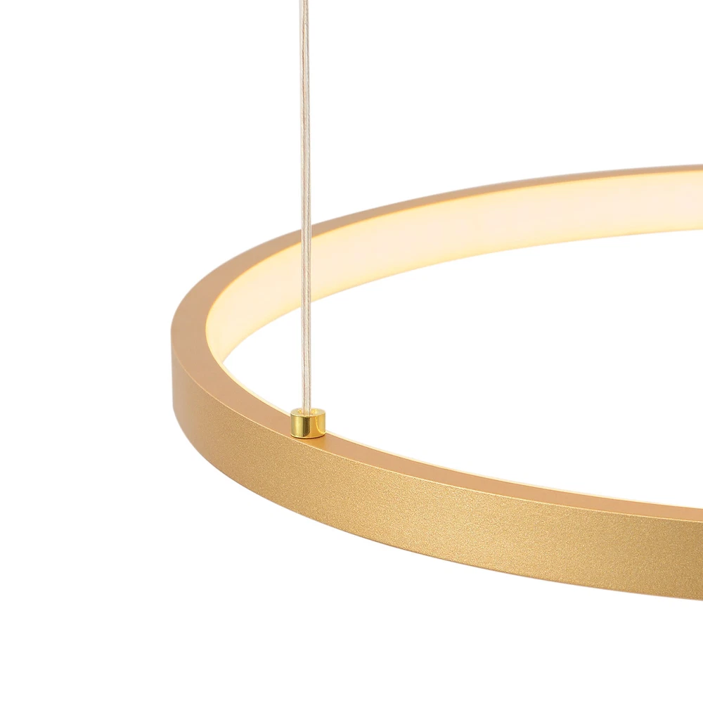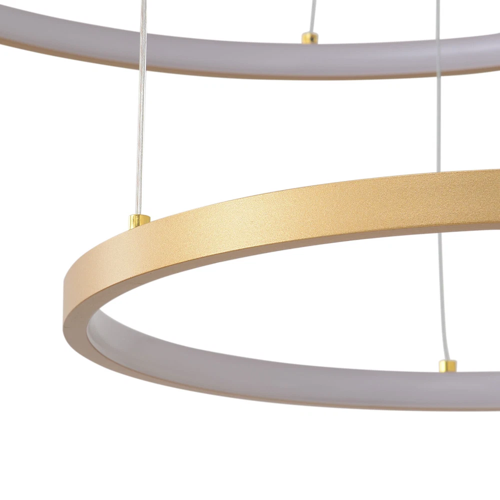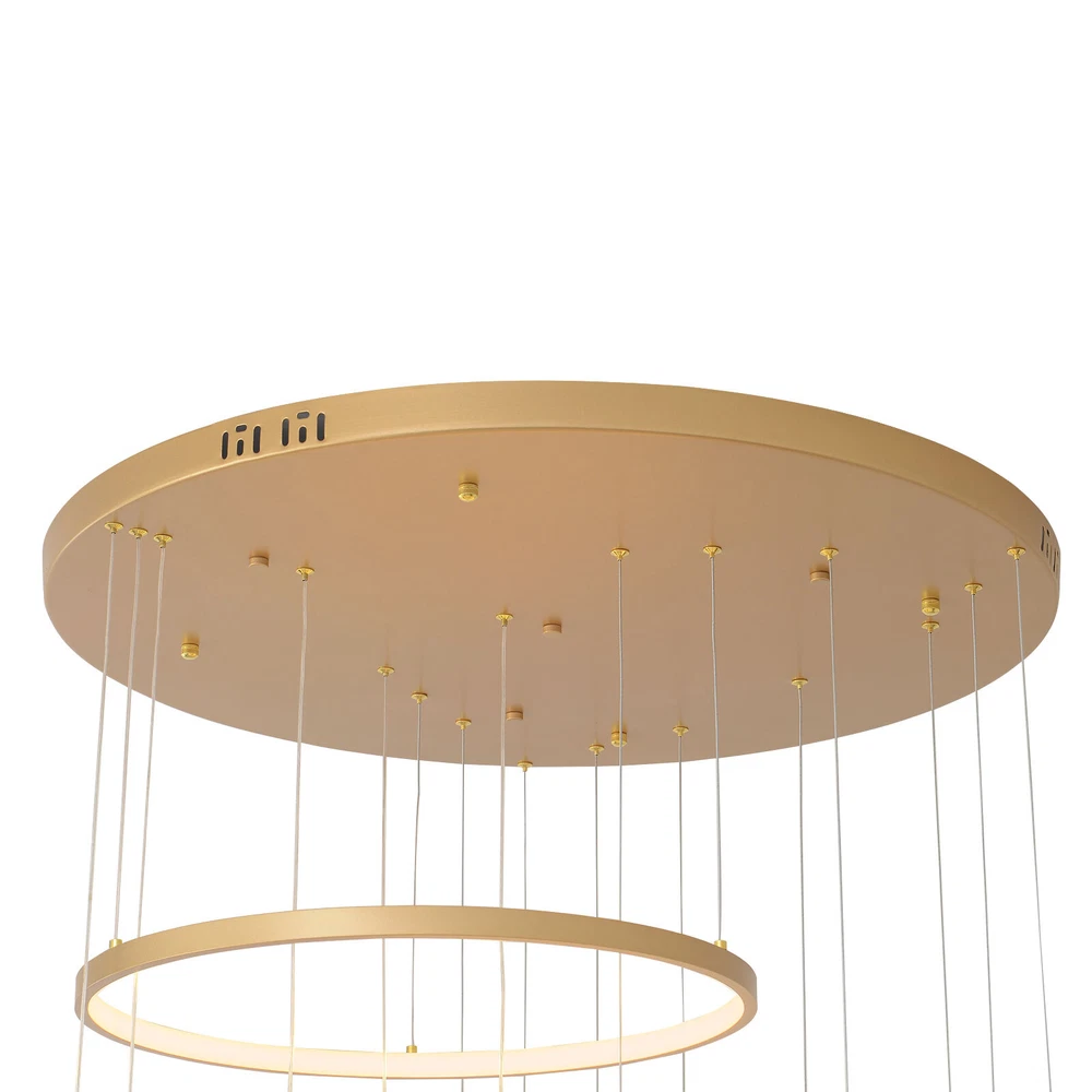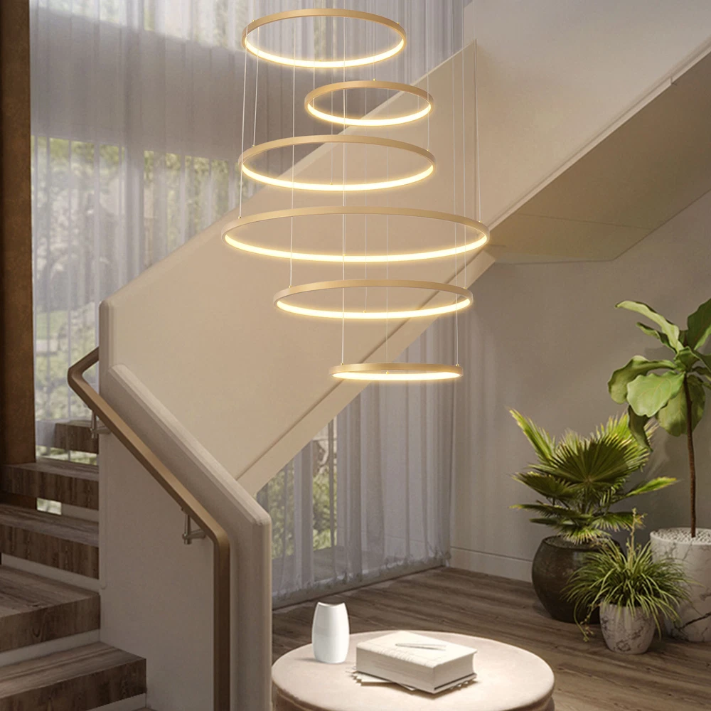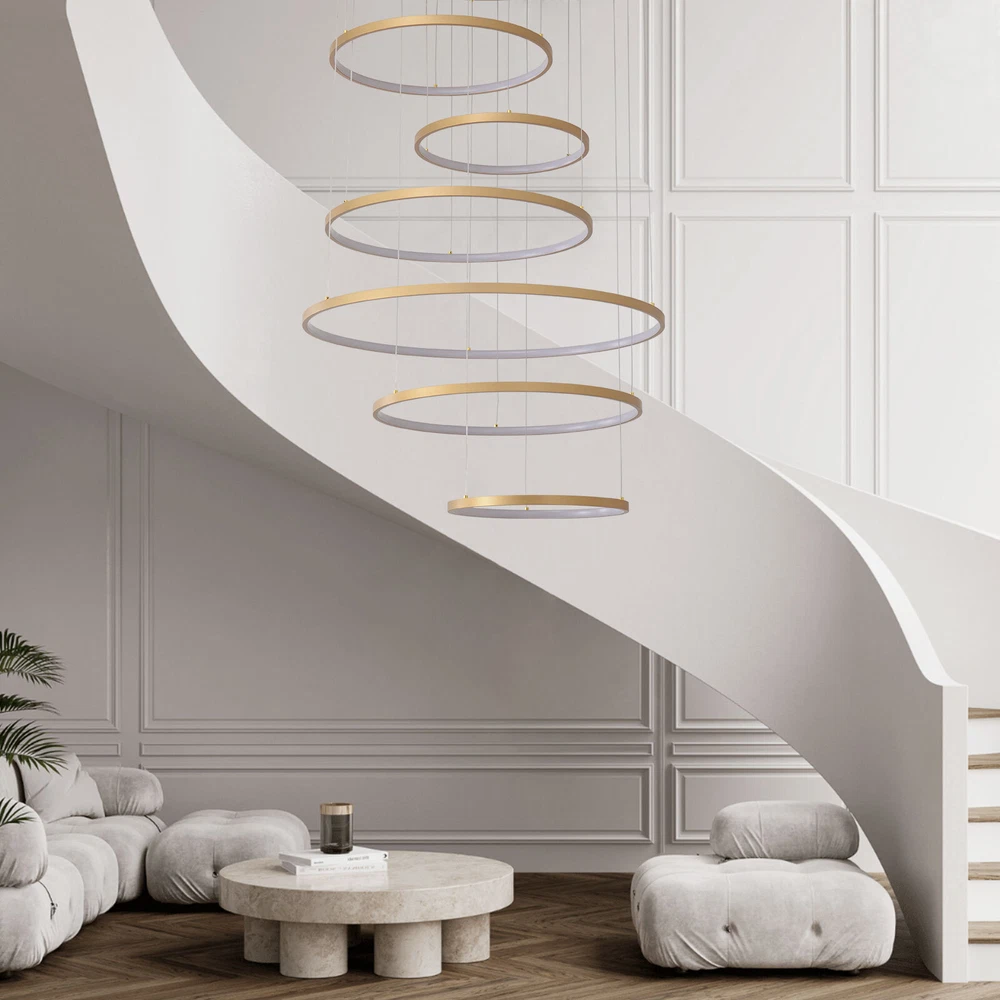 Specifications Color: Gold Material: Hardware+Aluminum+Silicone Surface Treatment: High-temperature Baking Paint Style: Modern Efficiency: E Light Fixture Form: Chandelier Specific Uses For Product: ‎Indoor Use Only Control Method: ‎Remote(Included), Wall Switch(Not Included) Light Source Type: 6* LED Rings(Included) Battery Type: 2*AAA Batteries(Not Included) Brightness: Infinitely Adjustable Light Color: White Light, Neutral Light, Warm light Shape: Circular Assembly Required: Yes Switch Installation Type: Ceiling Mount Remote Control Distance: About 30m/98.43ft Color Temperature Range: 3000K-6500K Voltage: 95-245V Power: 104W Number of Rings: 6 Package Included 1* 6-Ring Chandelier 1* Remote Control 4*Screws WELCOME~ Description This 6 ring chandelier will not only bring warmth and illumination to your surroundings, but will also add a stylish touch to your interior design. It can be adjusted in height according to your specific requirements and preferences. With its excellent LED light source, remote control, infinite dimming and adjustable light colors, you will enjoy a bright and convenient life. Key Features Long Service Life : The aluminum, hardware and silicone have high strength, good toughness, and good formability and the high-temperature baking paint process makes it waterproof, rust-proof, and corrosion-resistant, so you can use it for a long time without frequent replacement. Excellent Light Source: The environment-friendly and energy-saving LED light with high color index can effectively avoid glare and stroboscopic, protect your eyes, restore the most authentic color of objects, serve an area of 269.1-322.92ft², and save your costs. Carefully Designed: The infinitely adjustable brightness and three types of lighting (warm, natural, and white) fully meet your usage needs in different scenarios, making it more convenient. Embrace Smart Life: Applied with remote control, you can easily adjust the light colors while lying in bed and don't need to get up and press the switch within about 98.43ft, bringing more convenience to your life. Adjustable Height: You can easily adjust the hanging wire of the 6 rings, which can be adjusted within 4.92ft to adapt to different ceiling heights, meet your different needs, and create your own unique lighting. Safety Guard: The multiple heat dissipation holes on the base and wide voltage (95-245V) design can effectively ensure safety and extend product life, so you can use it with confidence. Unique Appearance: The bright gold color with different sized rings is stylish and simple, integrating completely with different home decor styles, enhancing taste and becoming an eye-catching decorative item. 6 rings hang down from the ceiling panel like bubbles, adding a bit of elegance and fashion. Excellent Gift: The beautiful appearance and good practicality make it a great gift for parents, friends, and lovers on birthdays and holidays. Easy Clean-up: The simple structure and smooth surface provided by high-quality materials and craftsmanship let you easily wipe it clean with a towel When dust accumulates. Guaranteed Customer Service: We aim to provide quality products and services. If you have problems, please feel free to contact us. We will reply and solve the problem for you as soon as possible. Details Round Base: The large round base (31.5nches) increases stress area, and can make the item fixed firm without falling easily. Smooth Edge: The rounded and smooth edges not only add to the aesthetics of the product but also improve the safety of use. Application With a lighting area of 269.1-322.92ft², it is suitable for indoor lighting in bedrooms, living rooms, kitchens, dining rooms, corridors, aisles, balconies, study rooms, reading rooms, living rooms, cafes, stores, bars, offices, lounges, libraries, clubs, hotels and so on. Specifications Color: Gold Material: Hardware+Aluminum+Silicone Surface Treatment: High-temperature Baking Paint Style: Modern Efficiency: E Light Fixture Form: Chandelier Specific Uses For Product: ‎Indoor Use Only Control Method: ‎Remote(Included), Wall Switch(Not Included) Light Source Type: 6* LED Rings(Included) Battery Type: 2*AAA Batteries(Not Included) Brightness: Infinitely Adjustable Light Color: White Light, Neutral Light, Warm light Shape: Circular Assembly Required: Yes Switch Installation Type: Ceiling Mount Remote Control Distance: About 30m/98.43ft Color Temperature Range: 3000K-6500K Voltage: 95-245V Power: 104W Number of Rings: 6 Luminous Flux: 80lumen Adjustable Height: Within 1.5m/ 4.92ft Illuminated Area: 25-30m²/ 269.1-322.92ft² Suitable Floor Height: 3-4m/9.84-13.12ft Base Diameter: 80cm/31.5in Overall Product Height: 2.5m/ 8.2ft Ring Diameter: 50cm/ 19.69in, 40cm/15.75in, 60cm/23.62in, 80cm/ 31.5in Package Included 1* 6-Ring Chandelier 1* Remote Control 4*Screws Notes The wall switch and remote control batteries are not included in this package. You need to prepare 2 AAA batteries yourself. Please note that the product is not waterproof and should not be scrubbed with a wet cloth. Please use the lamp within the applicable voltage range and clean it regularly. Please cut off the power supply when you clean the light. Please wipe with a soft cotton cloth and do not use household cleaning agents. Please check the dimensions of the product before ordering to ensure it fits your home. Please make sure the power is cut off before installation. To ensure your safety, we recommend that two people install this lamp together. Please install it by someone with an electrical license if necessary. Please wear electric insulation gloves (not included) and avoid scratching the surface of the lamp and the electric wire when installing. Please use it in a dry environment. It is not suitable for outdoors and bathrooms. Please allow the slight color difference caused by the shooting light and 1-3cm error due to manual measurement, and make sure you do not mind before you order. Payment Delivery details 