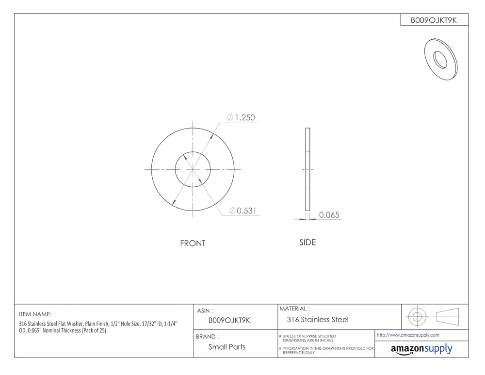 Flat washer provides a bearing surface for fastener load distribution or acts as a spacer 316 stainless steel provides strength and better corrosion resistance than 18-8 stainless steel Plain surface has no finish Country of origin: China