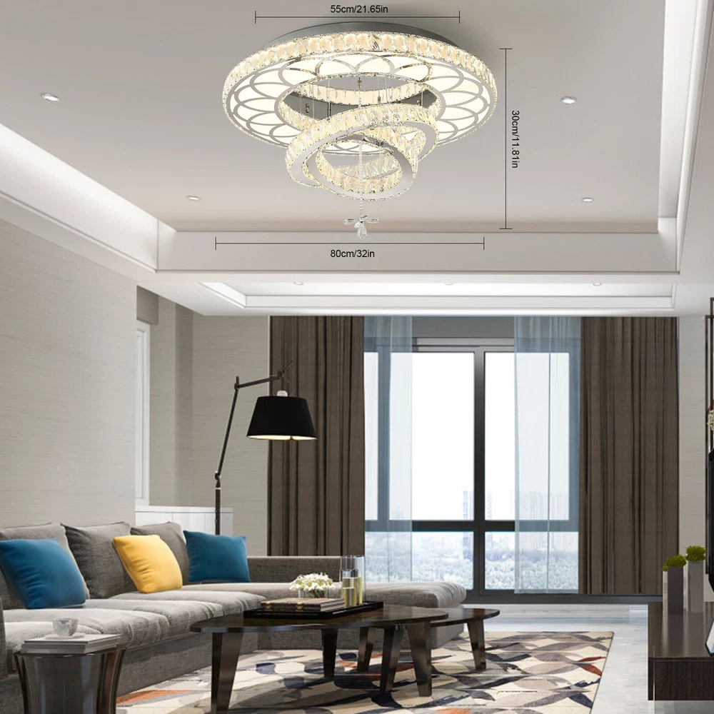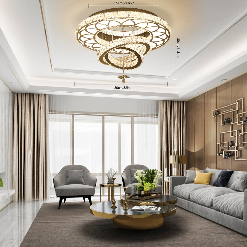 Specification Model: YL092 Color: White, Clear Material: Iron, Stainless Steel, Crystal Style: Modern Shape: Round Rated Voltage: 110-240V Rated Power: 80W Plug Type: US Standard Light Source Type: LED (Included) Light Color: White, Neutral, Warm Light Color Teperature: 3000K-4500K-6000K CRI: >85 Timing: 0.5h/1h Service Time: About 30000h Luminous Flux: 4550 Lumen Efficiency: A+ Brightness: From 5% to 100% (Stepless Adjustment) Battery Type: 2* AAA Batteries (Not Included) Control Method: Remote Control Mount Type: Ceiling Mount Applicable Area: 15-25m²/161.46-269ft² Maximum Remote Control Distance: 3m/9ft Number of LED Lights: 4 Assembly Required: Yes Product Height: 60cm/23.6inch Product Length: 80cm/32inch 32'' LED Crystal Chandelier Luxury Villa Living Room Long Hall Light Fixture US 32 inch Modern Large Crystal Chandelier Round Ring Dimmable Living Room Lamp US Specification Model: YL092 Color: White, Clear Material: Iron, Stainless Steel, Crystal Style: Modern Shape: Round Rated Voltage: 110-240V Rated Power: 80W Plug Type: US Standard Light Source Type: LED (Included) Light Color: White, Neutral, Warm Light Color Teperature: 3000K-4500K-6000K CRI: >85 Timing: 0.5h/1h Service Time: About 30000h Luminous Flux: 4550 Lumen Efficiency: A+ Brightness: From 5% to 100% (Stepless Adjustment) Battery Type: 2* AAA Batteries (Not Included) Control Method: Remote Control Mount Type: Ceiling Mount Applicable Area: 15-25m²/161.46-269ft² Maximum Remote Control Distance: 3m/9ft Number of LED Lights: 4 Assembly Required: Yes Product Height: 60cm/23.6inch Product Length: 80cm/32inch Description Bright and colorful lights can bring charm and warmth to your room, and light up your life. Made of premium iron, stainless steel, and crystal, this round crystal ceiling light is strong and durable. With 4 LED lights and a built-in intelligent driver, it can create bright light with great safety. It will be a great addition to your house. Key Features Stylish&Luxious Exterior: The clear crystal and glossy metal complement each other to create a sense of beauty. Meanwhile, the annular shape makes this product look very luxurious, making it a good decorative piece to blend in with different decor styles and add color to the space. Great Durability : The stainless steel i s rust-resistant wit h hi gh strength, good toughness, and good formability. The crystal with high transparency is heat-resistant, strong, durable, and no t easy to deform. Versatile Look: You can press the lockwire equipment on the chassis to adjust the length of the suspension wire and change the shape to be cross, parallel and inclined. Adjustable Working Time: Y ou can control its working hours in advance (0.5/1 hour), which can bring you great convenience. Safer to Use: With a built-in intelligent driver, it can provide constant current protection, overload protection, low voltage protection, and short circuit protection, which is safe and reliable. Stepless Dimming: This light has three light colors ( White/ Neutral /Warm Light ) with a color temperature of 3000K-4500K-6000K . Meanwhile, the brightness can be adju sted infinitely from 5% to 100% to meet different light needs. Large Applicable Area: The item can serve an area of 15-25m²/161.46-269ft² . So you can feel the illumination over a considerable area. Memory Function: It can automatically memorize the color and brightness of the lamp, and keep consistent when it is used next time, which can avoid frequent settings and save a lot of energy. LED Light Source: The product uses four eye-friendly LED lights with a CRI of more than 85 and high brightness, which is energy-saving without dazzling and flashing, and allows you to experience more natural and bright colors. It can be used for about 30000 hours, saving your use cost. Excellent Gift: The beautiful appearance and good practicality make it a great gift for parents, friends, and lovers on birthdays and holidays. Protective Packaging: This product comes in a custom foa m that resists compression and falls t o prevent product damage in transit. Guaranteed Customer Service: We aim to provide quality products and services. If you have problems, please feel free to contact us. We will reply and solve the problem for you as soon as possible. Details Remote Control: It allows you to remotely control the timing, brightness, light color, etc within 3m/9ft, saving you lots of effort. Round Base: It increases stress area, and can make the ceiling light fixed firm without falling easily. A pplication It is suitable for the living room, dining room, study bedroom, small bedroom, conference room, and other places of 15-25m²/161.46-269ft². Package Included 1* Round Crystal Ceiling Light 1* Remote Control 1* English Manual All Accessories for Installation Notes Please check the dimensions of the product before ordering to ensure it fits your home. Please wear electric insulation gloves and avoid scratching the surface of the lamp plate and the electric wire when installing. Please make sure that the power supply has been cut off before installation, and conduct a power test before installation. Please note that the remote control distance is 3m/9.84ft, please aim at the ceiling lamp when using it. Please use the lamp within the applicable voltage range and clean lamps regularly. Please cut off the power supply when you clean the light or replace light bulbs. Please note that the batteries for the remote control are not included in the package, you need to prepare two AAA batteries yourself. Please read the manual completely before installation, pay particular attention to the safety instructions included, and use the product in strict accordance with the instructions. Please allow the slight color difference caused by the shooting light and 1-3cm error due to manual measurement, and make sure you do not mind before ordering. Dear friend, Welcome to my store . Wish you have a nice day and happy shopping. If you have any questions or more 