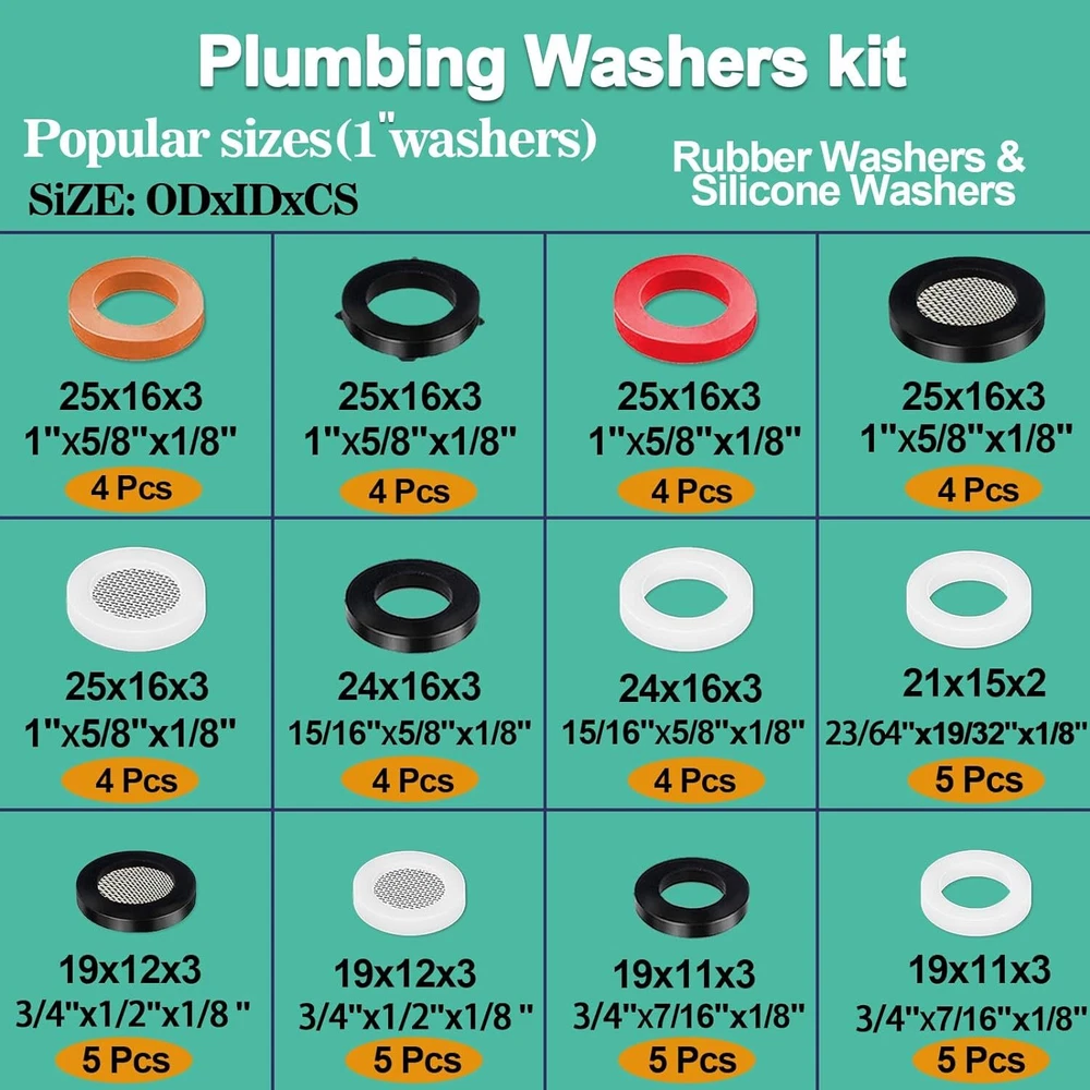 Store New Arrivals Add to Favorite View Feedback Contact 32 Size 705 Pcs Plumbing Washers and O-Ring Kit 2-In-1 Rubber Gasket Assortment Description Item model number 0656485265160 Style O-Ring and Plumbing Washers Color White and Black Material NBR (Nitrile Butadiene Rubber) Country of Origin China Nominal Inside Diameter 25 Millimeters Package Dimensions 10.31 x 5.24 x 0.91 inches; 6.5 ounces Is Discontinued By Manufacturer No Nominal Outside Diameter 1.44 Inches 2-in-1 Plumbing Faucet Repair Kit contains 20 rubber o-rings and 12 different Plumbing hose washer kits. Multiple sizes to meet your replacement needs Multiple Sizes: The o-ring assortment kit contains standard 20 metric rubber o-rings, o-ring I.D. x thickness: 3X1mm, 4X1mm, 4.5X1mm, 5X2mm, 6X2mm,:7X2mm, 8X2mm, 9X2mm, 10X2mm, 12X3mm, 13X3mm, 14X2.5mm, 16X2mm, 17X2.5 mm,18X2mm,18X4mm,20X2mm,22X2mm,25X2.4mm O-ring kits: black O-ring made of NBR material with excellent heat and oil resistance, used for sealing leakage repair of faucets, high pressure washers, hydraulic oil, hose sinks and faucet fittings Plumbing rubber washer repair kit outer size:1-7/32'', 1'',15/16'',14/16'',3/4'',1/2'',23/64'',very suitable for bathroom sink faucets, 1/2'' shower faucet hoses, standard 3/4'' garden hose separators, all kinds of RV faucet hoses, washing machine water supply line filter seal replacement Suitable for most plumbing repairs: most outdoor taps garden hoses that need repairing kitchen taps or bathroom sinks can find a solution in this product portfolio Product Description Common faucet repair kit Plumbing Washers Garden faucet quick connect port Plumbing Washers Water pipe connection port Faucet O-Ring Faucet O-Ring Seal Repair ABOUT US We offer the best prices around on high quality products. Our E-store includes media such as books, movies, music and games while offering electronics, toys, sporting apparel, clothing, tools, general home, garden items and more. SHIPPING We are always working hard to ensure your package arrives as soon as possible. Please understand that some factors like weather, high postal traffic, and the performance of shipping companies are outside of our control. We offer free shipping to the lower 48 states and ship within 2 business days of payment, usually sooner. We do not accept P.O. Boxes. Please provide a physical address. RETURNS We offer a 30-Day Return Policy on items which you are not completely satisfied with. You have the option for a full-refund or an exchange of the item. No returns are available on items shipped outside of the USA. PAYMENT We accept PayPal. CONTACT US This page content is yet to come Please ad us to your favorite seller and visit again later Thank You CUSTOMER SATISFACTION We try our very best to make sure every customer is completely satisfied. If there's a problem, message us! We're happy to help.