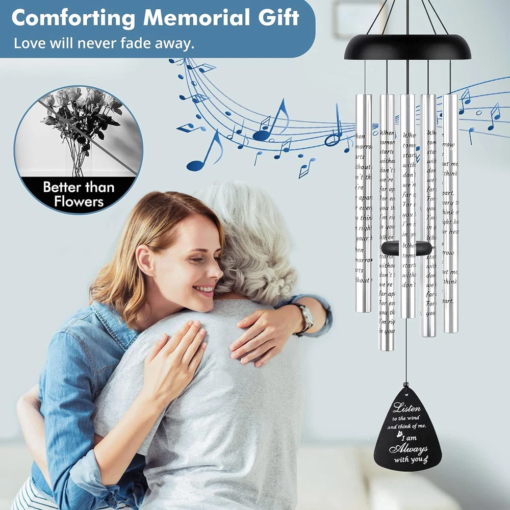 Sympathy Wind Chimes: It's really difficult to overcome the loss of a loved one. Words sometimes can be pale and nerveless for a grieving heart. Gifting our sympathy wind chimes will be a great way to say that you care from the heart Healing Poem Printed: Each tube is UV printed with a touching poem, “when tomorrow starts without me, don’t think we are far apart. For every time you think of me, I’m right here in your heart.” These moving words will bring comfort and support to help assuage the grief in loving memory. This is an ideal sympathy gift for a friend or family member in grief Memorial Gifts Ready to Gift: Wind chimes can be better than flowers. Flowers will fade away while wind chime will last long to accompany. This memorial wind chimes is well packaged in an elegant gift box, and covered nicely in wrapping paper. Each aluminum tube is secured in a protective film Exquisite Sympathy Card: This in memory of loved one gifts also comes with an exquisite sympathy card, which has the same heartfelt poem on it and blank on the back for your own loving message. An appropriate and thoughtful bereavement gifts for sympathy, remembrance, condolence and funeral Soothing Melody to Heal: Our wind chimes have a soothing and pure tone, playing relaxing and beautiful sound on the whims of the wind. When listening to it, tension and anxiety can be relieved, peace of mind will be regained, warm memories will be recalled to help fight over any loss or setback. Please click our video and enjoy the wonderful clear sound of our wind chimes Loving Memories to Recall: Gift this memorial wind chimes as best wishes to help deal with loss of mother, father or husband, siblings, etc. All the loving memories and happy time recalled by this wind chime will be remembered and treasured for a life time preciously Premium Material & Thoughtful Mute Mode: We adopt premium quality aluminum to craft this wind chimes for outside and cut no corners. 5 silver aluminum tubes are professionally anodized finished, rustproof and will keep bright as new. Unlike wood parts easy to crack, the top cap and the hook are made of powder coated aluminum, corrosion-resistant and able to hold up in the outdoor elements for years Perfect Garden Decor: Excellent decor choice for porches, patios, decks, terraces, balconies, and gardens. Just take a deep breath and relax. This breezy, playful wind chimes will add a peaceful background sound to help turn your outdoor space into a meditative oasis. The dense striker on the central string is adjustable to be upper and lower to get different tones, or even a mute mode whenever you need Proper Size Choice: Our wind chimes is of medium size, overall 32 inches, not too small like 19” or 24.5” or too large as 38” or 44 No Risk Purchase: If you have any questions or problems, please feel free to let us know, we will give you a 100% satisfactory solution ASAP to help Product Description Fabuday Sympathy Wind Chimes How we start My close friend lost her father the other day. I can tell that she was grieving and felt lonely although she did not express too much. I really wanted to comfort and delight her but words sometimes are so pale and nerveless. So I decided to gift her a wind chimes to heal. We listened to the wind chimes in silence for a while. Suddenly her tears rolled down and said thank you. I didn't say anything and just gave her a hug. And I knew , our hearts were so close at that moment. So I want to provide this loving keepsake, bring comfort and support to grieving hearts after loss of a loved one. Sympathy Gift to Say You Care From the Heart Heart Touching Sentiment Words On the wind catcher: "Listen to the wind and think of me. I am always with you." On the tubes: “when tomorrow starts without me, don’t think we are far apart. For every time you think of me, I’m right here in your heart.” Lasting Memorial Gifts, Better Than Flowers Flowers will fade away while wind chime will last long to accompany. Corrosion-resistant and able to hold up in the outdoor elements for years. Package Includes: Wind Chimes*1 Sympathy Card*1 Gift Box*1 Perfect Medium Size Excellent decor choice for porches, patios, decks, terraces, balconies, and gardens. Just take a deep breath and relax. Overall Size: 32'' Top Diameter: 6.4'' Wind Catcher Size: 4.5 x 3.6'' Gift Box Size: 14.6 x 6.7 x 2.7'' Windchimes in Memory of a Loved One Exquisite Gift Box Well packaged in an elegant gift box, covered nicely in wrapping paper, and each aluminum tube is secured in a protective film. Sympathy Poem Card With a touching poem on the remembrance card and blank on the back for your own written message. Memorial Gifts for Loved One - How to add GIFT message? TIPS for you. Step 1: Click "Add gift receipt" Before placing your order; Step 2: Write Your Loving Message & Signature. -Just gift this memorial wind chimes as best wishes to help beloved one overcome sadness. Get people connected and support each other with this gentle wind... IMPORTANT REMINDER: How to send this memorial wind chimes as gift so people know who sent it? You have to mark it as a gift. Otherwise, the recipient won’t know who it’s from. 1. On the cart subtotal screen that opens next, click the small checkbox that says “This order contains a gift.” 2. When you Click proceed to checkout,you’ll see a page to customize a message -- the default is set as “Hi, Enjoy your gift!” and a note who it’s from. 3. You can include an optional gift box for an added fee.