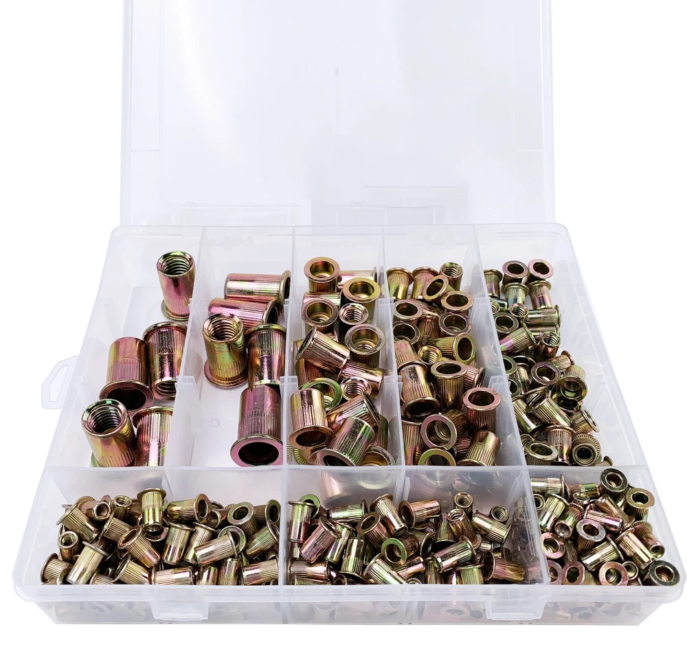 Rivet Nut Tool Kit, 320pcs SAE Rivet Nut Assortment Kit w Galvanized Carbon Steel Flat Head Threaded Insert Nuts, Sizes 5/32"-32UNC, 8-32UNC, 10-24UNC, 1/4"-20UNC, 5/16"-18UNC, 3/8"-16UNC, 1/2"-13UNC Bullet Point ▶ RIVET NUT SIZE: The Kit includes 7 size of rivet nut, includes: 80pcs-------5/32"-32UNC, 70pcs-------8-32UNC, 60pcs-------10-24UNC, 40pcs-------1/4"-20UNC, 30pcs-------5/16"-18UNC, 20pcs-------3/8"-16UNC, 20pcs-------1/2"-13UNC; total 320pcs. ▶ Head Type: Flat Head; Nuts have a work-hardened surface providing high-strength, load-bearing threads. ▶ WIDE APPLICATION: Our rivet nuts are used to provide firm and problem-free attachment for screws and bolts in home improvement and for a wide range of manufacturing including automobiles, aircraft, appliances, furniture, decoration, and more. ▶ DURABLE QUALITY: These rivet nuts boast superior strength and offer corrosion-free, rotation-resistant performance and acid resistant thanks to their precision threading and quality construction from galvanized carbon steel. You will no longer worry about them rusting and breaking when installing. ▶ THICKENE TOOL BOX: These nuts kit is lightweight, very convenient to carry. Meanwhile, the transparent storage box had been thickened, more durable and sturdy than others, enough to accommodate all items safely. Pictures Description 320pcs SAE Rivet Nut Assortment Kit w Galvanized Carbon Steel Flat Head Threaded Insert Nuts Application: Perfect for automotive, furniture, decoration and other electrical and industrial products It is suitable for processing thread lock nuts into thin materials, such as metal plates, plastics and glass fibers. High strength and hardness, easy to use, durable Easy to install and use Specifications Name: Rivet nut Material: Carbon steel, zinc plated Type: Flat head, Knurled body Package: Durable plastic box Warning: The product doesn’t suitable for children, please keep them away from kids. Package including 80pcs-------5/32"-32UNC, 70pcs-------8-32UNC, 60pcs-------10-24UNC, 40pcs-------1/4"-20UNC, 30pcs-------5/16"-18UNC, 20pcs-------3/8"-16UNC, 20pcs-------1/2"-13UNC, 1pc------- Storage Box Shipping and Payment Only PayPal accepted Your order will be shipped within 1-2 business days From Texas once we receive your payment. We do not ship on Sundays or public holidays Ship to PayPal confirmed address ONLY Return We stand behind our products. Items can be returned for exchange or full refund within 14 days from the date you receive your merchandise. For all cases, shipping and handling fee is not refundable and buyer is responsible for the return shipping cost. If it is a non-seller mistake case, a 20% restocking fee will be charged. Warranty and Feedback We guarantee you a five star shopping experience with us. If you are not satisfied with your purchase, please contact us. All faulty due to improper installation or improper use will NOT be covered by the warranty. Any physical damage will void your warranty too. Feedback will be left automatically when your item is shipped. We appreciate you leave 5 STAR of Detailed Seller Rating and POSITIVE Feedback for us upon receipt of your item. Warranty excludes normal product lifetime wear-out, wear and tear or abuse. Warranty does not apply to conditions resulting from misuse, abuse, negligence, accident, improper application, improper installation or alteration. If you encounter any problems about anything, please email us to allow us an opportunity to correct any problem and we will do our best to assist you solve the issue.