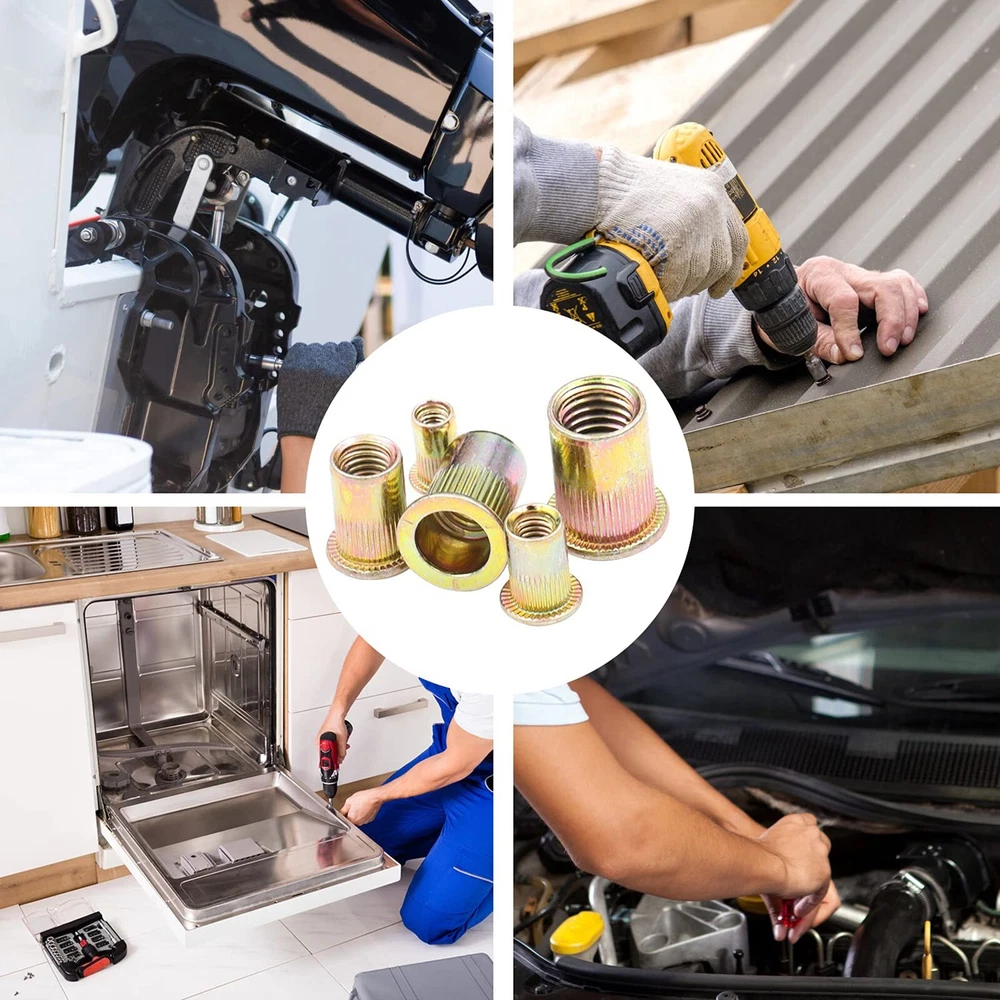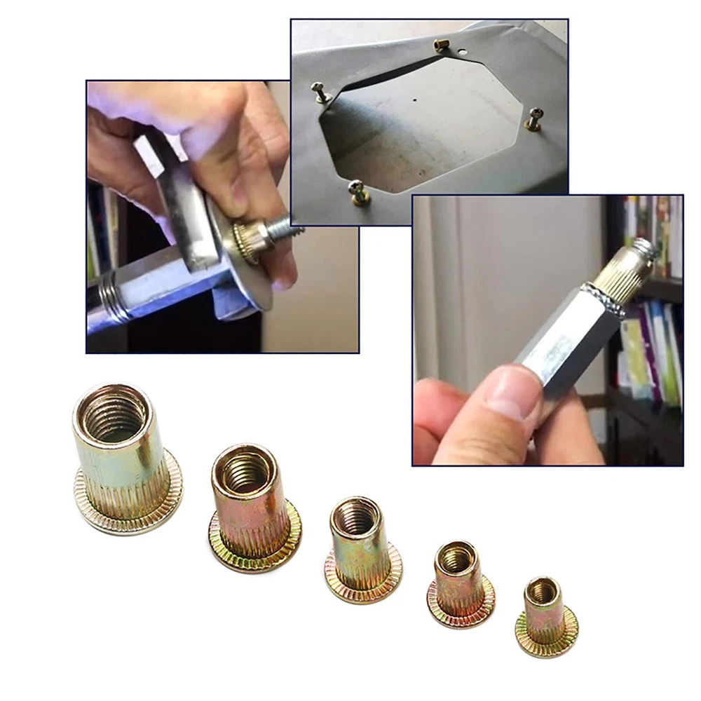Rivet Nut Kit, 320pcs Rivet Nut Assortment Kit w/ Galvanized Carbon Steel Flat Head Threaded Insert Nuts, Knurled Body with Case, for Rivet Nut Tool, Riveter, Rivnut Gun, SAE Sizes 5/32"-32UNC, 8-32UNC, 10-24UNC, 1/4"-20UNC, 5/16"-18UNC, 3/8"-16UNC, 1/2"-13UNC Bullet Point 【320pcs Metric RIVET NUT】 : In this set, we provide 7 size of rivet nut, includes: 80pcs-------5/32"-32UNC, 70pcs-------8-32UNC, 60pcs-------10-24UNC, 40pcs-------1/4"-20UNC, 30pcs-------5/16"-18UNC, 20pcs-------3/8"-16UNC, 20pcs-------1/2"-13UNC; total 320pcs. 【Feature】 : Head Type-Flat Head; Knurled body. Nuts have a work-hardened surface providing high-strength, load-bearing threads. 【DURABLE QUALITY】 : These rivet nuts boast superior strength and offer corrosion-free, rotation-resistant performance and acid resistant thanks to their precision threading and quality construction from galvanized carbon steel. You will no longer worry about them rusting and breaking when installing. 【WIDE APPLICATION】 : Our rivet nuts are used to provide firm and problem-free attachment for screws and bolts in home improvement and for a wide range of manufacturing including automobiles, aircraft, appliances, furniture, decoration, and more. Rust resistant and strength enough to apply in many kinds of heavy-duty materials including sheet metal, steel, aluminum, plastic, fiberglass etc. 【RUGGED BOX】 : These nuts kit is lightweight, very convenient to carry. Meanwhile, the transparent storage box had been thickened, more durable and sturdy than others, enough to accommodate all items safely. Pictures Description Premium Zinc Plated Carbon Steel Rivet Nuts, Gives You a 5 Stars Reliable Smart Fasteners Home Improvement Specifications Name: Rivet nut Material: Carbon steel, zinc plated. Type: Flat head, Knurled body. Size type: Metric size assorted in 5/32"-32UNC, 8-32UNC, 10-24UNC, 1/4"-20UNC, 5/16"-18UNC, 3/8"-16UNC, 1/2"-13UNC Thread---Drill Hole Size-----Head Dia.---------Head Height--------Total Length--------Grip Range 8-32UNC---------0.260’’----------------0.374’’---------------0.024’’---------------0.510’’ --------------0.02’’-0.08’’ 10-24UNC--------0.291’’----------------0.402’’--------------0.031’’---------------0.512’’---------------0.02-0.12’’ 1/4-20UNC-------0.356’’----------------0.500’’--------------0.039’’---------------0.61’’ ----------------0.04’’-0.14’’ 5/16-18UNC-----0.394’’----------------0.552’’--------------0.039’’----------------0.728’’---------------0.04’’-0.16’’ 3/8-16UNC-------0.472’’----------------0.675’’--------------0.039’’---------------0.728’’----------------0.04’’-0.16’’ Package Included (Total 320pcs Rivets) : 1 x Storage Case 80pcs x 5/32"-32, 70pcs x 8-32, 6 0pcs x 10-24, 40pcs x 1/4"-20, 30pcs x 5/16"-18, 20pcs x 3/8"-16, 20pcs x 1/2"-13 Brand: iMeshbean 100% High Quality. About US: iMeshbean is a registered trademark in the USA, Europe and China. We have proudly designed our own products and successfully created our own brands in the industries. In order to provide the peaceful shopping experience,our dedicated customer service teams can response to all the requests within 24 hours. All the returns and exchanges will be processed within 3 days.We honor 30 days' return on any products customers are not satisfied. Being our customer is a wise choice! Warranty If you have any questions you may reach us via ebay message. Get In Touch We warrant all products to be free from defects in material or workmanship for two month from date of purchase. We fully guarantee customers an exchange or refund within 14 business days of receipt if item DOA(damage on arrival). Warranty excludes normal product lifetime wear-out, wear and tear or abuse. Warranty does not apply to conditions resulting from misuse, abuse, negligence, accident, improper application, improper installation or alteration. For malfunction products under warranty period, please contact our customer service via EBay Message. Payment Only PayPal accepted. All orders delivered to California (CA) are charged the applicable sales tax. Shipment We only ship to paypal confirmed address. We will ship all orders asap. from California via USPS or UPS.( No service on Weekend and public holidays). Delivery time within the U.S. is usually just 3 to 5 business days, however in rare cases it could take 5 to 7 business days. No combined shipping discount offered and no pick-up service. Customer Service Customer Satisfaction is always our Top Priority. If you feel any dissatisfaction, please contact us via ebay message. A Merchandise Authorization Number (RMA#) is required for all need returned packages(After we have a fully communication). Please contact us to get an ""RMA"" number before you ship your items back to us. Items returned without an ""RMA"" number would be ignored or delayed in processing. back to us. Items returned without an ""RMA"" number would be ignored or delayed in processing.All NON-Seller Mistake returns for refund are subject to 20% re-stocking fee and buyer should pay for the return shipping fee and handle fee.(For example,you brought wrong item or cancelled order after item was shipped). All return products should be in brand new state with all accessories included. Refunds will be given via paypal only.