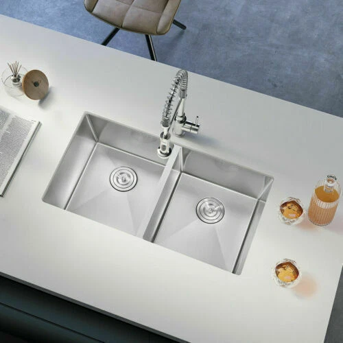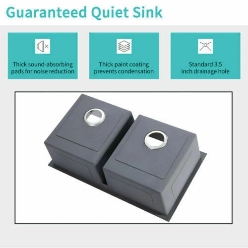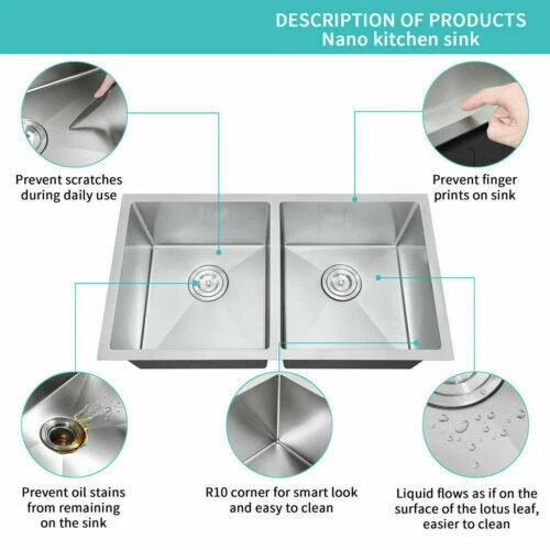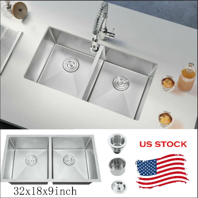 Product Description: The Nano Commercial grade brushed finish for easy to clean and long-lasting ,stainless steel with satin finish ensures that it is highly resistant to dirt and grime, easily wipes clean, and matches most kitchen appliances. Heavy duty sound guard undercoating and thick rubber padding to minimize noise and reduce condensation. Stainless steel basket strainer drain that traps goods waste and can be easily emptied into the trash. Not include Faucet. Features: 20 Gauge stainless steel thickness. 10mm radius corner for easy cleaning and modern look. Nano Commercial grade brushed finish for easy to clean and long-lasting. Heavy duty sound guard undercoating and thick rubber padding to minimize noise and reduce condensation. Slanted bottom with elegant drain grooves for easy water draining. USA standard 3.5'' drain opening will fit any garbage disposal unit. Drain placement – Rear drain placement ensures dishes don't settle on the drain. Product Dimensions: 32 x 18 x 9 inch Double Bowl Accessories: Strainer Cut-out template paper Installation mounting brackets hardware Package: Foam corner guard+7 layers stronger carton