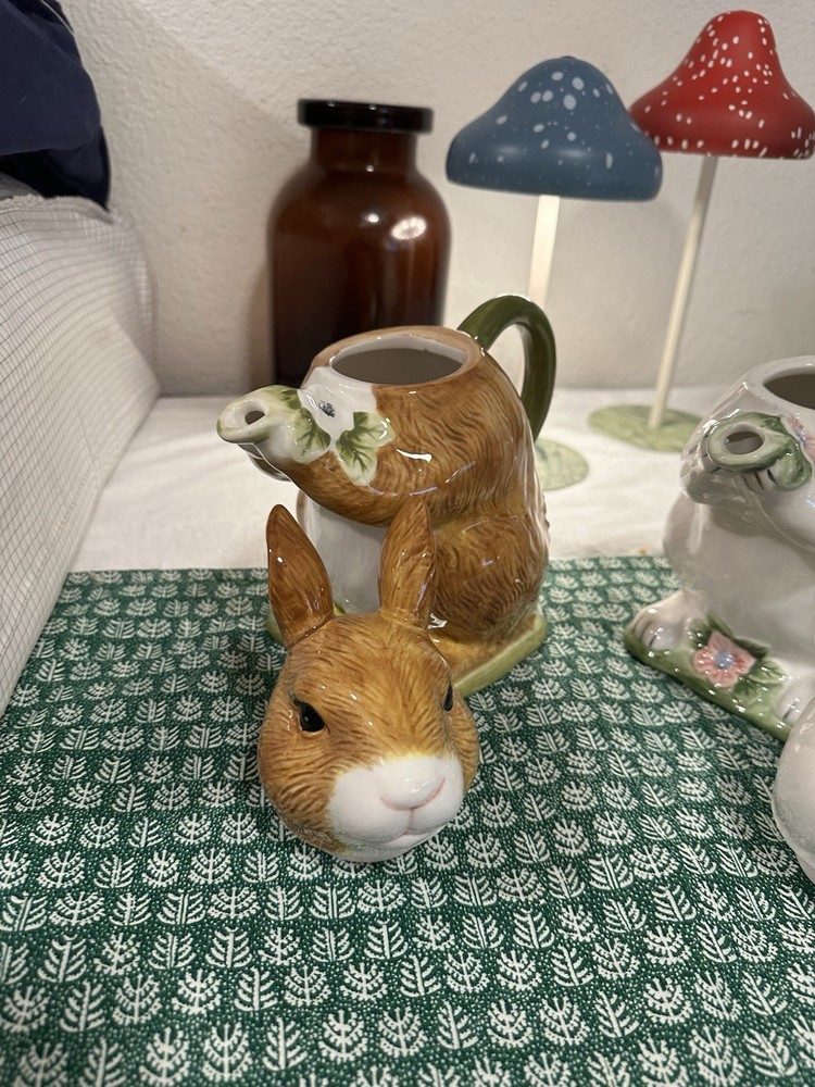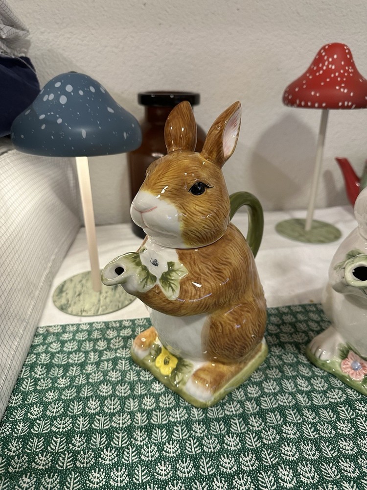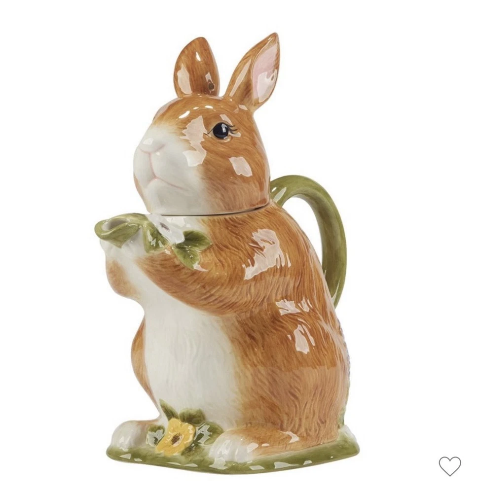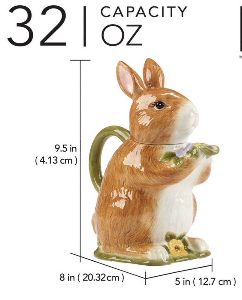 Whimsical 3-D Bunny Shape: The teapot is sculpted into a playful bunny holding a small sprig, complete with detailed fur and expressive features. Its 3-D design adds a fun and unique touch to your table, making it a perfect conversation starter for spring and Easter tea parties. • Generous 32oz Capacity: With a 32oz capacity, this teapot is perfect for serving multiple cups of tea, hot chocolate, or coffee, making it ideal for family gatherings or entertaining friends. It's large enough to accommodate several servings without needing frequent refills. • Hand-Painted Details: The teapot features intricate, hand-painted details, from the bunny's textured fur to the vibrant flowers at its base. The craftsmanship ensures that each teapot is a work of art, perfect for collectors and those who love unique serveware. • Durable Stoneware Construction: Made from high-quality stoneware, this teapot is built to last, providing both durability and beauty. It is designed to handle hot liquids while maintaining its lovely appearance, making it both functional and decorative. • Perfect for Spring and Easter: Whether you're using it for serving or displaying it as part of your seasonal decor, this teapot adds a delightful springtime charm to your home. Its cute and festive design makes it an ideal gift for tea lovers or Easter enthusiasts. Add a touch of whimsy to your tea time with the Easter Meadow 3-D Bunny Teapot. Shaped like an adorable bunny, this charming teapot is the perfect centerpiece for your springtime gatherings or Easter celebrations. With a 32 oz. capacity, it's ideal for serving tea or other hot beverages. The beautifully detailed hand-painted design brings the playful spirit of spring to your table, making it as delightful to display as it is to use. Whether you're hosting a tea party, or, enjoying a quiet moment, this bunny teapot will make every occasion feel special. Bring a smile to your guests' faces with the Easter Meadow 3-D Bunny Teapot, an adorable and functional addition to your springtime table settings. Its charming design and generous capacity make it perfect for both daily use and special occasions. Specifications Number of Pieces: 1 Dimensions (Overall): 9.5 Inches (H) x 5 Inches (W) Capacity (Volume): 32 Ounces Features Dining: Handles Used For: Hot or Cold Beverages Material: Earthenware