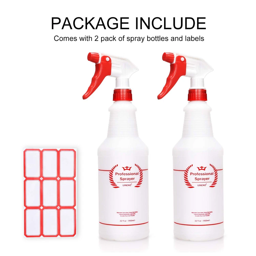 FOR YOU Plastic Spray Bottle 2 Pack, 32 Oz, All-Purpose Heavy Duty Spraying Bottles Leak Proof Mist Empty Water Sprayer for Cleaning Solution, Essential Oils, Hair, Planting, Pet with Adjustable Nozzle - Red FEATURES CHEMICAL RESISTANT - Our 32 ounce (about 950 ml) heavy duty spray bottles are made from HDPE plastic, recycle code # 2, which is chemically resistant, safe for chemical solutions. On the side of each bottle is a checklist to stay organized and remain informed as to what the bottle contains. (Comes with labels to meet your need) UPGRADED SPRAY HEAD & LEAK PROOF - Our professional sprayer features a long lasting polypropylene spray head, tight and secure cap closure, internal cap gasket, 302 stainless steel spring and a precision valve and piston for a no clog and no leak experience; A proven and reliable no leak venting system primes quickly and stays primed. ADJUSTABLE NOZZLE - From a fine mist to a solid stream, the sprayer can be easily adjusted to suit your needs. Be prepared to tackle any job with a simple twist of the nozzle! Avoid waste with our extra-long tube that'll spray every last drop out! HOUSEHOLD-COMMERCIAL-INDUSTRIAL USES - Our plastic spray bottles is for multi purpose uses, each bottle is BPA-free, use them for food spraying, cleaning solutions around the house, pet, cat, lawn and garden, misting and watering plants, succulents, herbs, ironing, laundry, car cleaning, janitorial. Make your own homemade diy cleaner mister or just use with water to cool yourself. BETTER TRIGGER DESIGN - The unique design 3-finger trigger makes your fingers rest easily on it and the bottle fit comfortably in your hand, eliminating hand fatigue; The ergonomic neck gives you a comfortable grip; Pull trigger has a short effortless squeeze reducing finger fatigue. Product Description This essential set of four, 32 oz spray bottles is fantastic for both home and commercial use. The adjustable spray nozzle coupled with the original 100% no-leak mechanism will set off your cleaning or gardening tasks to a perfect start. Buy economy sized liquid cleaning products in bulk for less and decant the contents into these trusty home use bottles. The 32 ounce capacity plastic bottle is perfect for all natural household looking to create their own cleaning recipes for a healthier home. Our professional spray bottles is extremely sturdy and comes with the following 5 unique features: Adjustable Nozzle 32 oz large Size Chemical Resistant Unique Design 3-Finger Trigger Measurements ADJUSTABLE NOZZLE Easily adjust between 3 trigger settings including mist, stream and off by simply turning the nozzle. BETTER TRIGGER The unique design 3-finger trigger makes your fingers rest easily on it and the bottle fit comfortably in your hand, eliminating hand fatigue. COMFORTABLE DESIGN The ergonomic neck gives you a comfortable grip; Pull trigger has a short effortless squeeze reducing finger fatigue. CHEMICAL RESISTANT Sturdy material makes sure that the bottle doesn’t deteriorate due to chemical exposure or harsh substances. DESIGN FOR COMFORTABLE WORKING 32oz great size, 3 finger sprayer for a better grip HOUSEHOLD/COMMERCIAL/INDUSTRIAL USES Our multi purpose spray bottles can be used for cleaning solutions, grooming, planting and more. PACKAGE INCLUDE 2 * Plastic Spray Bottles 1 * Label (with 9 labels) Note: If the liquid contains powder, it may cause the nozzle or the tube to become clogged, so it is recommended to shake the liquid fully evenly before use. Ensure the cap is screwed on tightly. The bottles are resistant to leaking, but it's best to avoid leaving them on their sides when not in use. Item model number UK950M2R Capacity 2 Pounds Color Red Product Dimensions 3.58 x 3.58 x 12.5 inches; 7.05 ounces Material High Density Polyethylene (HDPE) Country of Origin China Brand Uineko Manufacturer Uineko 3.58 inches x 3.58 inches x 12.5 inches. Weight: 7.05 oz PAYMENT We accept all payments via Ebay using Credit Cards , PAYPAL , Apple Pay and many others SHIPPING We are always working hard to ensure your package arrives as soon as possible. Please understand that some factors like weather, high postal traffic, and the performance of shipping companies are outside of our control. DELIVERY & RETURN POLICY We offer a 30-Day Return Policy on items in which you are not completely satisfied with. You have the option of a full-refund or an exchange of the item. No returns are available on items shipped outside of the USA.