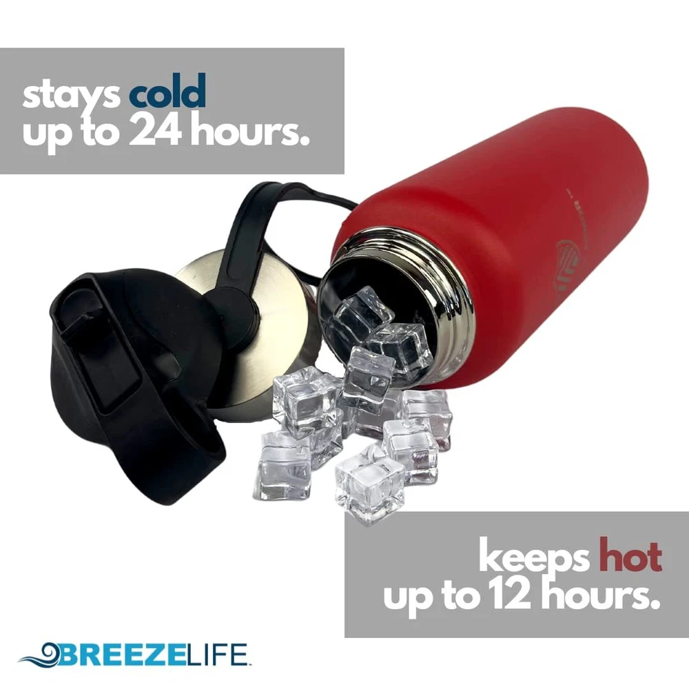 HYDRATION ON THE GO: Elevate your hydration game with our stainless steel water bottle. The perfect portable water bottle for keeping you hydrated on the go during your busy days or outdoor adventures. DOUBLE-WALL VACUUM INSULATION: Experience the magic of double-wall vacuum insulation, this insulated water bottle keeps your drinks refreshingly cold for up to 24 hours or piping hot for up to 12 hours. Enjoy your beverages at the perfect temperature. PRO-GRADE STAINLESS STEEL: Crafted with 18/8 pro-grade stainless steel, the metal water bottle guarantees pure taste and exceptional durability. The powder-coating provides an anti-scratch and non-slip surface, providing a resilient exterior for daily use. 100% BPA-FREE: Experience peace of mind with our stainless steel BPA free water bottle that’s 100% BPA-free and Phthalate-free. Sip with confidence, knowing your drink will maintain its original flavor, sip after sip. 2-PACK BOTTLE SET: Our 32oz water bottle pack includes a Blue and Red large water bottle with straw lid. The bottles come with a standard wide mouth lid that allows for easy filling and cleaning.