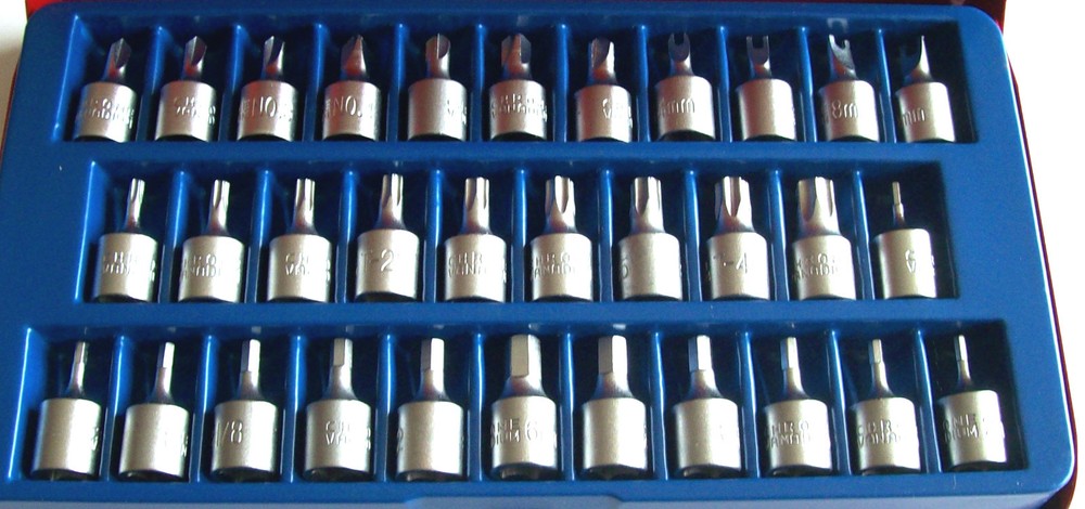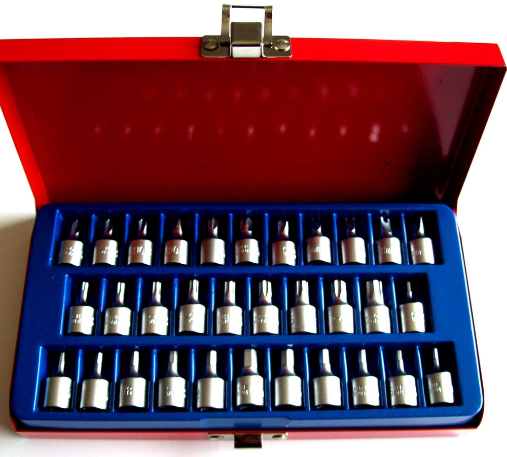 BRAND NEW 32pc TAMPER PROOF SECURITY SOCKET SET 1/4" Drive Sockets Include: 4 Tri-Wing Bits #1 #2 #3 #4 3 Torq Set 6, 8, 10mm 4 Spanners 4, 6, 8, 10mm 9 Torx Tamper T10 T15 T20 T25 T27 T30 T35 T40 T45 12pc Hex tamper 2, 2.5, 3, 4, 5, 6,mm 5/64" 3/32" 7/64" 1/8" 9/64" 5/32" Made By NEIKO TOOLS U.S.A. Thanks For Looking