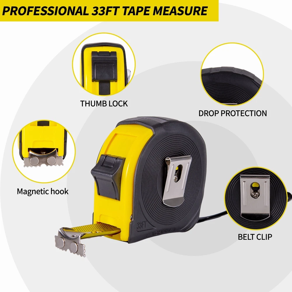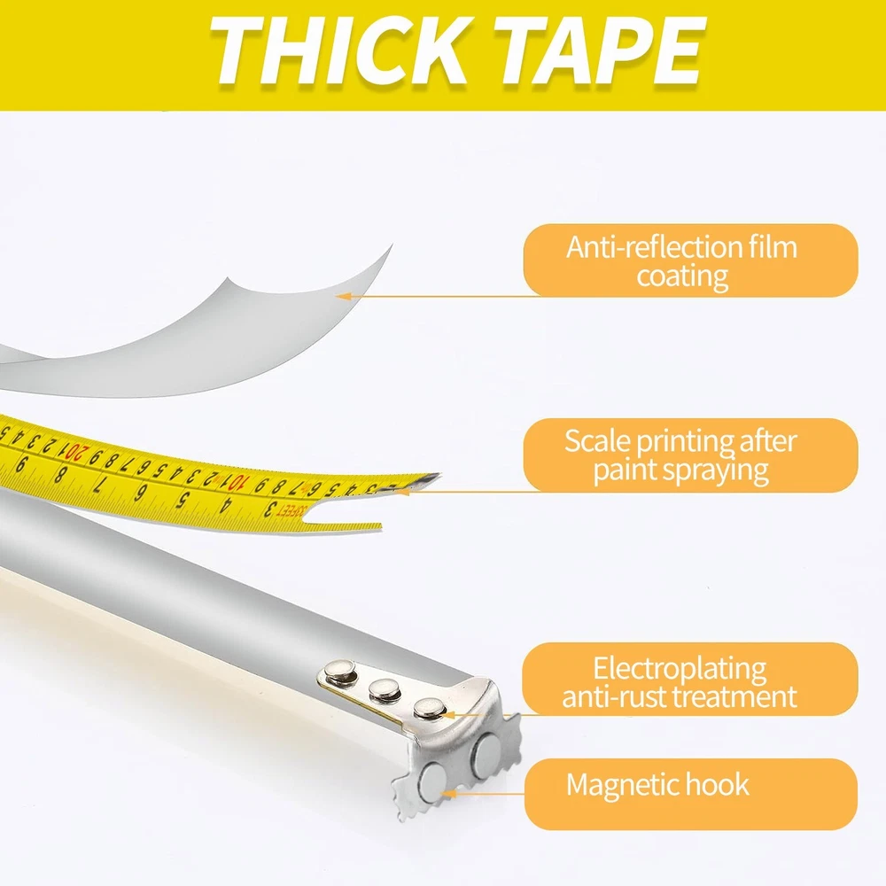 Features: EXCELLENT MATERIAL: The engineer tape measure is made of high quality thickened carbon steel and wrapped with nylon coated for maximum durability. It's stiff enough to feed out 7 ft easily without bending. LOCKING MECHANISM: Secure sliding Thumb lock makes locking a natural movement. The retractable tape measure slides up and down to releases and locks with ease , which is a style of locking that very reliable. ZERO POINT CORRECTION HOOK: Sliding hooks are used for precise inside and outside measurement, so measurement uncertainty can be tightly controlled. The magnetic claw can move back itself to deduct its own thickness when conducting inside measurement. Package Included: 1Pcs