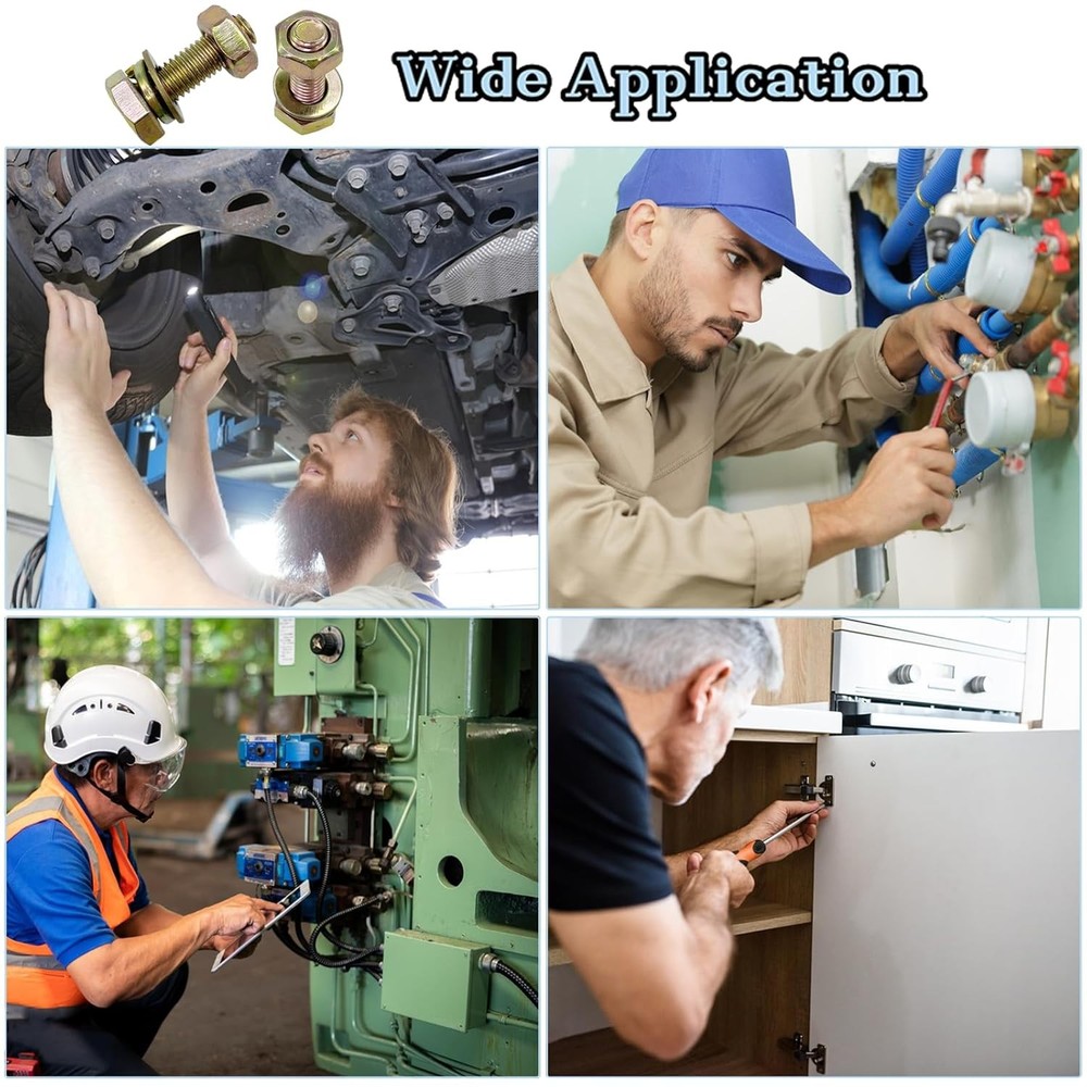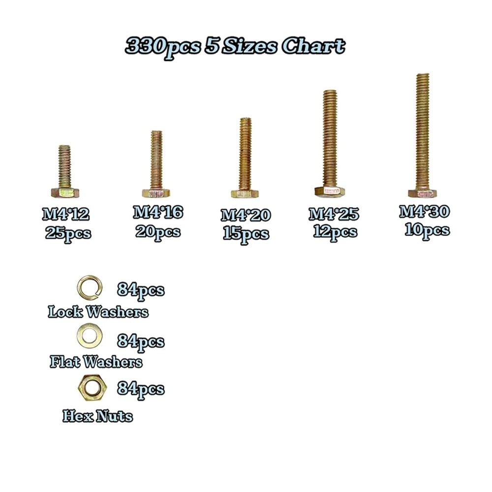 330pcs Metric Bolt Assortment Sets, M4 Nuts and M4, M5, M6, M8, M10, Gold Product Details Product Dimensions : 0.12 x 0.12 x 0.12 inches; 10.86 ounces Manufacturer : HIQTRADEBYJJ Size: M4, M5, M6, M8, M10 Color: Gold Material: Alloy Steel Brand: HIQTRADEBYJJ Item dimensions L x W x H: 0.12 x 0.12 x 0.12 inches Metric bolt assortment, 5 sizes of bolt screws, M4 × 12/16/20/25/30mm to provide you with various sizes of bolts and lock washers and flat washers, suitable for a variety of occasions, meet your different needs. Bolt kits are widely used in machinery, automobiles, motorcycles, construction projects, electronics, 3D printing equipment, communication equipment, power facilities, electronic products, ship assembly, furniture repairs, garage repairs, professional electricians, plumbers, builders, DIY and more. Nut and bolt sets are made of 8.8 grade high quality alloy steel, which has excellent rust, oxidation and corrosion resistance and is not easy to break, so it can be used for a long time in any environment. The nuts and bolts are 5 sizes of screws, choose what you need. Metric bolt kit does not skid easily, uniform pitch, obvious thread, prevent parts from loosening, the design has good vibration resistance.