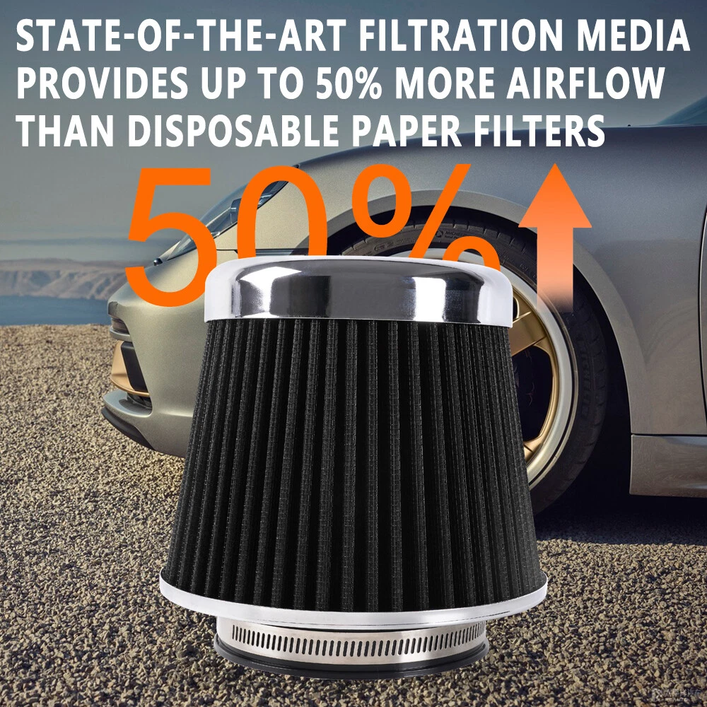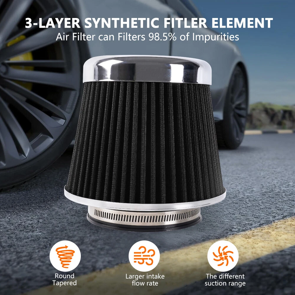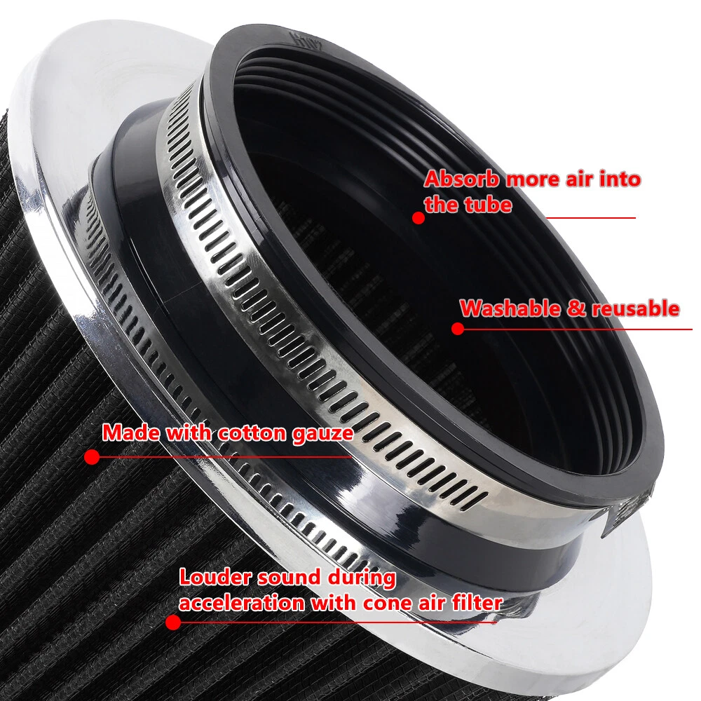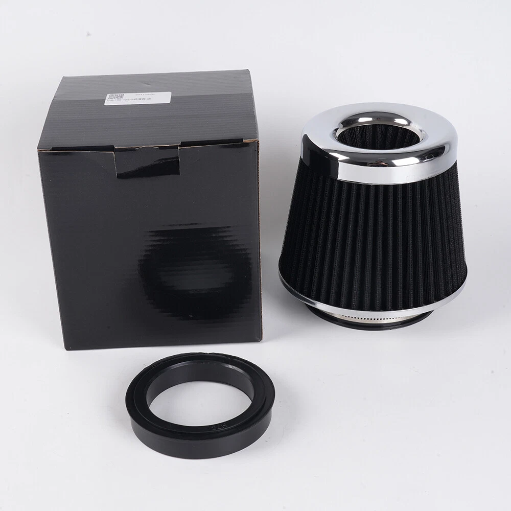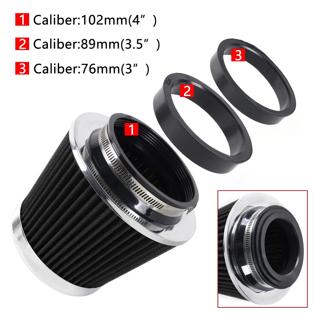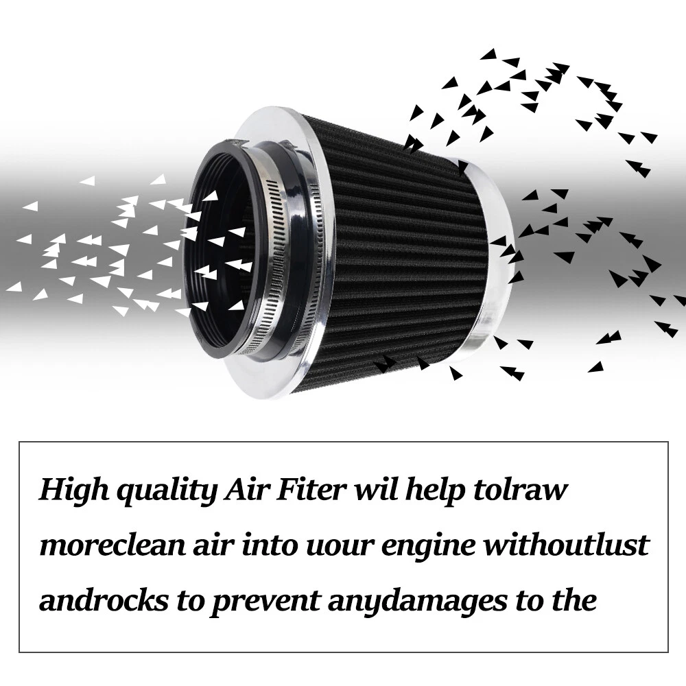 3"/3.5"/4" High Flow Inlet Dry Air Filter Cold Air Intake Cone Replacement Black SPECIFICATIONS: Type: Air Filter Material: Non-woven Fabric + Rubber + Metal Air Filter Type: Dry Air Filter Style: Round Tapered Air Filter Length (in.): 5" Air Filter Bottom Measurement: 6" Inlet Flange Inside Diameter (in.): Caliber:102mm(4")/ Caliber:89mm(3.5")/ Caliber:76mm(3") FEATURES: 100% Brand New and Never Used or Installed Increase horsepower, torque and improve the gas mileage. It universally fit for any 3inch/3.5inch/4inch air intake hose. The high flow air filter help engine to draw more cooler air resulting in betterthrottle response & higher explosive horsepower output. It comes with a washable and reusable cone air filter and a clamp. Filter consisted of 2 layers to double the filtration efficiency. [How often should air intake filter be replaced?] It should be inspected once a year or every 15,000 to 30,000 miles, but this can varybased on the car and driving environment. If you often drive through dusty terrain oron unpaved roads, you may need to change it more frequently. PACKAGE INCLUDE: 1 × Air Filter 1 × Clamp 2 × Rubber Ring Adapters All accessories in the picture are included. SHIPPING INFORMATION PAYMENT WARRANTY ABOUT US CONTACT US SHIPPING INFORMATION We will only ship this item to buyers by Normal Mail, please confirm your address is correct, and if you want to change the delivery address, just feel free to contact us when you purchase. Usually, we will ship the orders out and upload the tracking number within 1-2 business days(Monday to Saturday from 8:30am-5:30pm) after you complete the payment. PAYMENT We will only accept eBay payment. Please pay using eBay payment ONLY within 7 days from the date of transaction be made. WARRANTY Please inspect your order upon receipt.No damage claims will be honored after 14 days of delivery. All item we sold come with 90 days defective warranty from the date. ABOUT US We are a powerful factory producing auto parts,and we have a professional sales and after-sales team that can provide you with excellent products and services. CONTACT US For any reason you want to contact us,We aim at satisfying every visitor, no matter what kind of situation you meet with, we will be right here to serve you. Please contact our team. If you are happy with the transaction with us, leaving us an ALL-5-STAR positive feedback would be greatly appreciated. Have a good shopping.