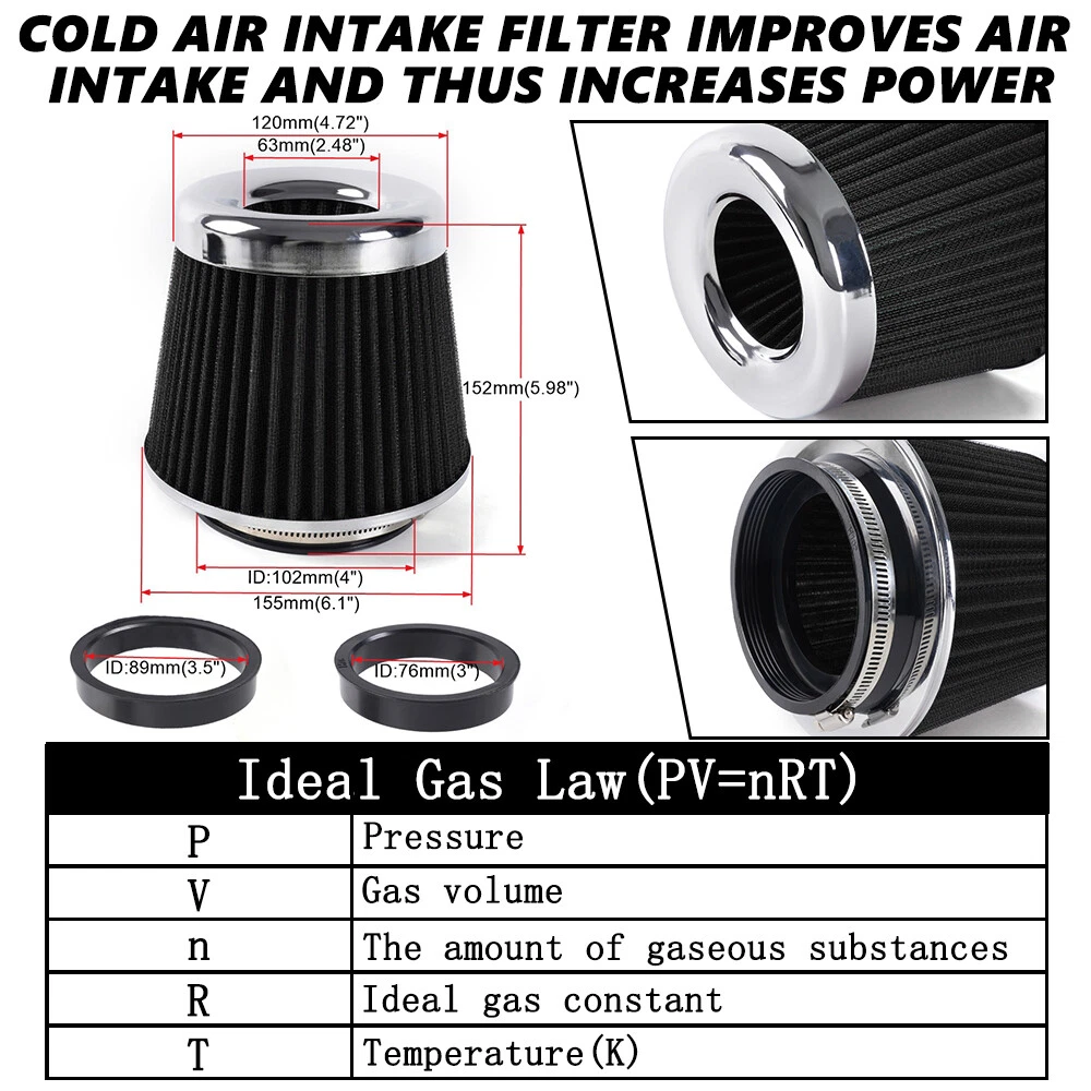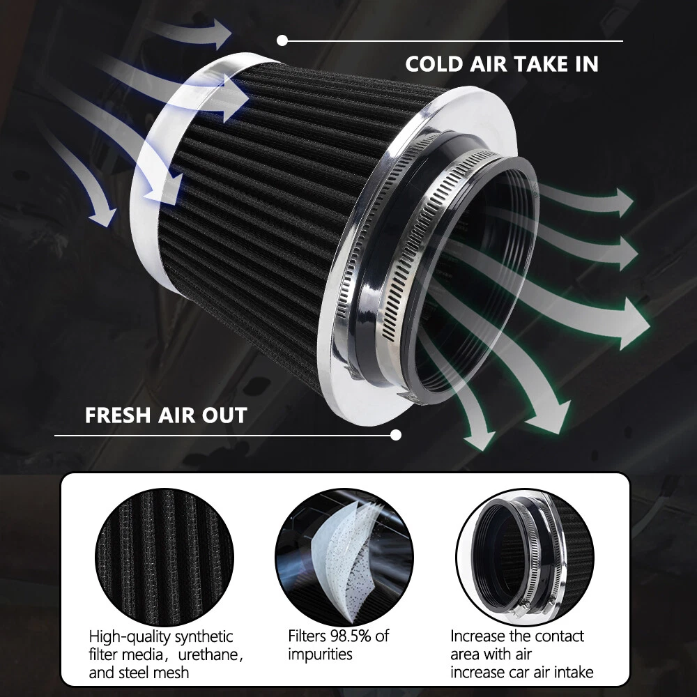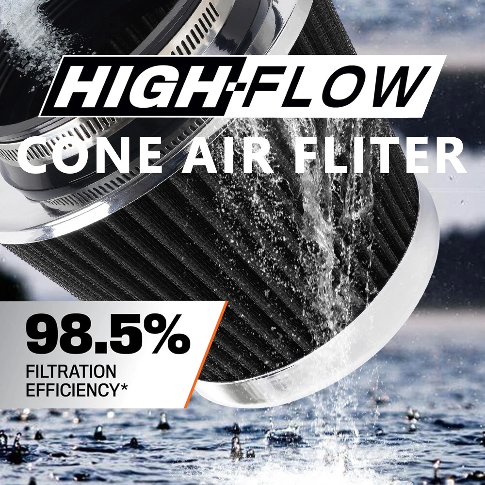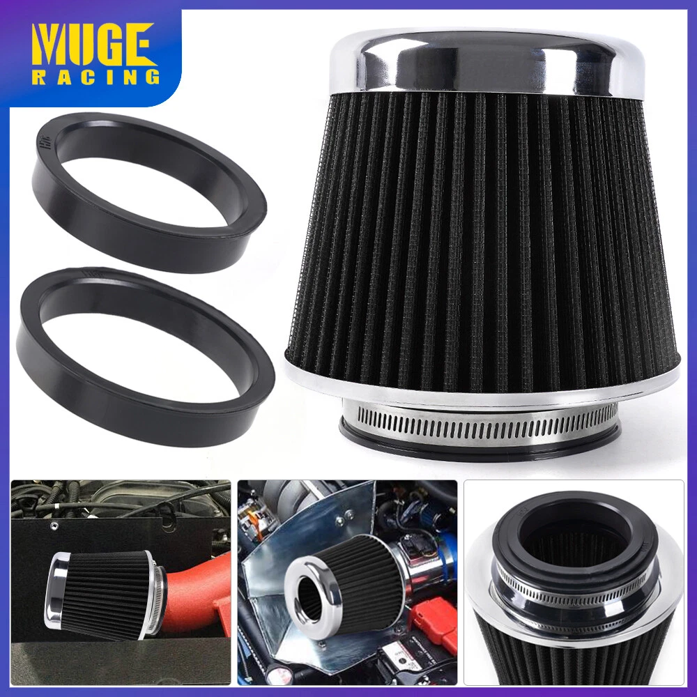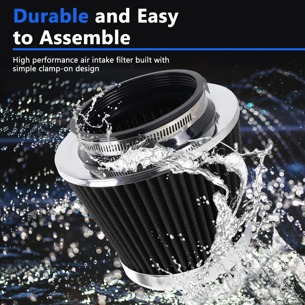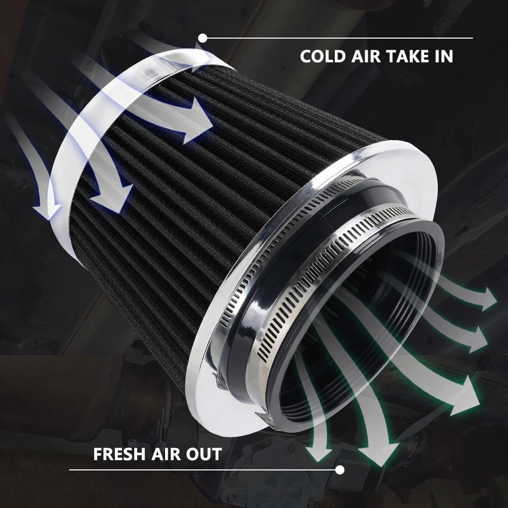3"/3.5"/4" High Flow Inlet Dry Air Filter Cold Air Intake Cone Replacement Black SPECIFICATIONS: Type: Air Filter Material: Non-woven Fabric + Rubber + Metal Air Filter Type: Dry Air Filter Style: Round Tapered Air Filter Length (in.): 5" Air Filter Bottom Measurement: 6" Inlet Flange Inside Diameter (in.): Caliber:102mm(4")/ Caliber:89mm(3.5")/ Caliber:76mm(3") FEATURES: 100% Brand New and Never Used or Installed Increase horsepower, torque and improve the gas mileage. It universally fit for any 3inch/3.5inch/4inch air intake hose. The high flow air filter help engine to draw more cooler air resulting in betterthrottle response & higher explosive horsepower output. It comes with a washable and reusable cone air filter and a clamp. Filter consisted of 2 layers to double the filtration efficiency. [How often should air intake filter be replaced?] It should be inspected once a year or every 15,000 to 30,000 miles, but this can varybased on the car and driving environment. If you often drive through dusty terrain oron unpaved roads, you may need to change it more frequently. PACKAGE INCLUDE: 1 × Air Filter 1 × Clamp 2 × Rubber Ring Adapters All accessories in the picture are included. SHIPPING INFORMATION PAYMENT WARRANTY ABOUT US CONTACT US SHIPPING INFORMATION We will only ship this item to buyers by Normal Mail, please confirm your address is correct, and if you want to change the delivery address, just feel free to contact us when you purchase. Usually, we will ship the orders out and upload the tracking number within 1-2 business days(Monday to Saturday from 8:30am-5:30pm) after you complete the payment. PAYMENT We will only accept eBay payment. Please pay using eBay payment ONLY within 7 days from the date of transaction be made. WARRANTY Please inspect your order upon receipt.No damage claims will be honored after 14 days of delivery. All item we sold come with 90 days defective warranty from the date. ABOUT US We are a powerful factory producing auto parts,and we have a professional sales and after-sales team that can provide you with excellent products and services. CONTACT US For any reason you want to contact us,We aim at satisfying every visitor, no matter what kind of situation you meet with, we will be right here to serve you. Please contact our team. If you are happy with the transaction with us, leaving us an ALL-5-STAR positive feedback would be greatly appreciated. Have a good shopping.