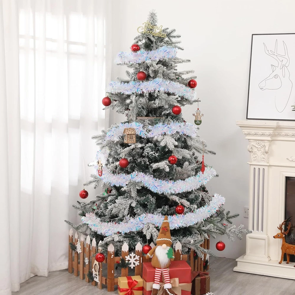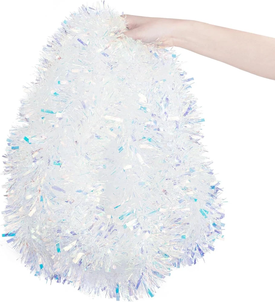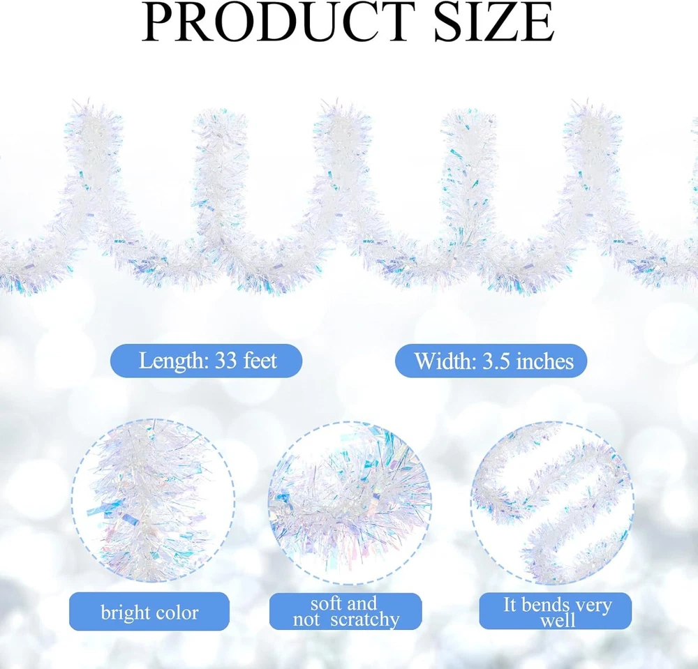 33FT Christmas Tinsel Garland Iridescent Metallic White, White Product Details Shape: Runner Manufacturer: Gloreyan Package Dimensions: 7.64 x 4.25 x 4.17 inches Item Weight: 7.4 ounces Country of Origin: China Item model number: 01 Brand: Gloreyan Color: White Material: Plastic Item Length: 393.7 Inches Is Artificial Garland: Yes Size Information: The Christmas tinsel garlands measures approx. 33 feet/10 meters in length and 3.5 inch/9 cm in width.Very dense and thick ,and sufficient length to meet your daily and holiday use. Material: The Iridescent Christmas garland is made of premium PVC material, durable and no easy to break, lightweight and reusable. Premium Material make it look thicker than usual.High quality foil material makes them glitter and bright. Perfect for Christmas Valentine's Day, New Years and parties,etc. Easy to Use: The Christmas tinsel garland can be cut in a suitable length what you want, and you can hang them on door, window, fence, banister, counter tops, railing and mantle, etc. Exquisite Design: These white hanging garland is designed with bright foil which make the hanging garland look glitter and sparkling in light. Exquisite design, bring interesting and romantic holiday atmosphere to your party. Wide Application: The pink tinsel garland is suitable for Christmas, Halloween, wedding, new year,Valentine's Day, parties and more;perfect for decorating home, gardens, bushes, flowers, Christmas tree, walls, hedges, banisters, doorways, windows, posts, tables, counter tops, railing,mantle,etc. Gloreyan 33FT Christmas Tinsel Garland for Christmas Tree Decorations Wedding Birthday Party Supplies Specifications: Material: Pvc material and wire inside Color: Iridescent White Length: 33Ft/10M Width: 3.5in/9cm Feature: bright Foil design; can be cut into any length Widly Used:Perfect for Christmas,New Year,Valentine‘s day,wedding and so on.