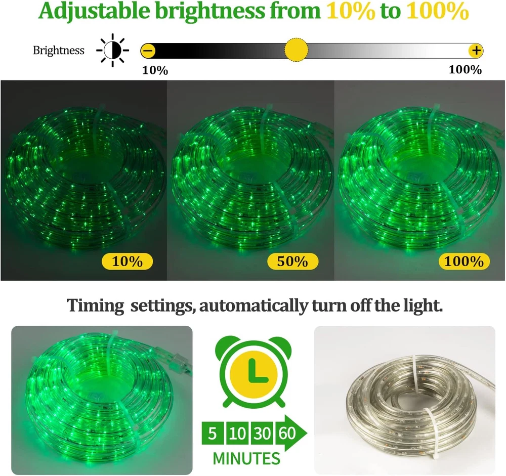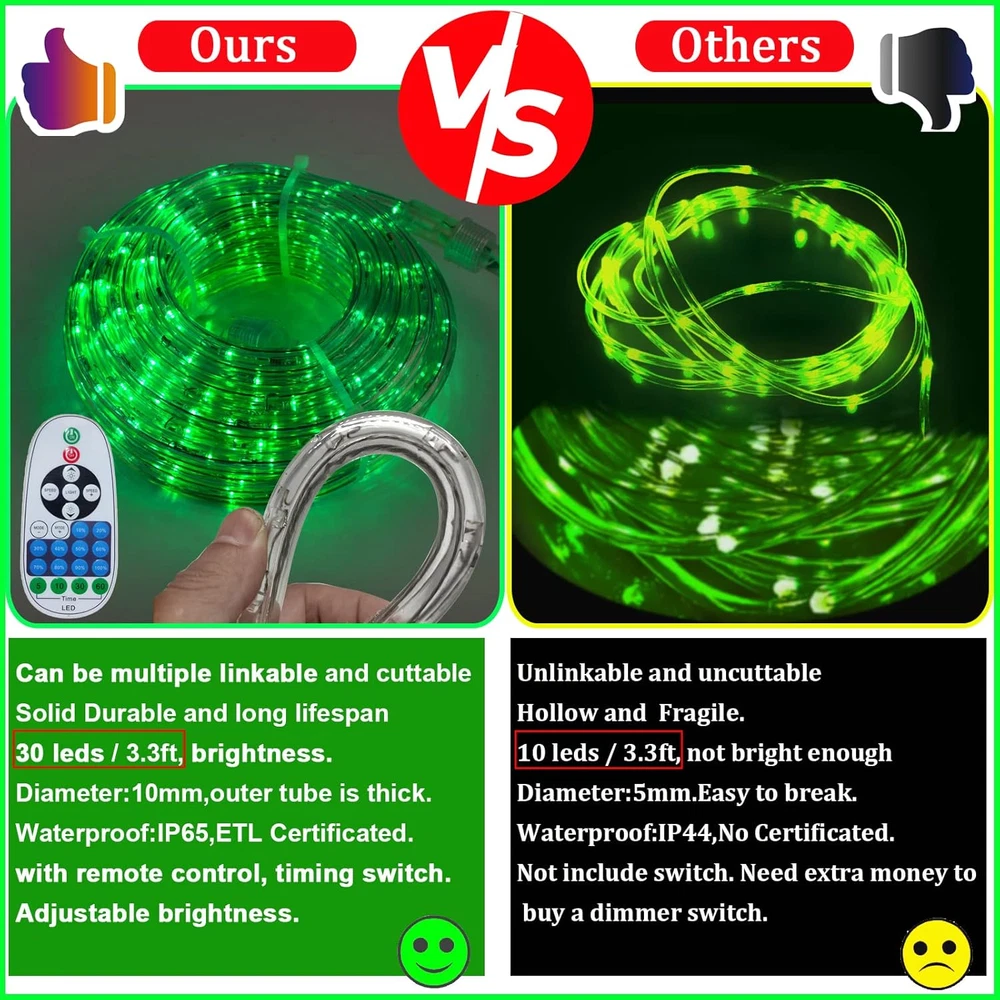 Store New Arrivals Add to Favorite View Feedback Contact Fast deliveries to the customer's home Quality customer service John Make the customers happy! 33FT Rope Lights Outdoor with Remote,Cuttable Connectable, 300Leds Strip Lights with Adjustable Brightness Waterproof with Plug for Patio,Christmas Decoration. (Green) Description 🌟Flexible and Connectable Design: Our LED rope lights are crafted with a high-quality clean tube that ensures the safety of the fairy lights and allows effortless bending into various shapes, enabling easy recycling for future use. The end-to-end connectable feature enables you to connect up to 3 sets, resulting in an impressive total length of 300ft. With this extensive coverage, you have the freedom to fulfill all your creative lighting decor needs. 🌟8 Modes & Safe Operation: Experience a diverse range of lighting options with 8 different modes, including Combination, In waves, Sequential, Slo-glo, Chasing Flash, Slow fade, Twinkle Flash, and Steady on. Conveniently switch between modes using the plug's button to create the perfect ambiance for any occasion. Safety is our priority, as evidenced by the two built-in fuses in the power plug, providing short circuit protection, making these lights highly reliable and reassuring. 🌟Auto Timer & Memory Function: Embrace energy efficiency and convenience with the rope lights timer function. Set them to stay on for 5 - 60 minutes and automatically turns off, saving energy and your time. 🌟Durable and Waterproof Construction: Designed for outdoor use, our LED rope lights are encased in a transparent and thick round PVC tube, ensuring 360 full illuminating and strong resistance to heat. This durable construction allows the lights to withstand various weather conditions with ease. With an IP65 waterproof rating, they are suitable for both indoor and outdoor decorations. 🌟Versatile Usage: Our LED rope lights are not only perfect for enhancing Christmas decorations, party decor, and weddings but also ideal for daily and holiday use. Illuminate cabinets, bedrooms, ceilings, walls, and utilize them as captivating background lighting. Create a delightful holiday atmosphere in your daily life by wrapping them along the pool deck, awning, or any desired location. Product Description This 33FT Remote control Led Rope Lights comes from BEATINEON company in Ca,US.tube is made of clear PVC,Internal all copper wire.Rope lights have a diameter of 2/5in and 9 LEDs/Foot.Total 300Leds.360degrees of light,with infrared remote control,from 5-60 minutes timer on/off function.It can be connected,cuttable,IP65 waterproof.ETL certification,safety and Lifespan more than 50,000H. is ideal for Xmas,Easter,Halloween,Independence day,parties,pool,weddings,outdoor events etc. This led string lights comes with an infrared remote control for ease of use. Pointing to the controller within 16.5FT range, you can easily control the on/off of your Tube Lights. quick setting to 10%-100% deck lights brightness. Set the light off time from 5-60 minutes. There are 8 modes to change the rhythm of the rope lights.These settings will be remembered by the chip when the lights are turned off. No need to repeat the settings, smart, convenient. This rope light can be cut. 3.3FT has a cut mark. Please note. Under 66FT the tube light is not supplied Free accessories for use after cutting.We supply the applicable accessories for sale, please purchase them yourself. (ASIN:B0BN7PT34Z) With remote control/Timing Off this led string lights comes with an infrared remote control for ease of use. Pointing to the controller within 16.5FT range, you can easily control the on/off of your Tube Lights. quick setting to 10%-100% deck lights brightness. Set the light off time from 5-60 minutes. There are 8 modes to change the rhythm of the rope lights.These settings will be remembered by the chip when the lights are turned off. No need to repeat the settings, smart, convenient. waterproof/energy efficient This patio lights outdoor waterproof and very energy efficient, have a diameter of 2/5in and 9 LEDs/Foot.Total 300Leds.with only 0.55 watts per foot, The whole lights is only 17 watts.but the light is very brighting.suitable for many occasions.Rope lights can be used as a decorative atmosphere for Christmas, parties, weddings. Also perfect for daily use. illuminate your anywhere you want to decorate. cuttable/linkable more This outdoor led rope lights it Can be cuttable.3.3FT/each with cuttable markings.If you purchase more led rope lights, you can easily link them together. Up to 330FT can be linked. Note: Free Accessories for cutting and then linking are not provided below 66FT.You need to purchase the attachment for cutting the connection by yourself. if you cut multiple times, you need to buy More additional accessories (ASIN:B0BN7PT34Z) Very Bright but energy efficient The whole lights is only 17 watts This outdoor patio lights Very bright, with only 0.55 watts/foot, 9 LEDs/Foot.Total 300Leds. Want to change the brightness of the light at certain times? Yes. Our light strings ensure that they can provide sufficient brightness. We also consider that some customers need to use a lower brightness at some times.Buy our string lights. There is no need to spend extra money buying a dimmer. Our dimming function is included as standard.And we supply dimming from 10% to 100%. Package included: 1×33ft Rope Lights with plug and Remote control(Batteries not included). 20PCS*fixing clips. 40×M2.5*10 Screws. 20×Plastic Ties. Accessories for cutting are not included, please purchase your own (ASIN:B0BN7PT34Z). Suitable for multiple space, indoor or outdoor Waterproof, anti-glare clear tube light. Whether in the yard, pool, outdoor party, wrapped around the stairs or placed above the ceiling in the kitchen, living room.It will all help to Creating a positive atmosphere Beatineon is a brand of luxurious lighting products, wedding decoration, and home decoration lighting in Cali