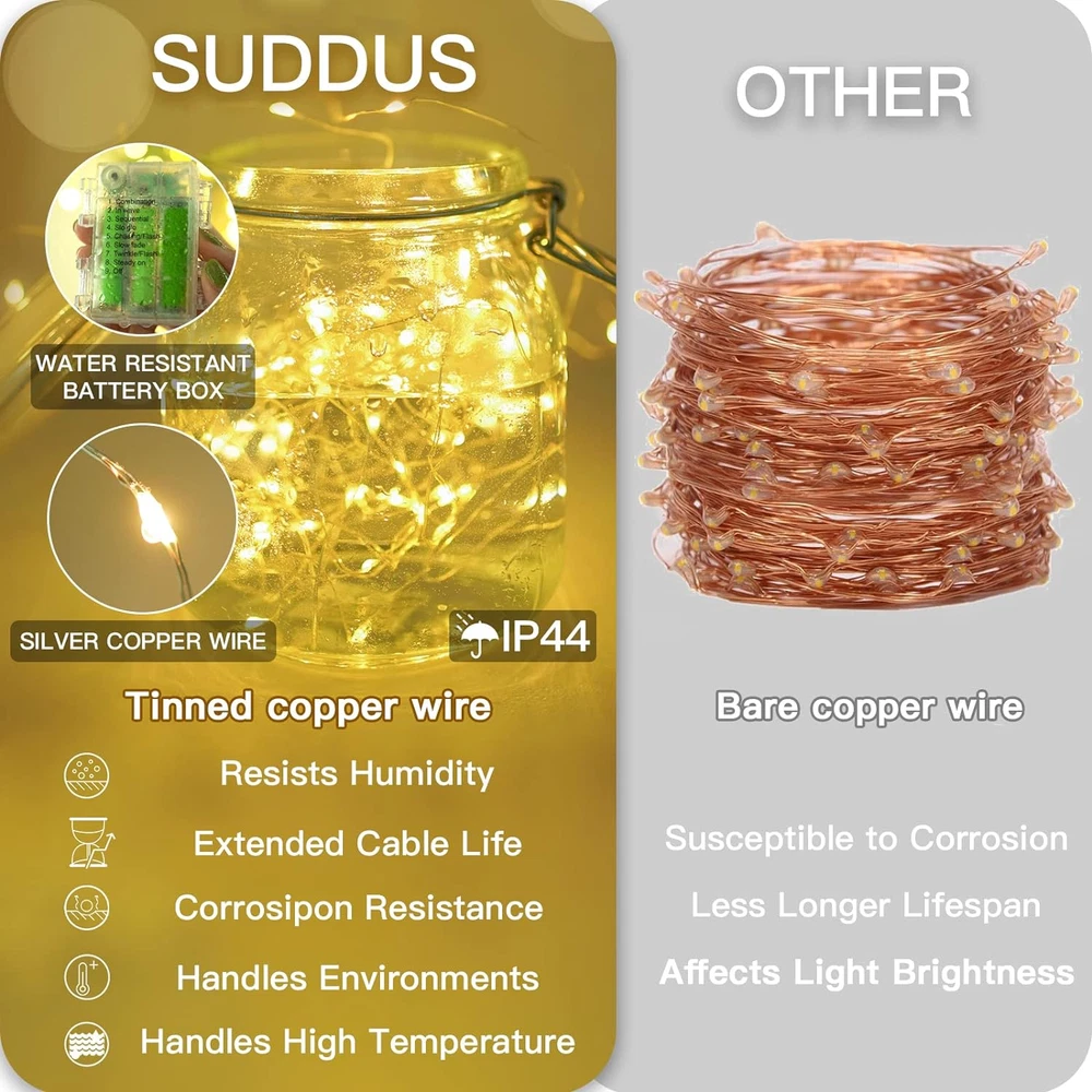 Store New Arrivals Add to Favorite View Feedback Contact 33Ft 100 LED Outdoor String Lights, Warm White Fairy Lights Battery Operated with Remote, Led Twinkle Lights for Bedroom, Dorm, Backyard, Wedding, Tree, Mason Jar, Wall, Christmas Description Light Source Type LED Style Traditional Number of Items 1 Power Source Battery Powered Number of Light Sources 100 Control Method Remote Theme Wedding Batteries Included? No Controller Type Remote Control Batteries Required? No Product Dimensions 3.94 x 2.76 x 1.97 inches Material Copper Seasons winter Number of Batteries 3 AA batteries required. Is Discontinued By Manufacturer No Included Components Remote Control Item Package Quantity 1 Item dimensions L x W x H 3.94 x 2.76 x 1.97 inches Indoor/Outdoor Usage Outdoor, Indoor Light Color Warm White Water Resistance Level Waterproof Item Weight 2.89 ounces Occasion Christmas, Wedding, Bedroom Special Features Waterproof, Timer, Remote Controlled, Dimmable, Adjustable, Twinkling Special Feature Waterproof, Timer, Remote Controlled, Dimmable, Adjustable, Twinkling Color Temperature 2700 Kelvin Color Warm White Wattage 3 watts Batteries 3 AA batteries required. Luminous Flux 7 Lumen Size 33 feet WATERPROOF FAIRY LIGHTS: These decorative Christmas lights can keep flashing and shining during wet weather. The IP44 waterproofed battery box can against wet under splashing water at any angle. REMOTE CONTROL FAIRY LIGHTS: This multifunctional warm string lights are super convenient, and enables us to switch eight flashing modes, and adjust the brightness quickly. Additionally, the timer function allows us to set up on/off time for 6hrs on, 18hrs off. The twinkle lights will turn on automatically by settings, helping us to create a magic light show in the future. FLEXIBLE & SAFE WIRE LIGHTS: This durable Led fairy light line is made of pure copper material. It can easily conform to any shape. We can bend the copper wire over a thousand times, and it will not break. Try to wrap string lights to anything you like. 66ft fairy lights are enough for any indoor and outdoor décor. Moreover, twinkle lights with remote are low heat emission, and safe to touch. ULTRA-BRIGHTNESS: Pixie lights glow bright warm color. Compare to traditional fairy light, Suddus’s warm lights have durable copper wires and brighter led bulbs. These fairy lights with remote allow you to have ten adjustable brightness levels, giving you a different lighting experience. Use it when you have different needs. The dimmable light setting gives you romance feeling. The super bright light setting will add the most twinkling to the Christmas tree. PORTABLE FAIRY LIGHT: This twinkle lights battery operated are portable—no more worries when there is no socket or power outage. This outdoor waterproof fairy light can make the most sparkling light show during Christmas. EXTRA-LONG FAIRY LIGHTS: Trust me! Multiple sets help you create the most sparkle house, you will need more compared to one. The 100 led fairy lights are 33ft (10m) long and the 200 led fairy lights are 66ft (20m) long. If you are looking for outdoor lighting that can easily cover large-scale scenes such as a fence, patio, backyard, garden, house, roof, pathway, terrace handrail, etc. You should choose SUDDUS long fairy lights! 12 MONTH : We pursue to provide customers with 100% satisfactory products and services. Your support gives us continuous motivation. If you have any questions about the product, please do not hesitate to . We will be 24/7 hours for you. TIPS: Pay attention to protecting children from tangling when they are close to the fairy lights. Product Description Ultra-brightness and Long-lasting life SUDDUS copper string light has ultra brightness since it comes with strong copper wires. The bulb life is much longer than the normal one. Waterproof and Outdoor use Our LED copper string lights have passed the IP44 test, which means they can stay on under light rain. There is a rubber strip placed on the battery box to prevent water from getting into the box. Flexible and Portable The excellent flexibility of copper string lights can make them more decorative. The led string light is designed especially for home decoration, holidays, and any other special occasion. Wireless Remote Control Our remote controller has 8 different lighting set options, adjustable brightness, and 6 hours timer. The remote-control system helps copper string light do its best within a range of 55ft. Safety This battery-operated fairy light is low heat emission. No risk of overheating. It is 100% safe to touch. An Excellent Choice for Gift Copper String Light Package Includes: 1x Gift box with best wishes 1x Silver fairy lights with winding card 1x Remote control SUDDUS is a LED string light company. We are committed to creating high-quality decorated lights and providing warm service for customers. SUDDUS is always committed to innovation. Behind each string light, there is a unique story. Each of our string lights represents a festival, which makes it more charming and attractive. Sharing these delicate string lights with you is our original intention. It is a love and warm transmission. We will be here for you 24/7. Using Tips for Fairy Lights Warmly Note: 1.Please find the beginning of the light first and unwind along the light line slowly. 2.Don't pull hard on the string light in case it breaks and tangles. 3.Don't mix different brands of batteries or mix new and old batteries together. 4.Ensure that no opaque obstacles exist between the remote and battery box when use the remote. 5.Check if the batteries are damaged or leaked before installing. 6.If the remote doesn't work, please try to change the battery (cr2025) of the remote. SUDDUS cares about every customer's feelings. If you have any questions, please do not hesitate to let us know. Application Scenarios Every Day Is a Festival On every special day, the fairy lights can create a very sparkling lighting effect for you. Great DIY Idea 
